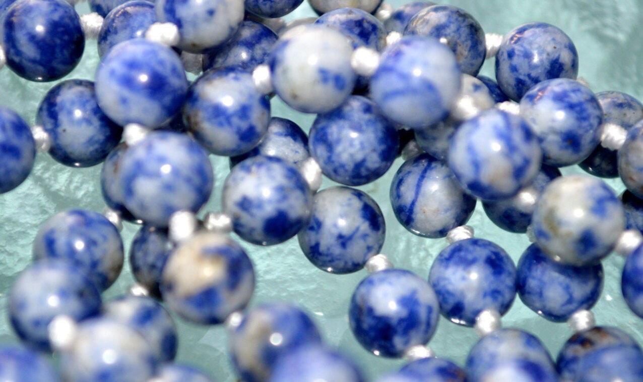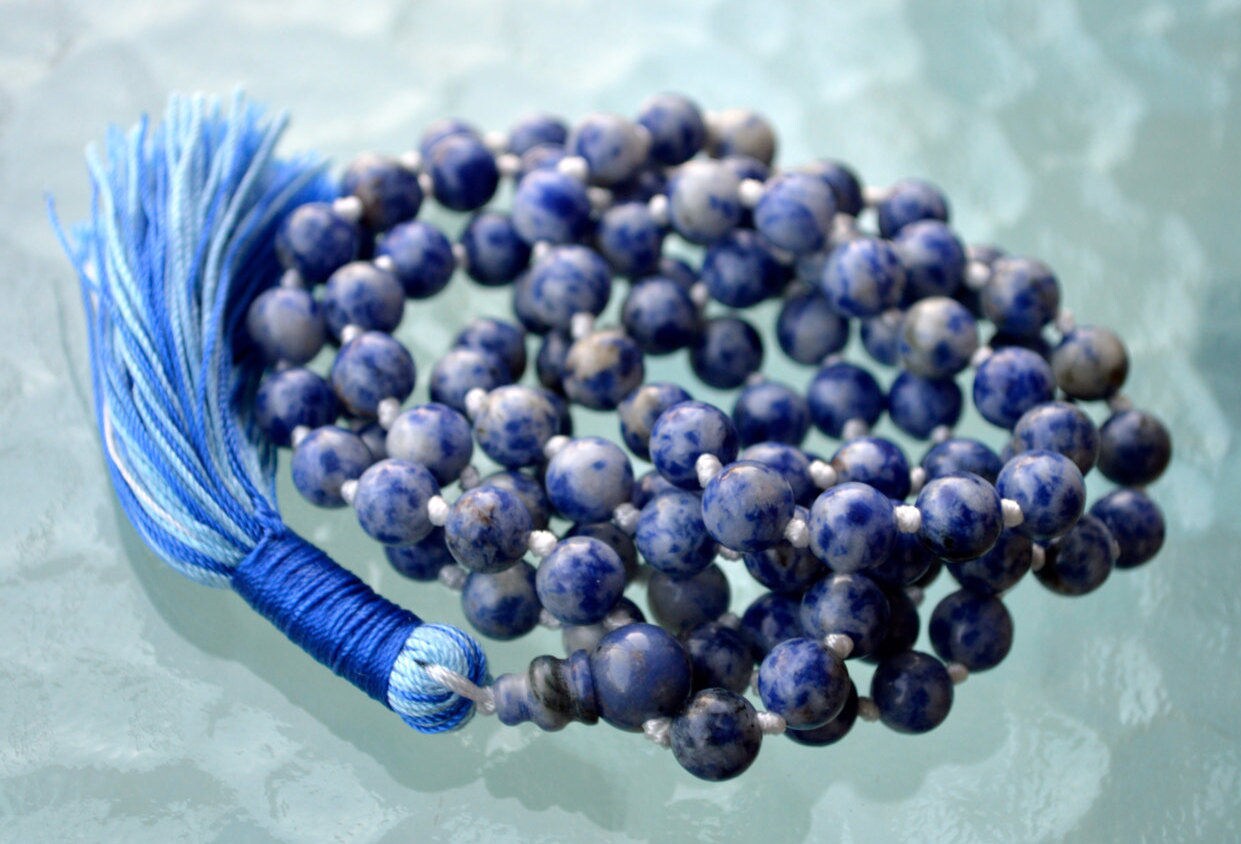 Awaken Your Kundalini RARE SODALITE PRAYER BEADS JAPA JAAP MALA PREMIUM QUALITY TOP GRADE 8 MM (108+1) HINDU TIBETAN BUDDHIST PRAYER KARMA BEADS SUBHA ROSARY MALA FOR NIRVANA, BHAKTI, FOR REMOVING INNER DOSHAS, FOR CHANTING AUM OM, FOR AWAKENING CHAKRAS, KUNDALINI THROUGH YOGA MEDITATION. 108 Throat Chakra Balancing Mala Beads Necklace Wedding Bohemian Meditation Sky blue Beach Knotted Prayer beads Bracelet Yoga Gift Sodalite