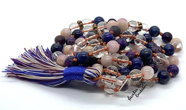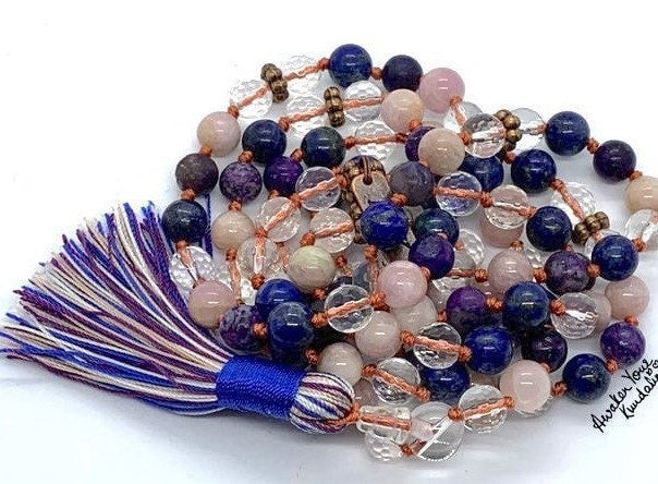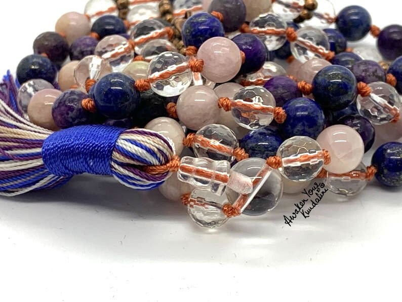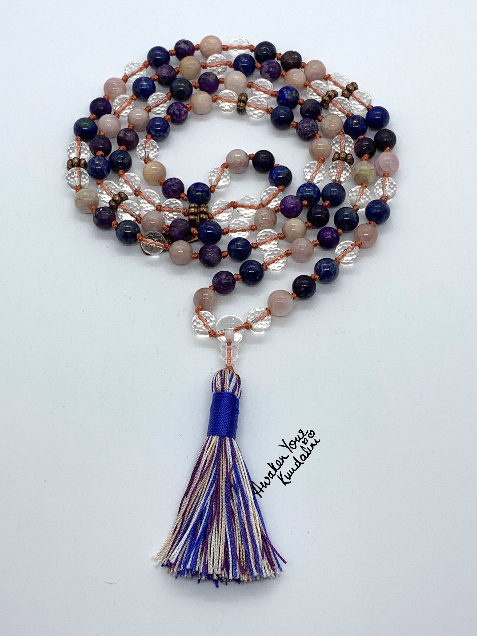 The Blue Lapis Lazuli, Quartz, Charoite & Kunzite Mala Necklace from the SATYA Collection by Awaken Your Kundalini is a sacred strand of 108 hand-knotted beads, crafted with four powerful gemstones that align intuition, transformation, clarity, and love. Designed for meditation, mantra recitation, and spiritual practice, this mala serves as a talisman for higher wisdom and inner harmony.