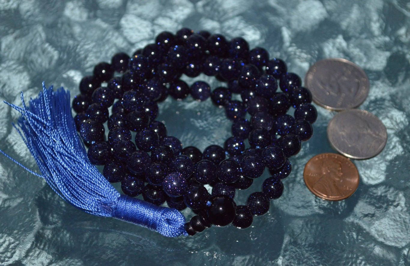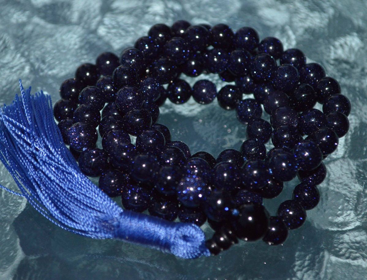Crafted from authentic Blue Goldstone (also known as Blue Sandstone), this hand-knotted 108-bead mala is designed for both spiritual practice and statement style. Blue Goldstone is known as the Stone of Ambition, resonating with the Throat Chakra (Vishuddha) to enhance communication, confidence, and focus. Its deep blue tone with coppery specks inspires motivation and encourages you to manifest your goals fearlessly.