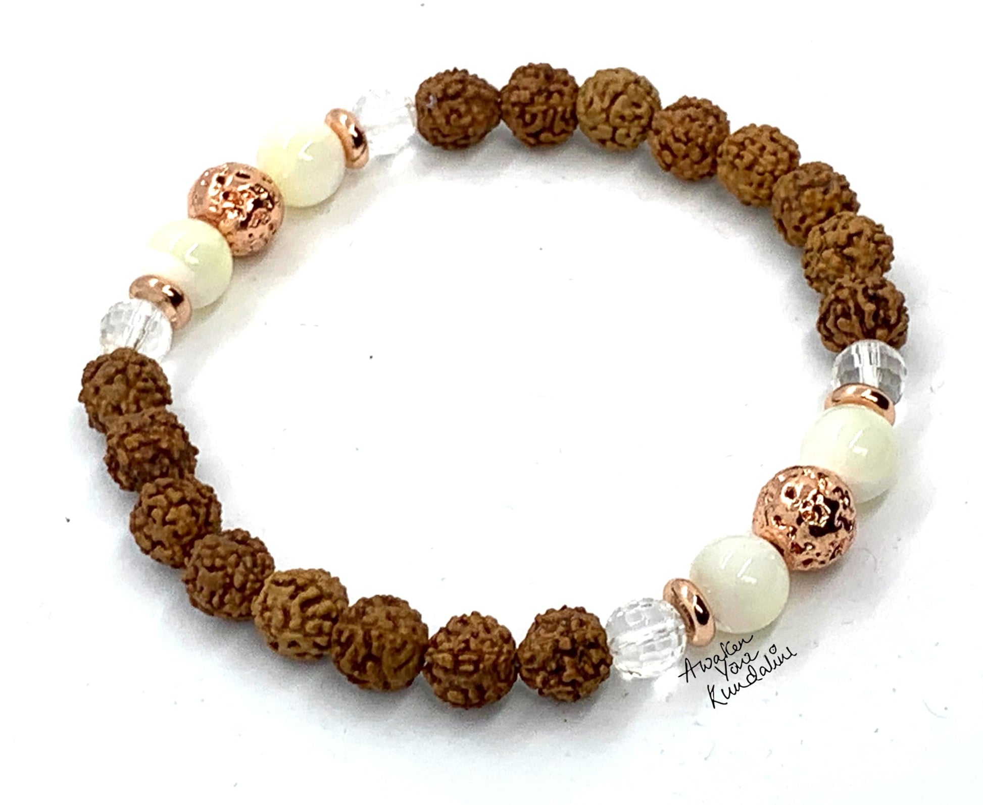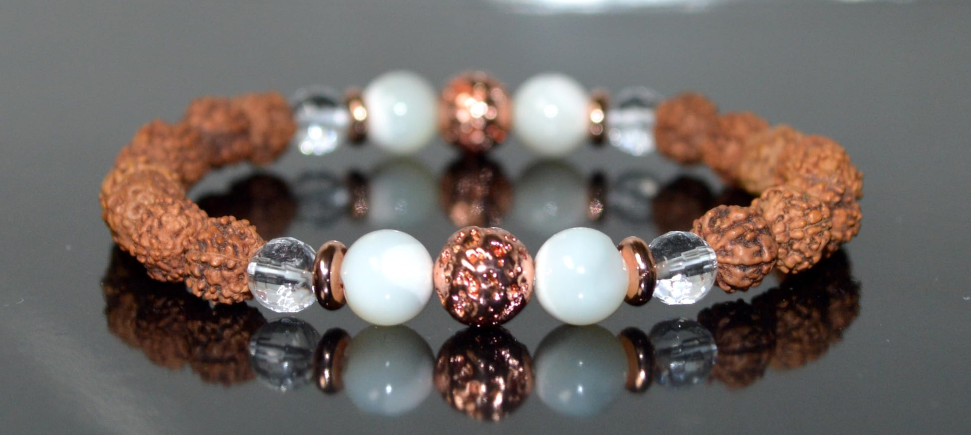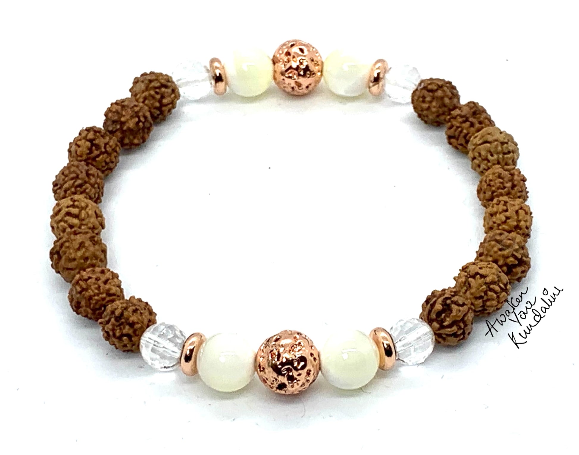 - Discover the beauty and elegance of this handcrafted 8mm stretch bracelet, featuring a blend of 5 Mukhi Rudraksha beads, faceted crystal quartz, mother of pearl, and silver tone lava rock beads. Each bead is carefully chosen to create a striking and harmonious design. The alloy spacers provide a polished finish, enhancing the bracelet's overall appeal.