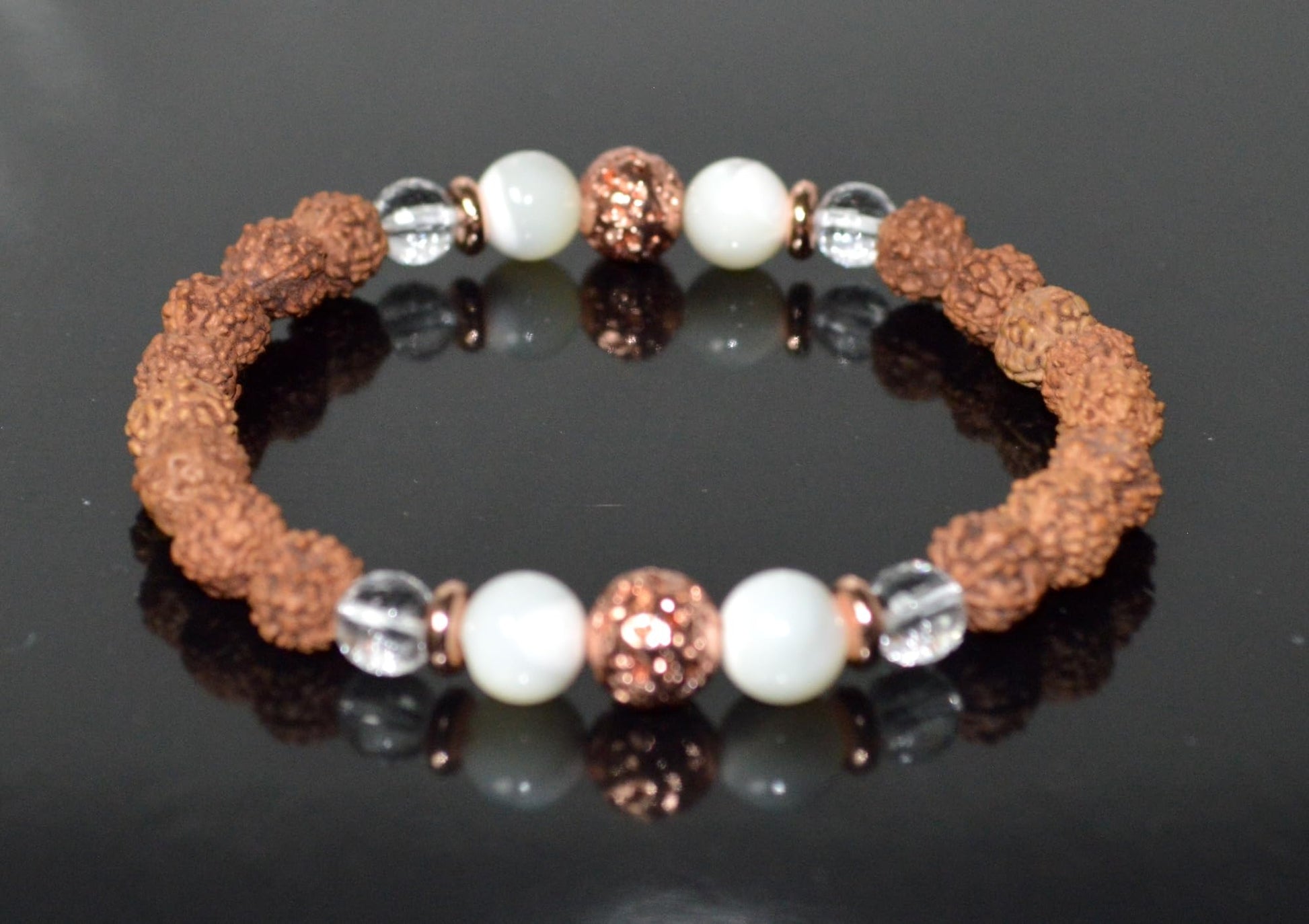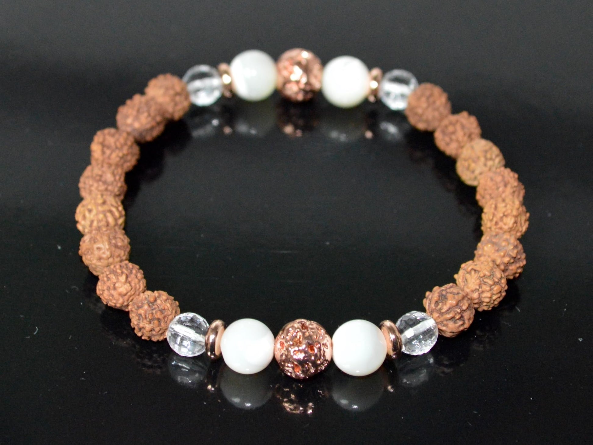 5 Mukhi Chikna Rudraksha, Crystal Quartz, Mother of Pearl and Lava Stretch Bracelet - April Birthstone for Aries, Taurus - Root & Crown Chakra Alignment
