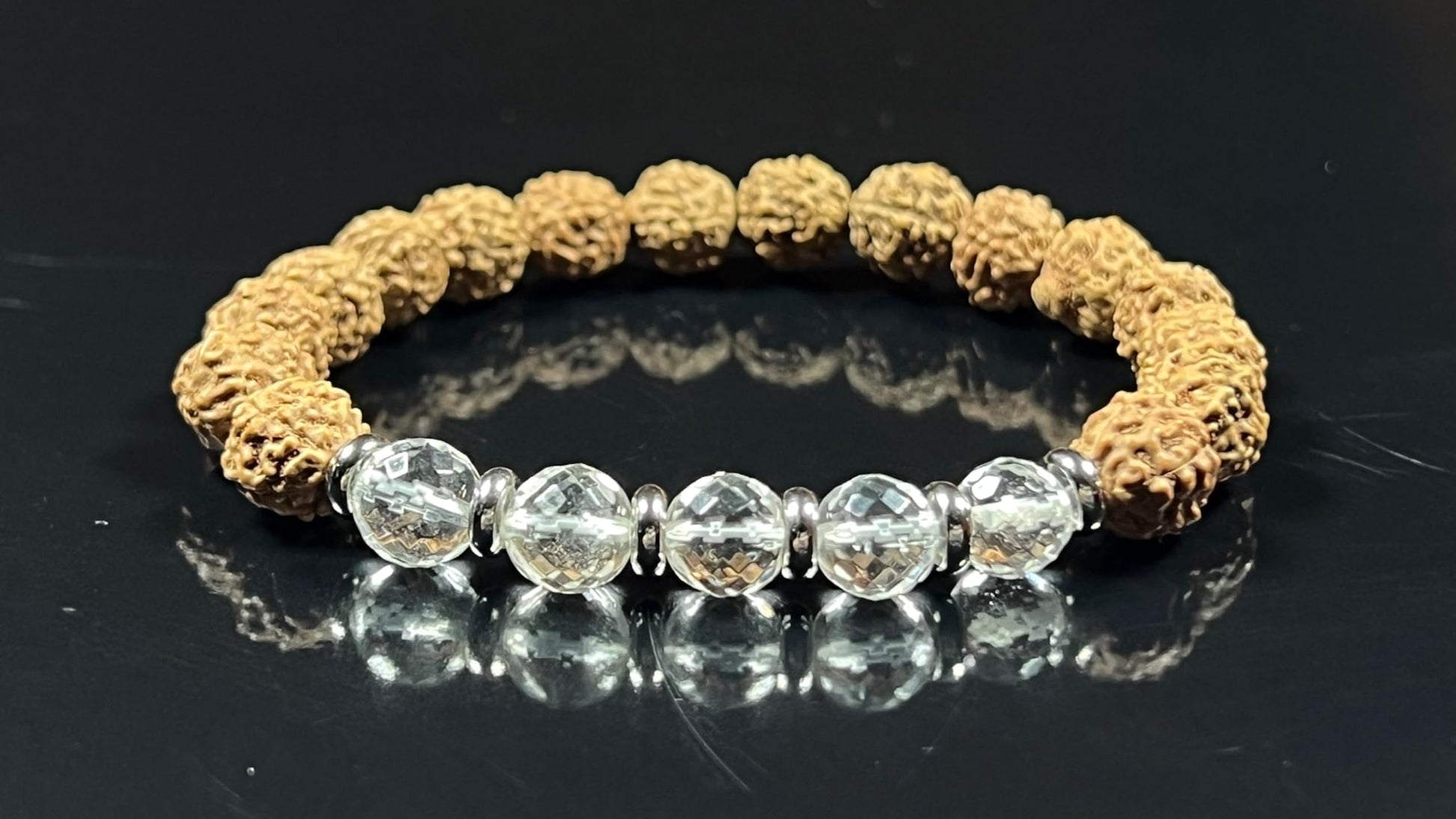 - This 8mm handmade Chikna Rudraksha and facetted Crystal Quartz stretch bracelet is a harmonious blend of natural elements and spiritual significance. The Rudraksha beads, known for their spiritual resonance, are elegantly paired with facetted Crystal Quartz, adding a touch of brilliance. The bracelet is designed to fit wrist sizes from 5.5 to 9.5 inches, making it versatile and comfortable for daily wear or special occasions.