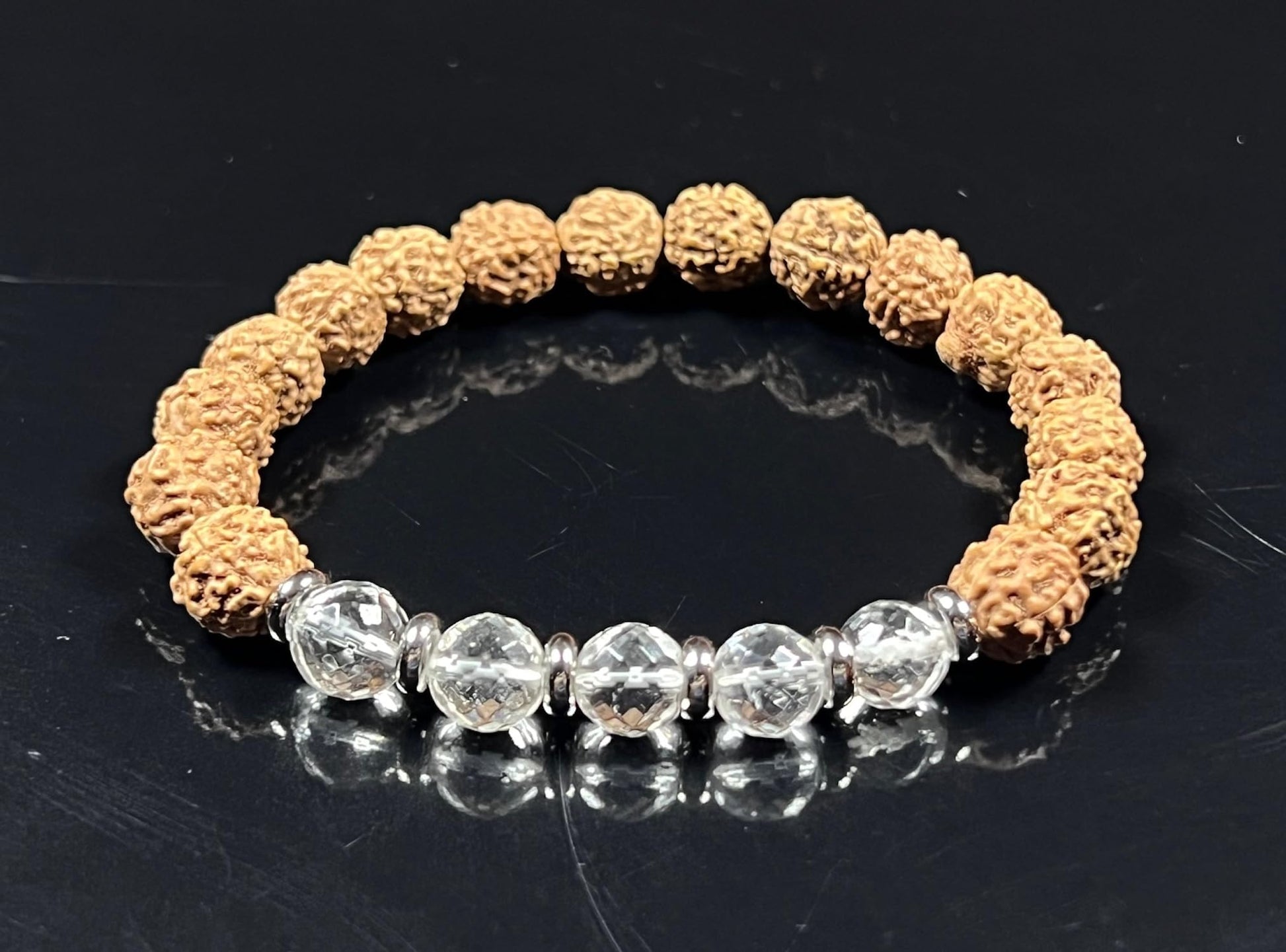 - This 8mm handmade Chikna Rudraksha and facetted Crystal Quartz stretch bracelet is a harmonious blend of natural elements and spiritual significance. The Rudraksha beads, known for their spiritual resonance, are elegantly paired with facetted Crystal Quartz, adding a touch of brilliance. The bracelet is designed to fit wrist sizes from 5.5 to 9.5 inches, making it versatile and comfortable for daily wear or special occasions.