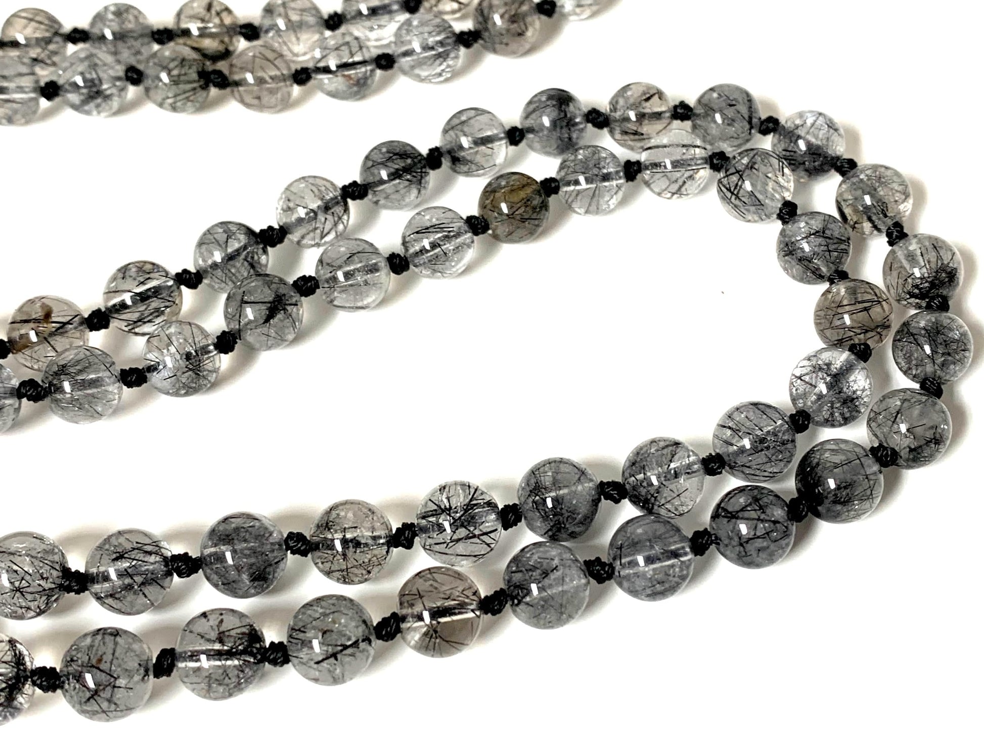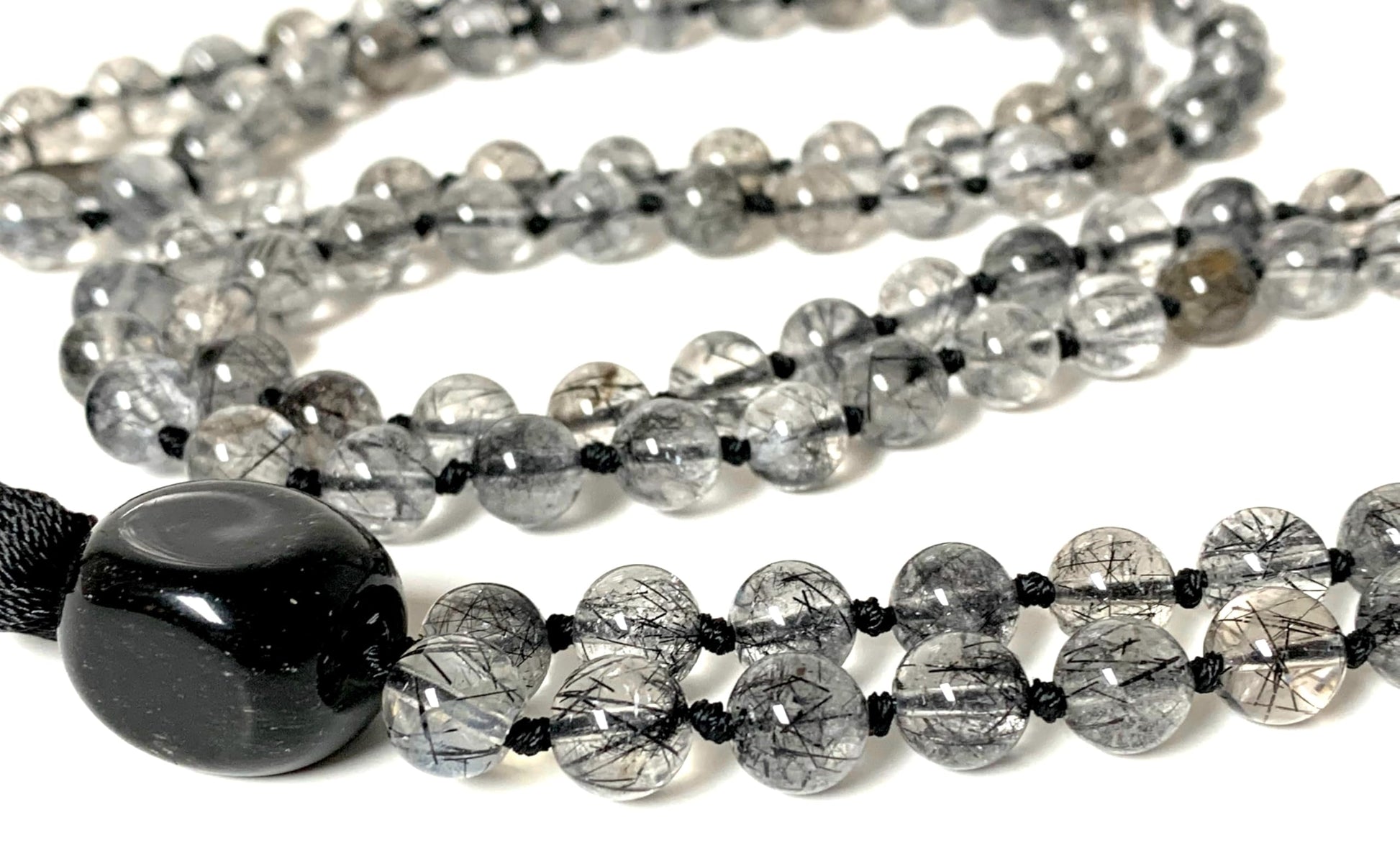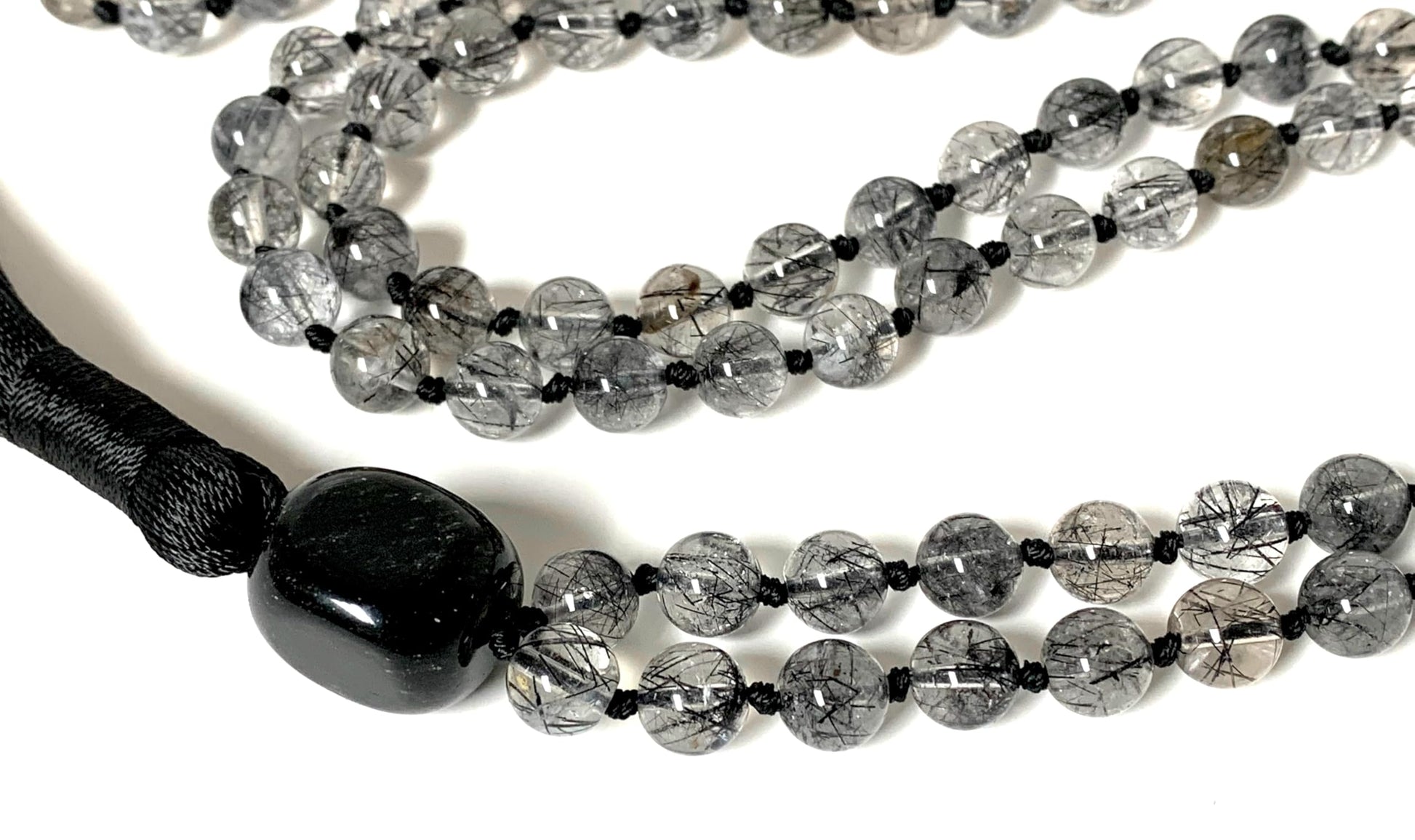 AAA Grade Rutilated Quartz Mala Necklace with Black Tourmaline Guru Bead – Hand-knotted 8mm 108 Beads | Crown & Root Chakras | April Birthstone Energy | Ethically Sourced