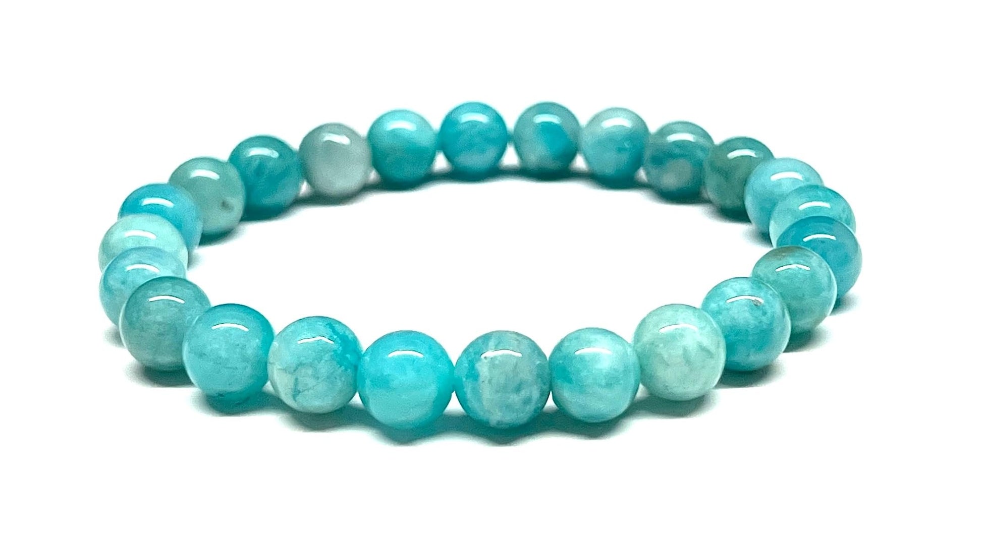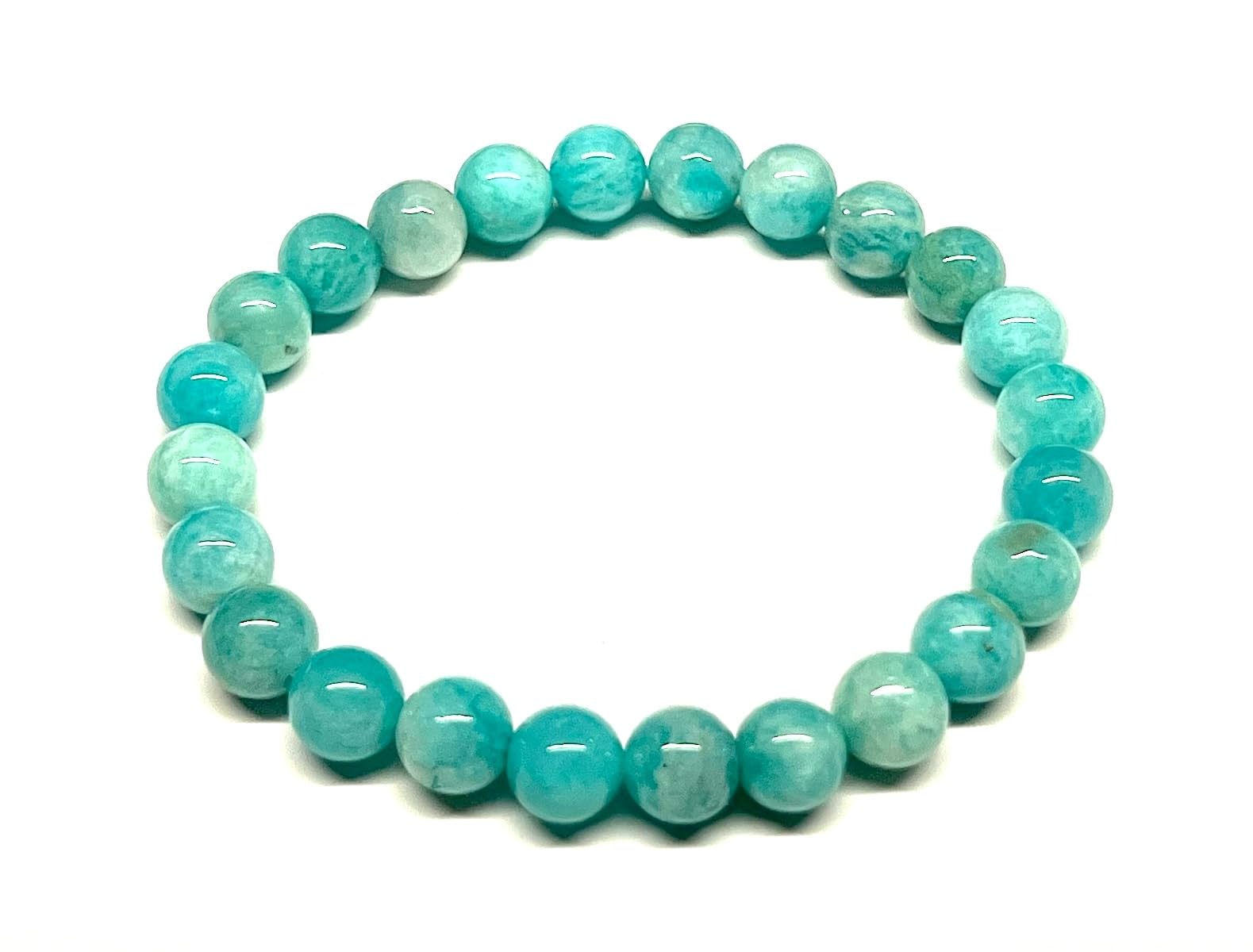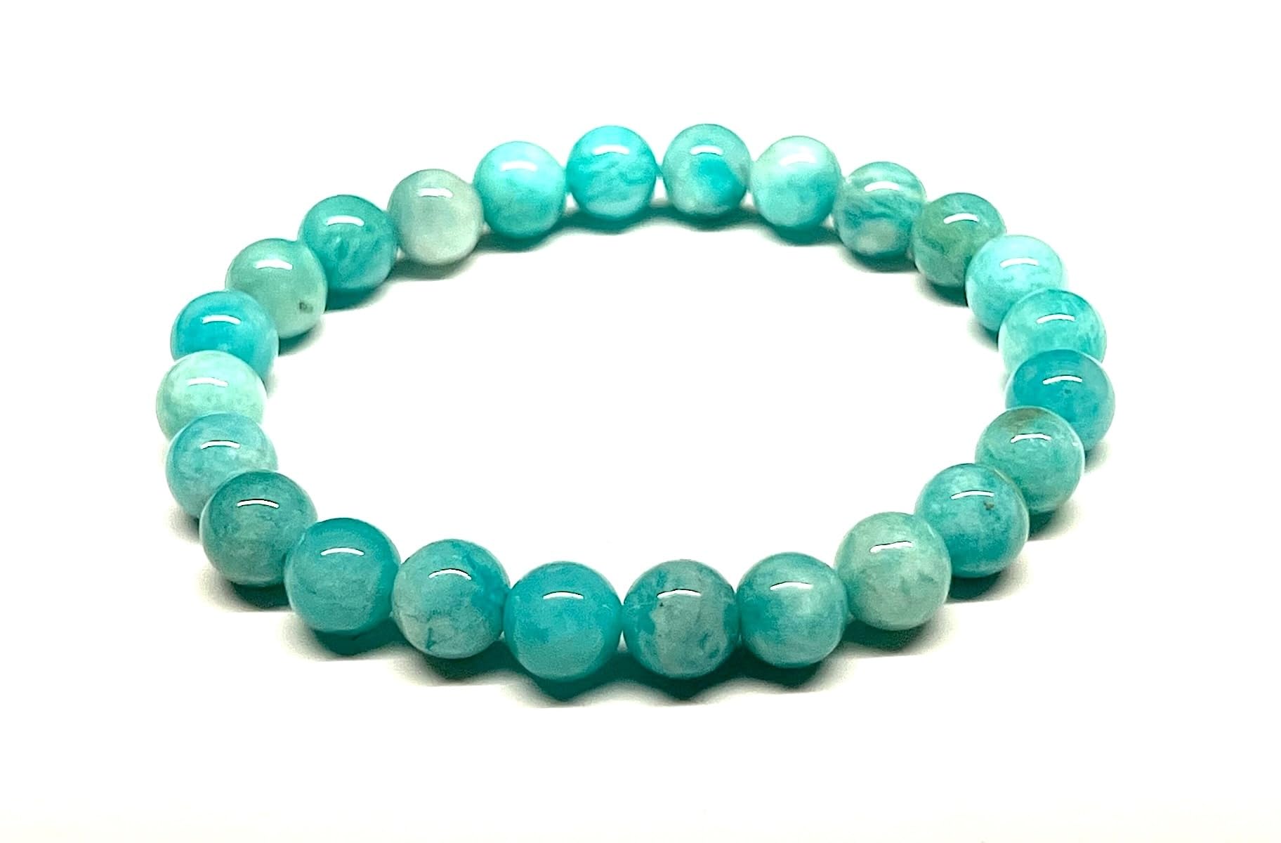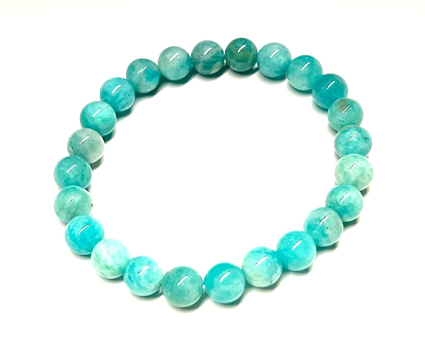 - This AAA Grade 8mm Amazonite Stretch Bracelet is a beautiful and calming piece, perfect for everyday wear or special occasions. The soothing blue-green tones of Amazonite make it a versatile accessory, effortlessly blending with any outfit. Designed as a stretch bracelet and available in sizes from 6 to 9 inches, it offers a comfortable and adaptable fit for any wrist size.