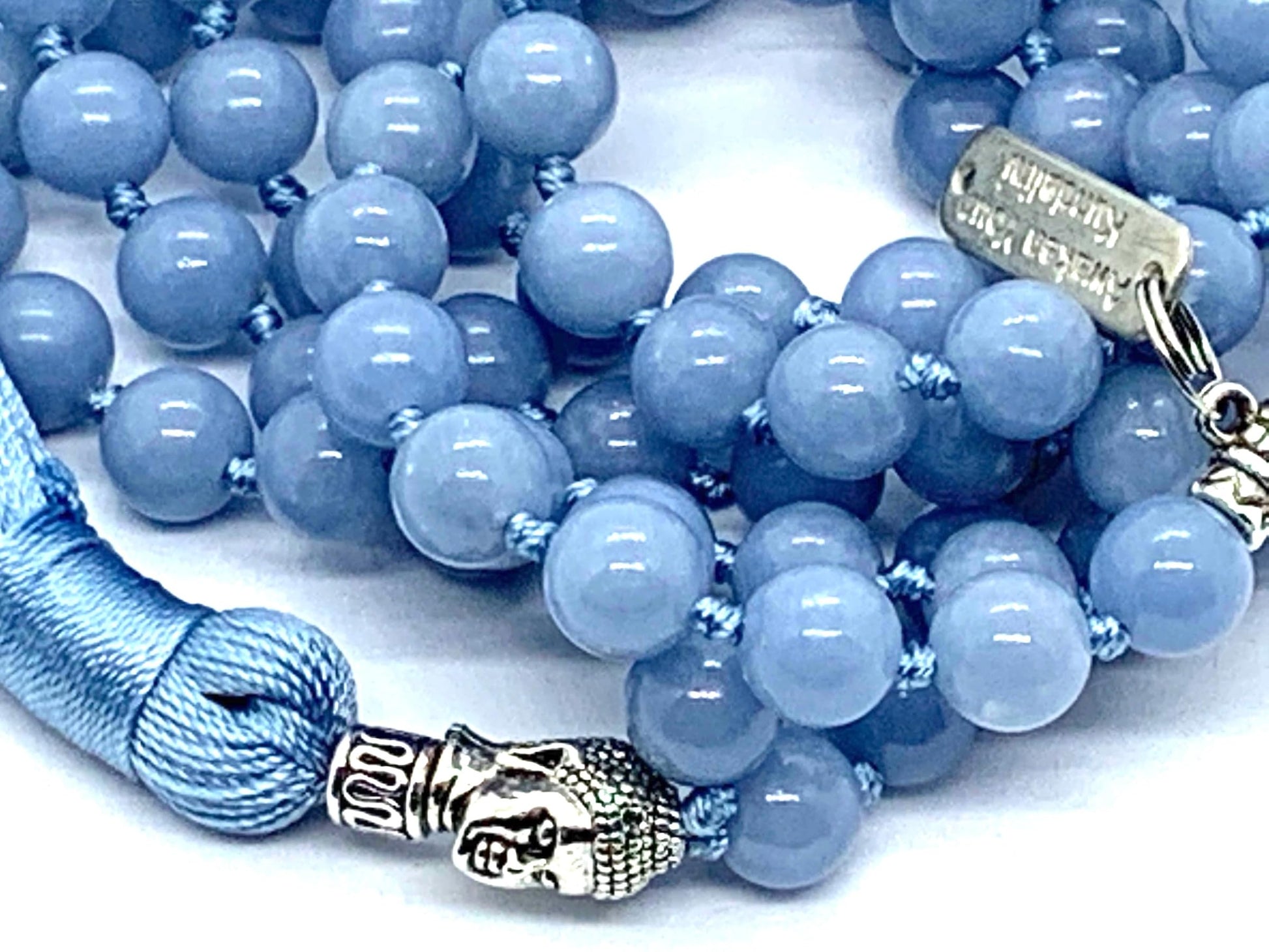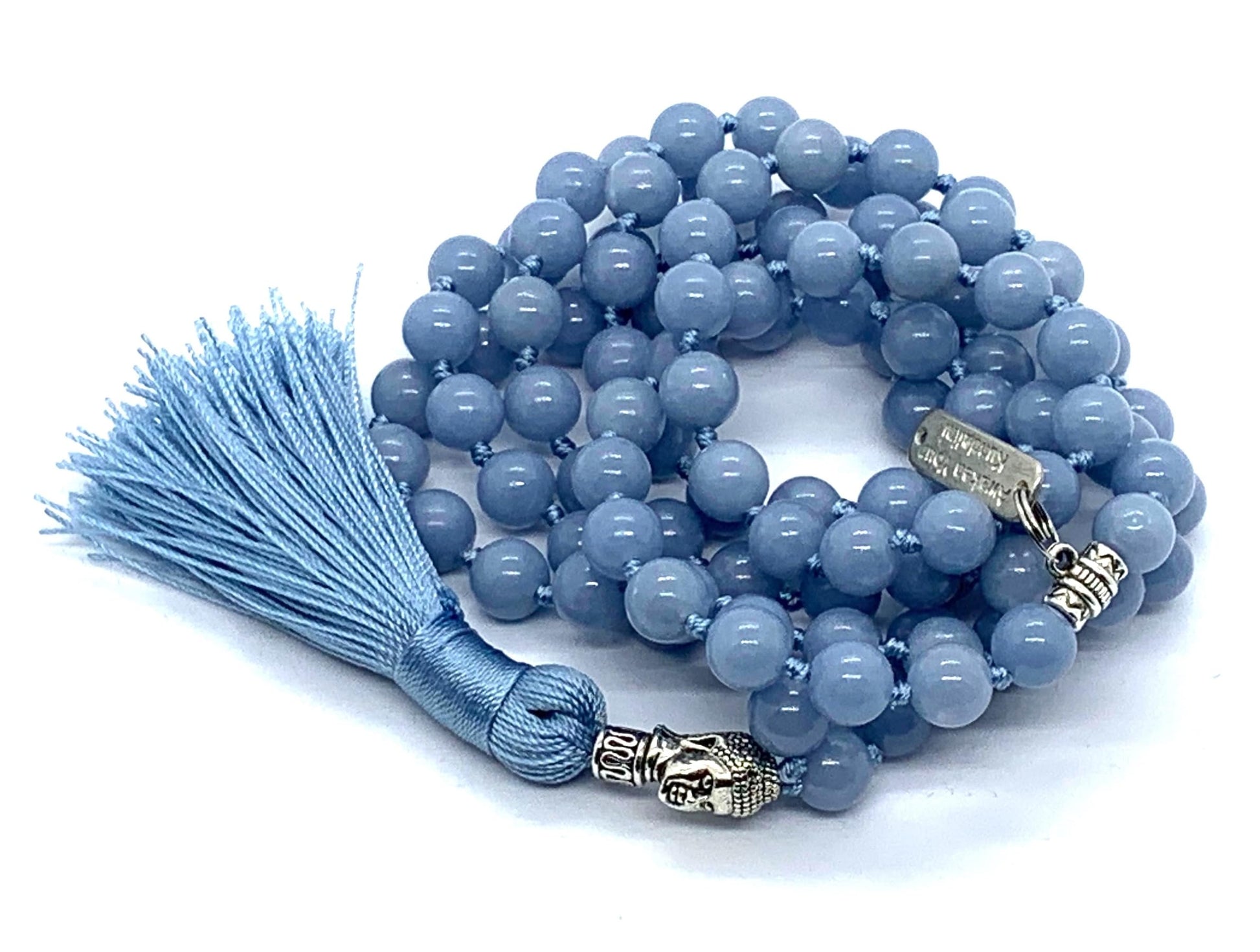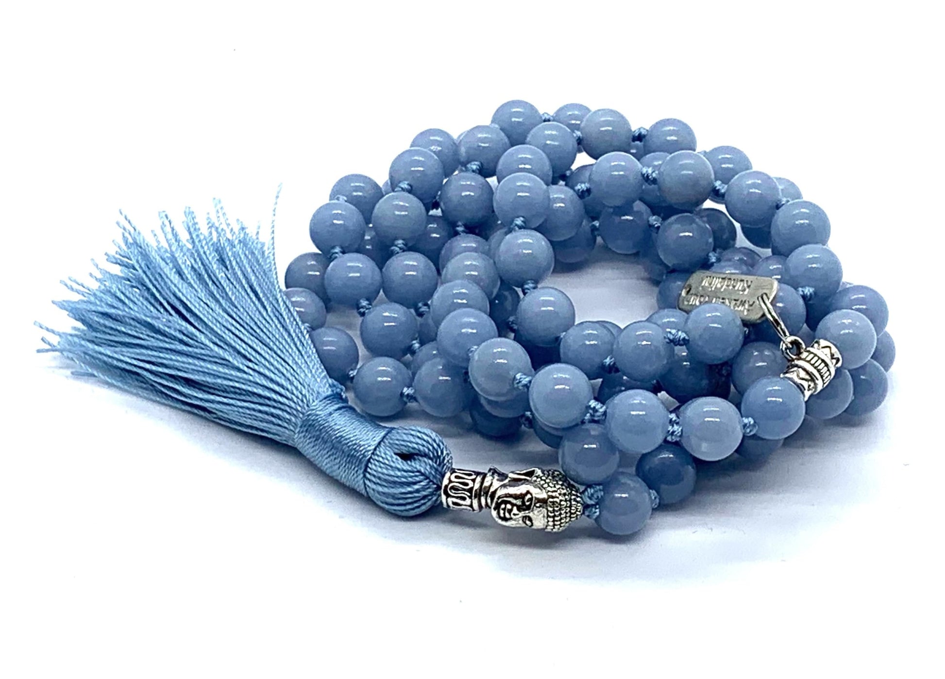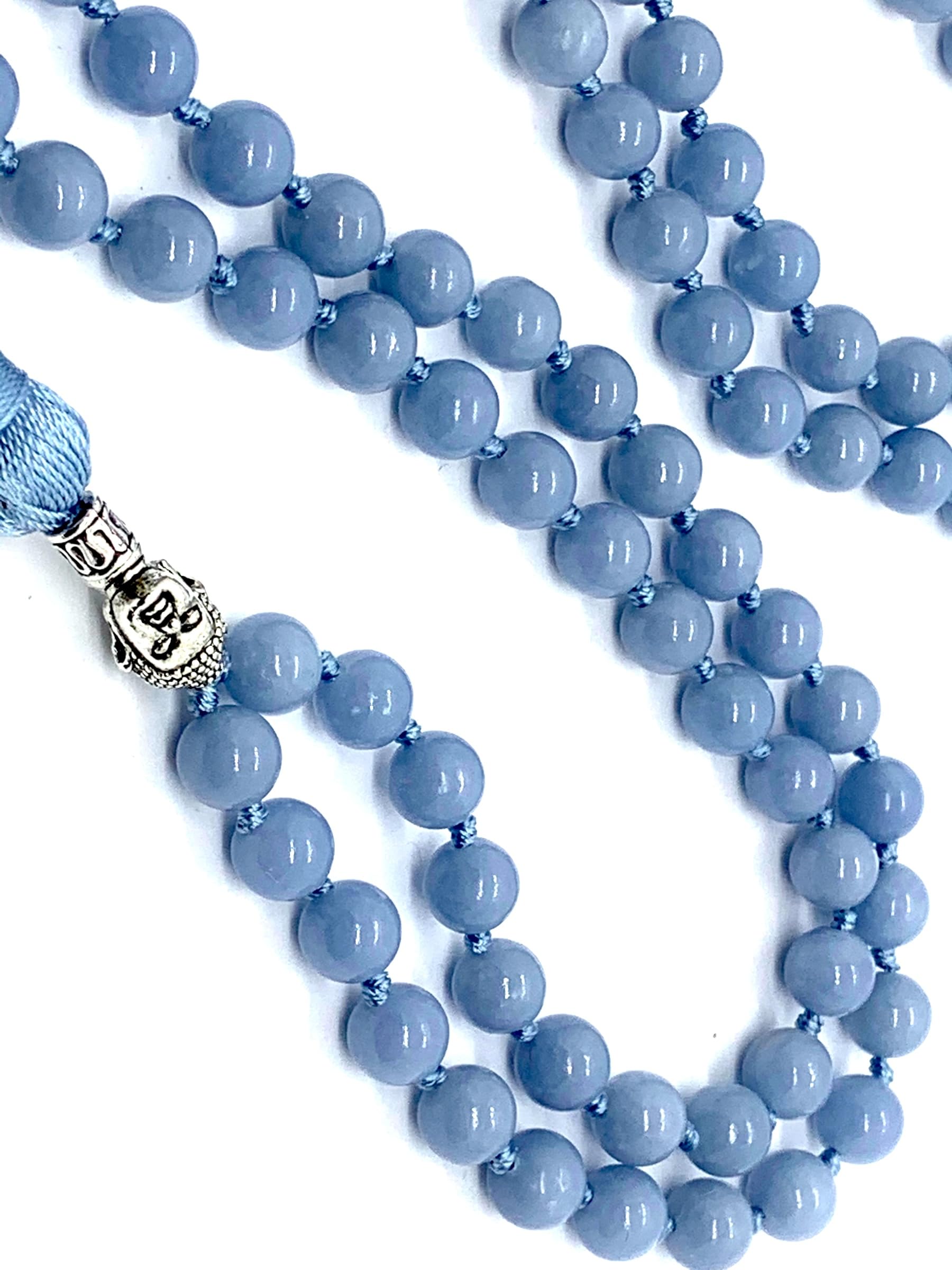 - Elevate your spiritual practice with our Hand-Knotted Natural & Ethically Sourced Angelite Mala Beads Necklace, a serene and elegant piece designed for mindfulness, prayer, and personal adornment. Each 8mm Angelite bead is carefully selected for its natural beauty and high vibrational energy, complemented by a zinc alloy Buddha head guru bead that symbolizes peace and enlightenment. Featuring 108 beads, a sacred number in spiritual practices, this mala is a perfect blend of elegance and spiritual significance. Whether you're meditating, chanting, or simply accessorizing, this mala will inspire you to stay grounded and connected to your inner self.