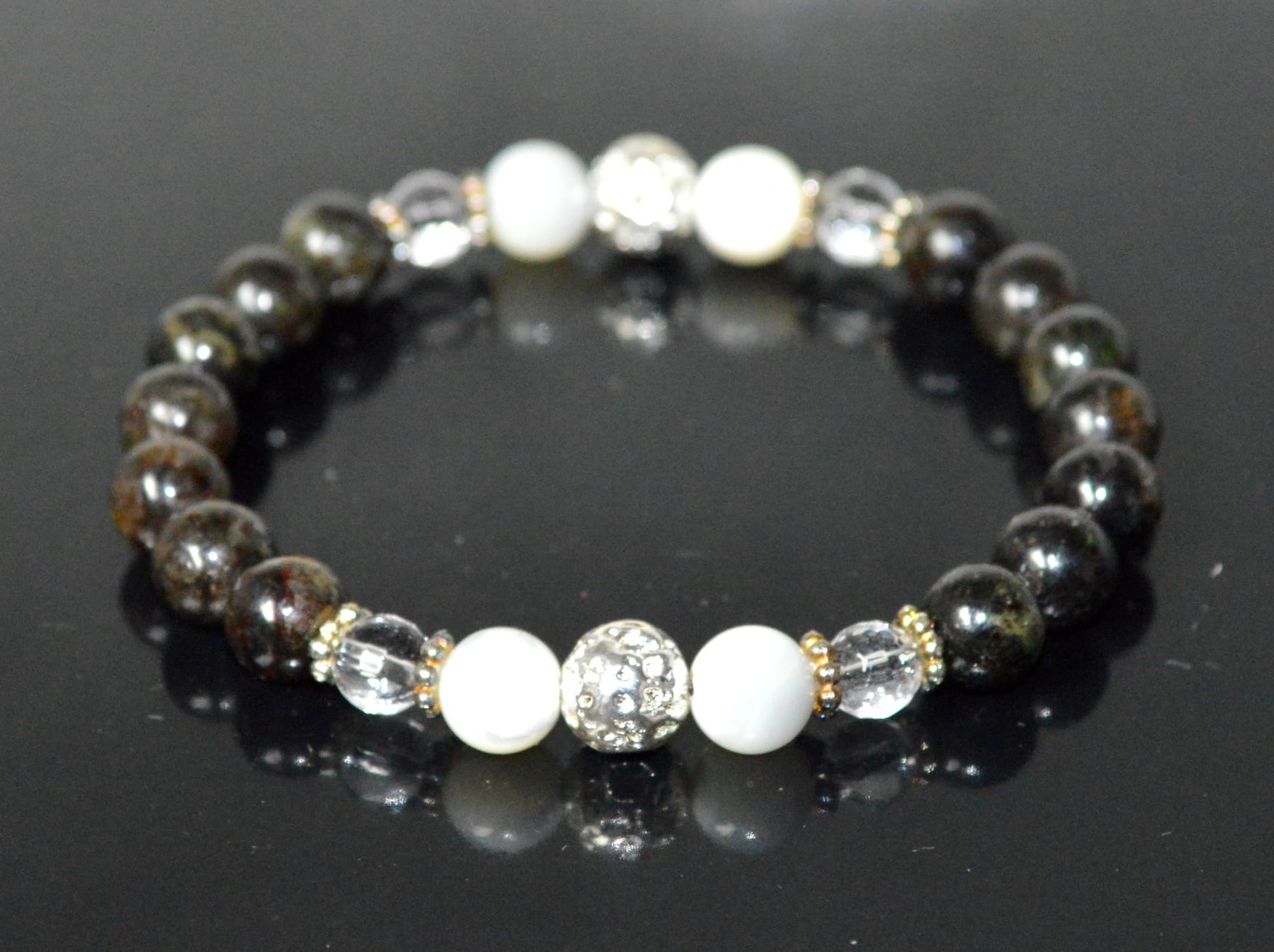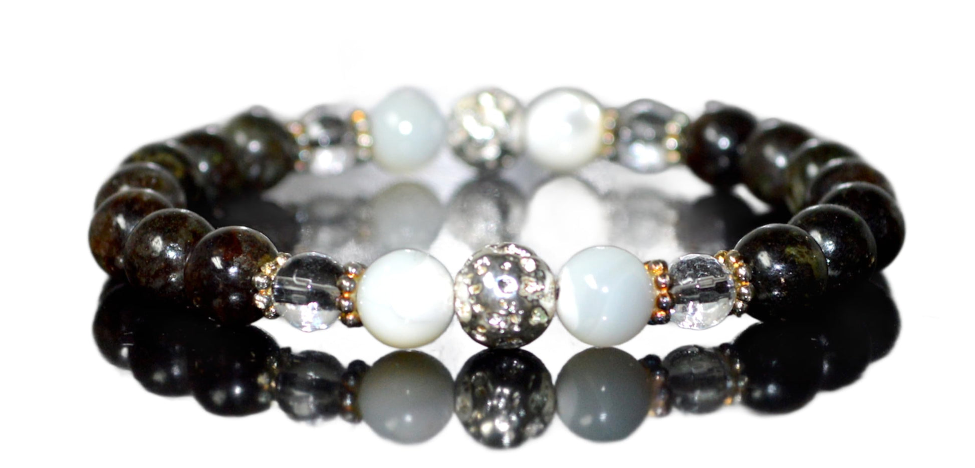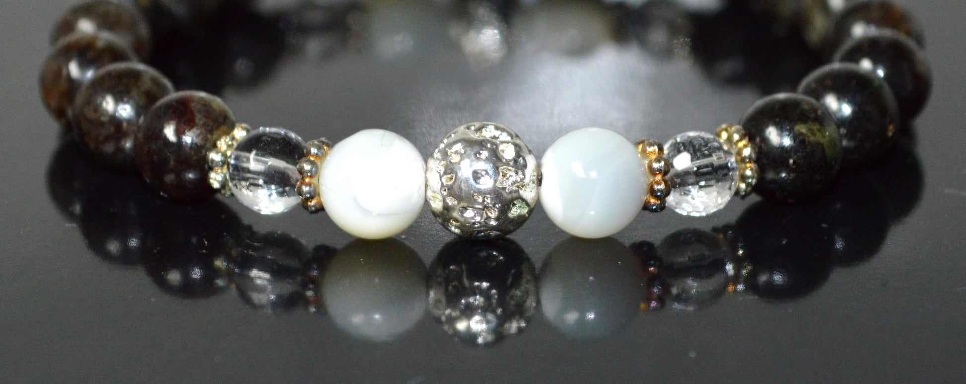 - This 8mm stretch bracelet is a stunning blend of high-quality gemstones, featuring astrophyllite, crackled crystal quartz, faceted crystal quartz, mother of pearl, and silver finish lava beads. Crystal quartz, the birthstone for April, is linked to Aries & Taurus and is renowned for its clarity and energy-amplifying properties. Astrophyllite, though not tied to a specific month, enhances awareness and spirituality, perfectly complementing the other stones.