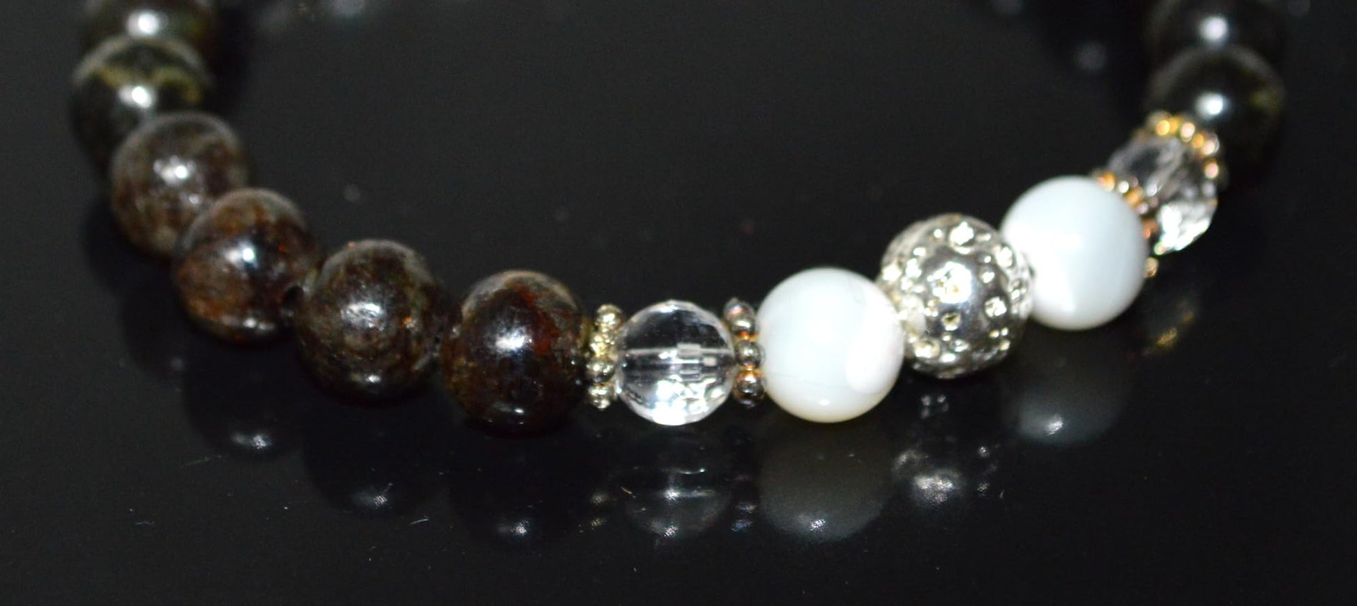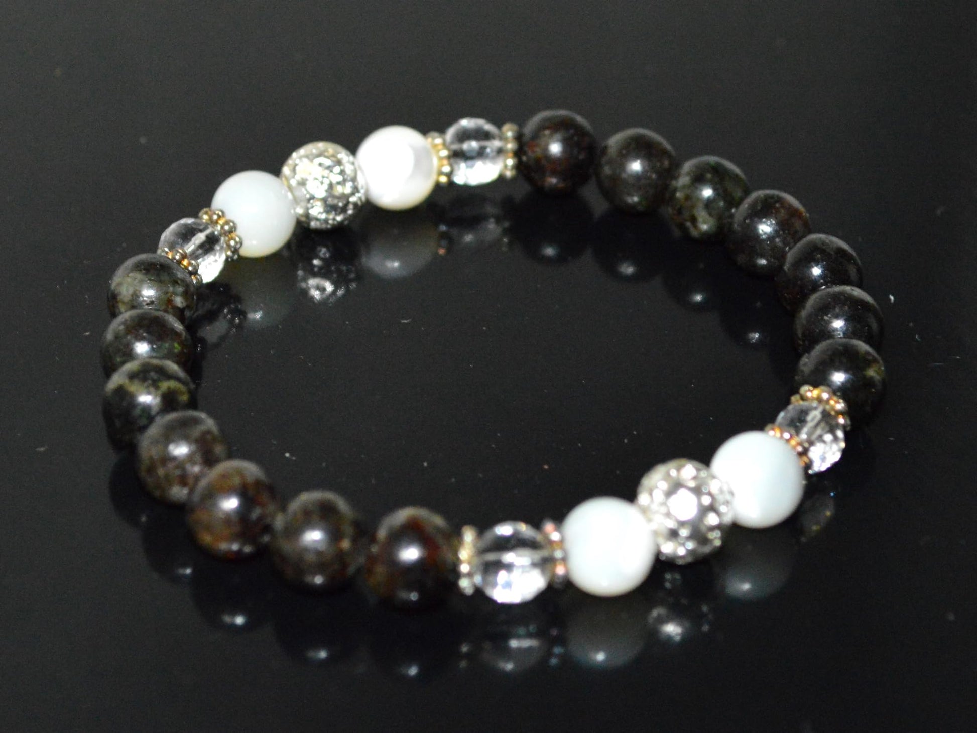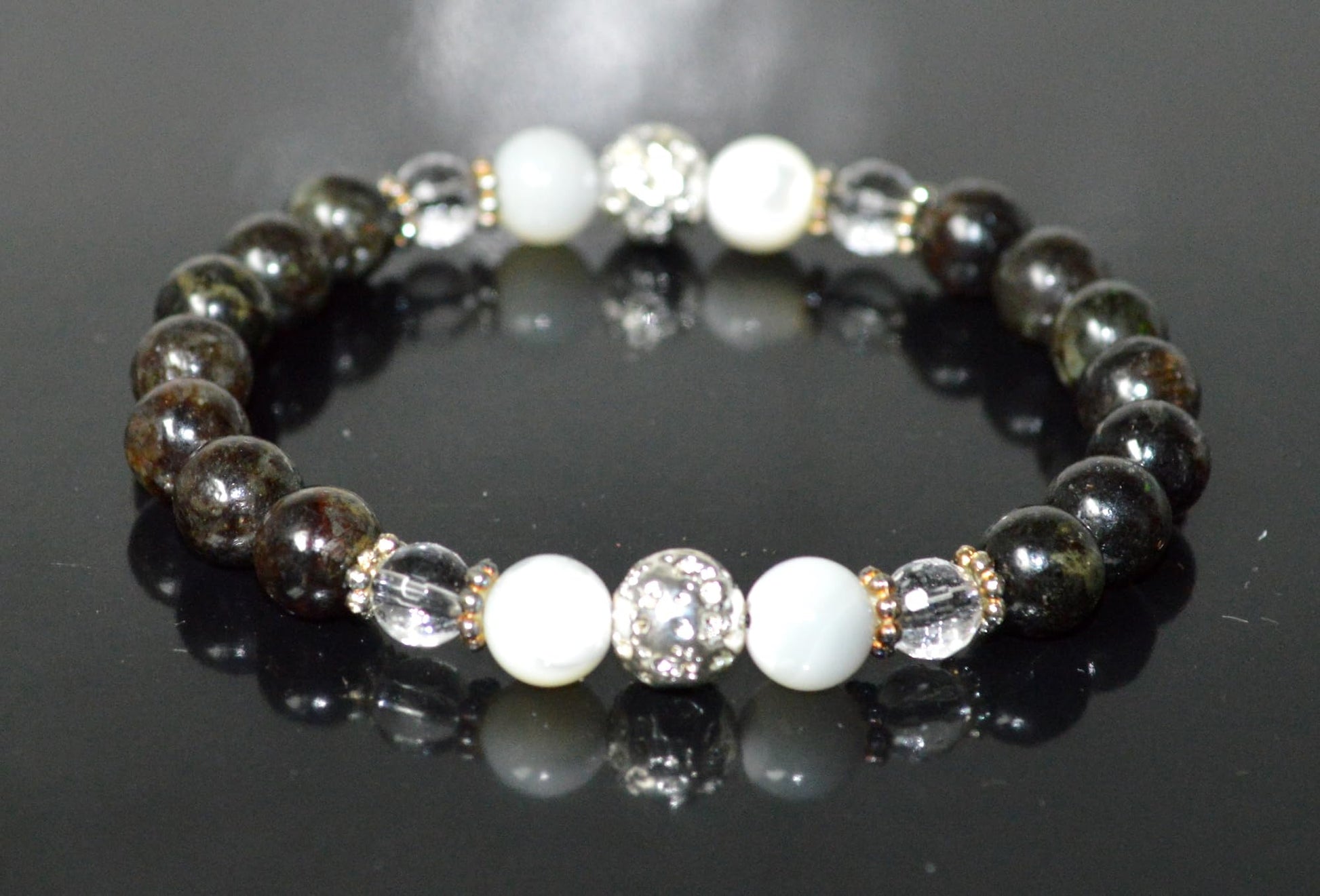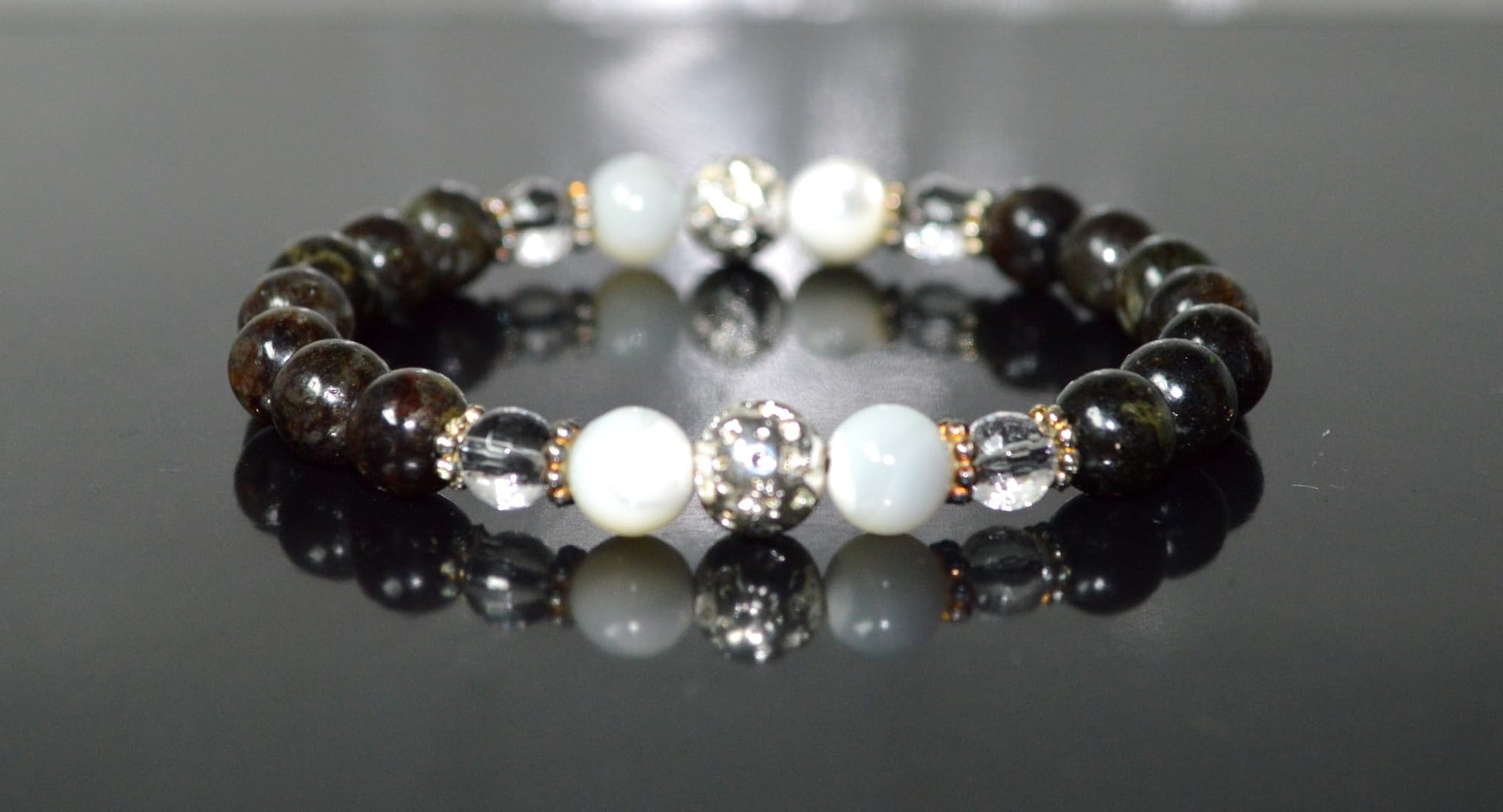 - This 8mm stretch bracelet is a stunning blend of high-quality gemstones, featuring astrophyllite, crackled crystal quartz, faceted crystal quartz, mother of pearl, and silver finish lava beads. Crystal quartz, the birthstone for April, is linked to Aries & Taurus and is renowned for its clarity and energy-amplifying properties. Astrophyllite, though not tied to a specific month, enhances awareness and spirituality, perfectly complementing the other stones.