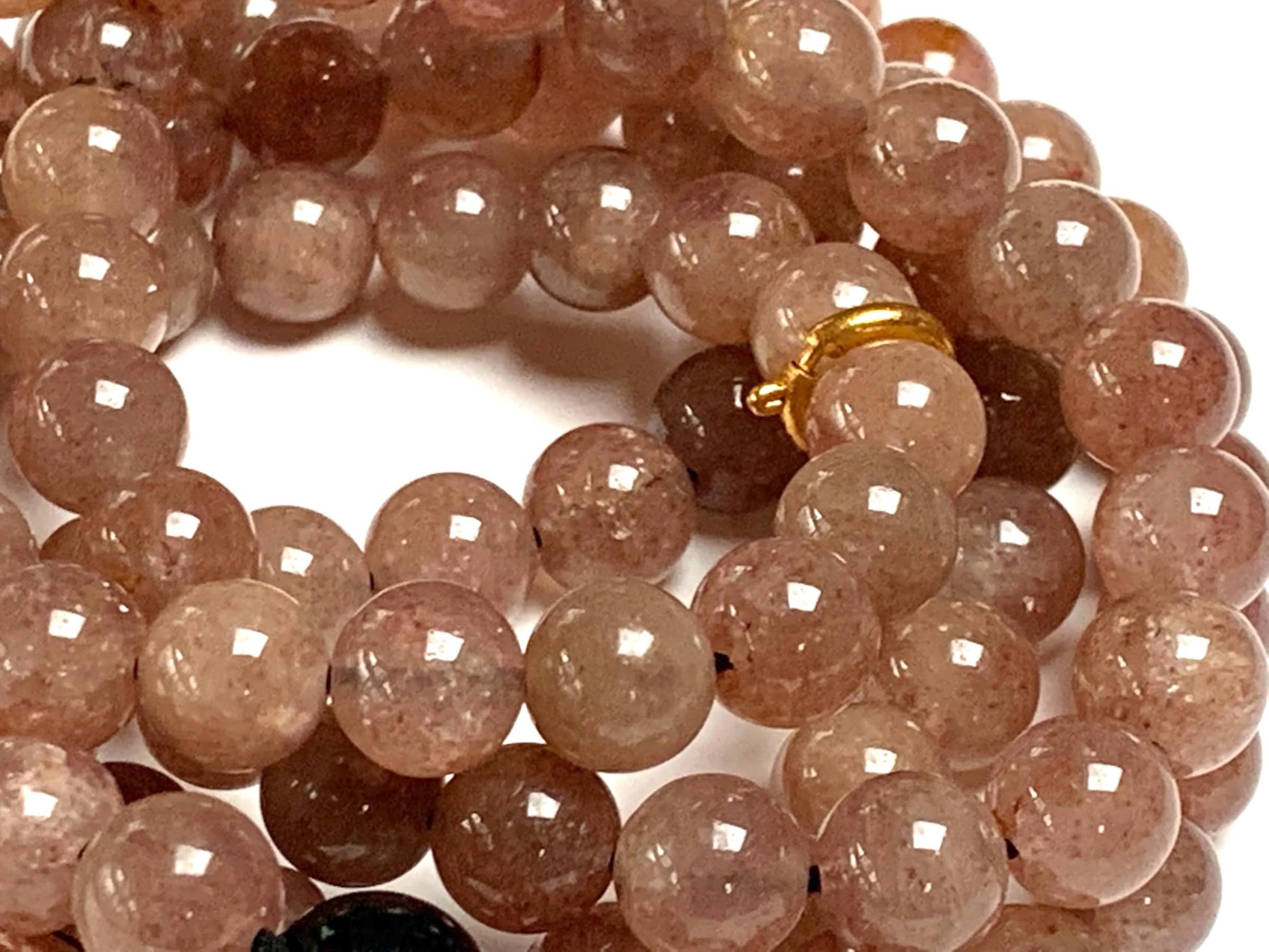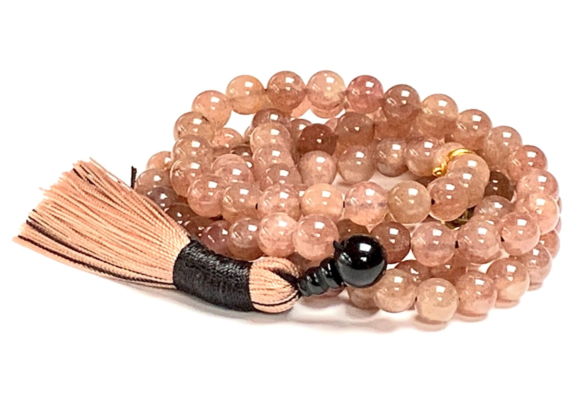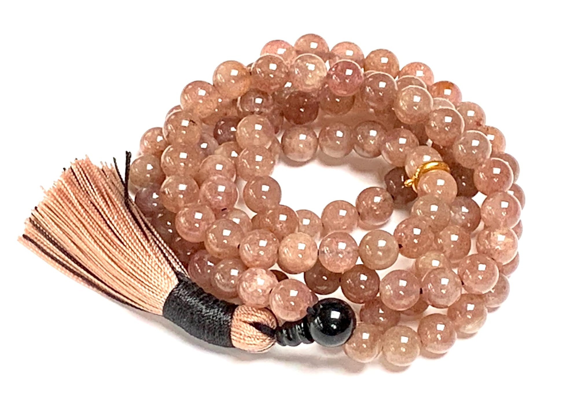 - Elevate your spiritual journey with the Handmade Strawberry Quartz Mala Necklace. This exquisite mala features 108 hand-knotted 8mm Strawberry Quartz beads, each radiating a soft, pink hue that symbolizes love and emotional balance.