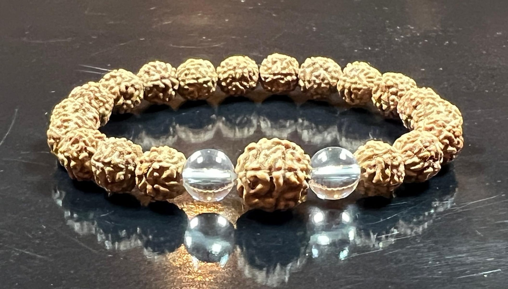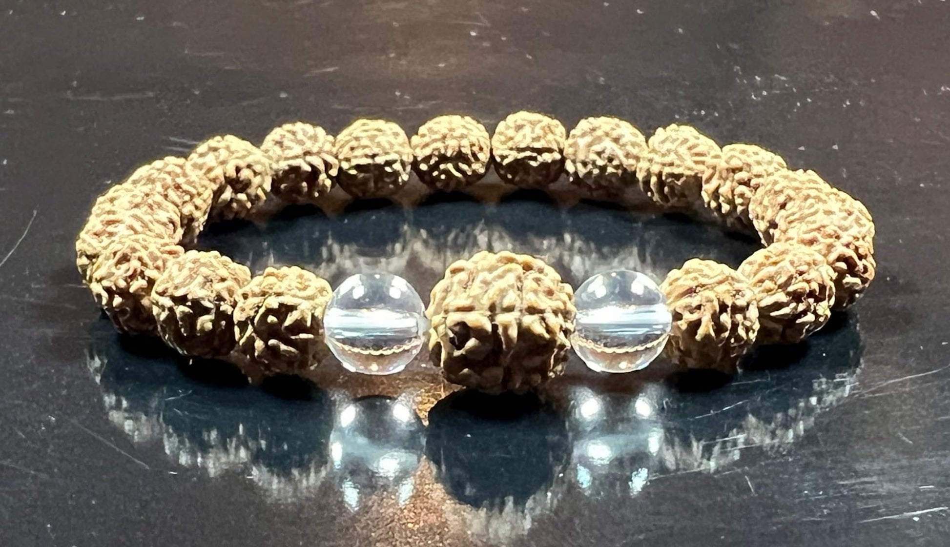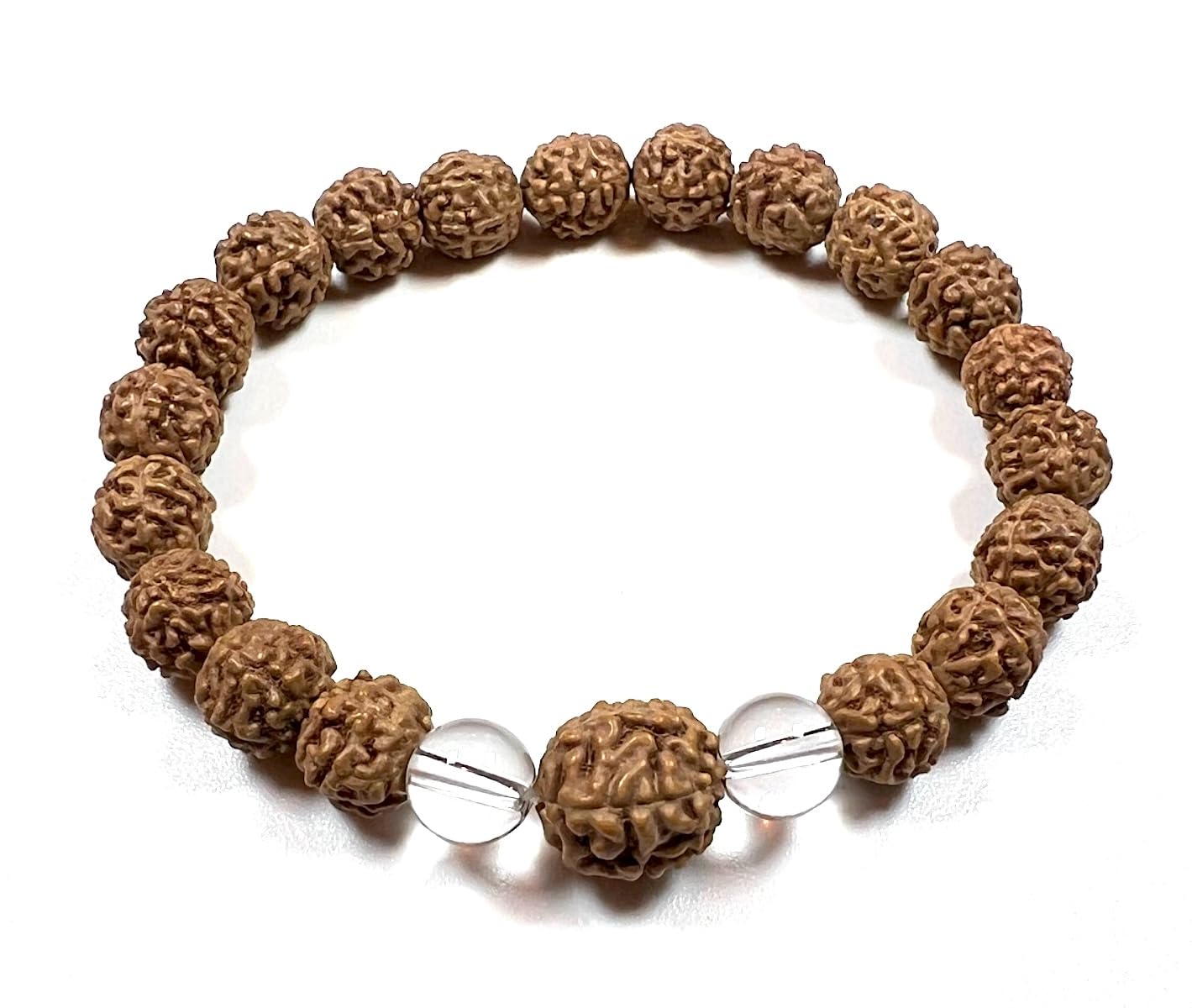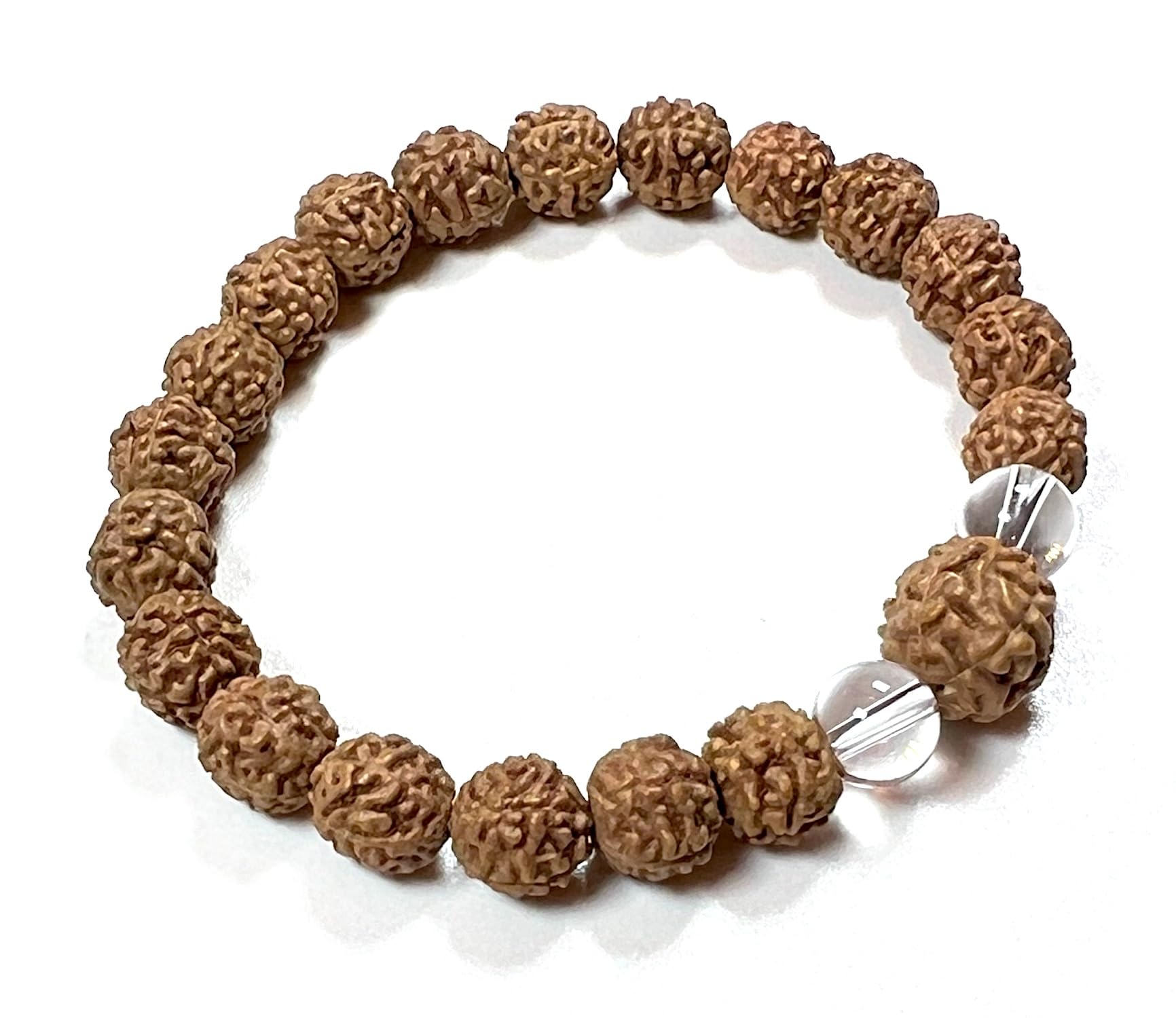 - Handmade in USA. Unleash your inner power with this divine stretch bracelet! Featuring a potent combination of 8mm 5 Mukhi Rudraksha beads and 8mm Crystal Quartz beads, crowned by a powerful 10mm 7 Mukhi Rudraksha bead, this bracelet offers a harmonious blend of spiritual energy and grounding. Crystal Quartz, often associated with the zodiac sign Taurus and considered the April birthstone, amplifies the energy of the Rudraksha beads.