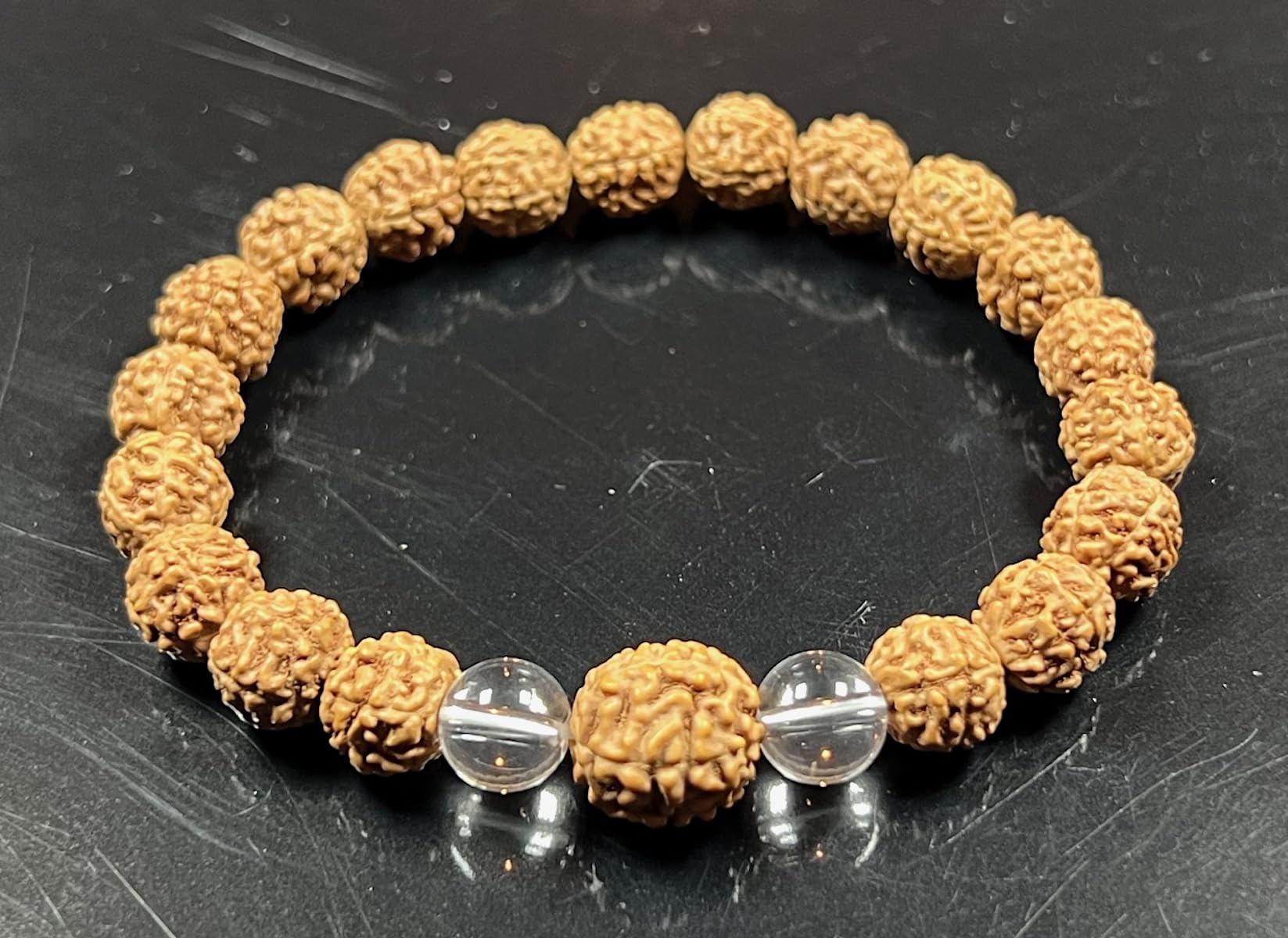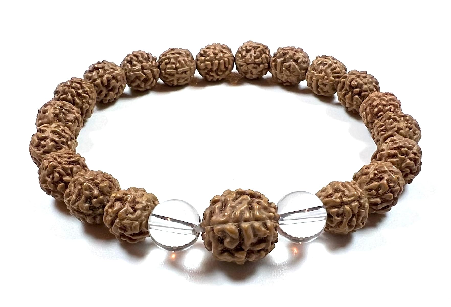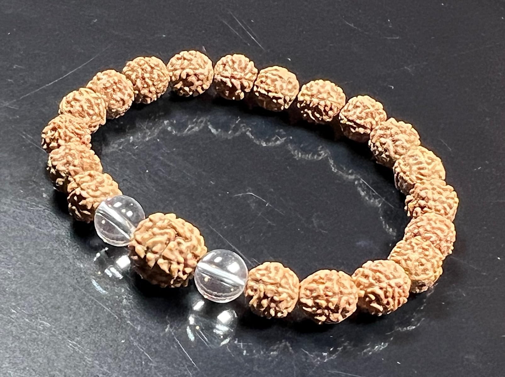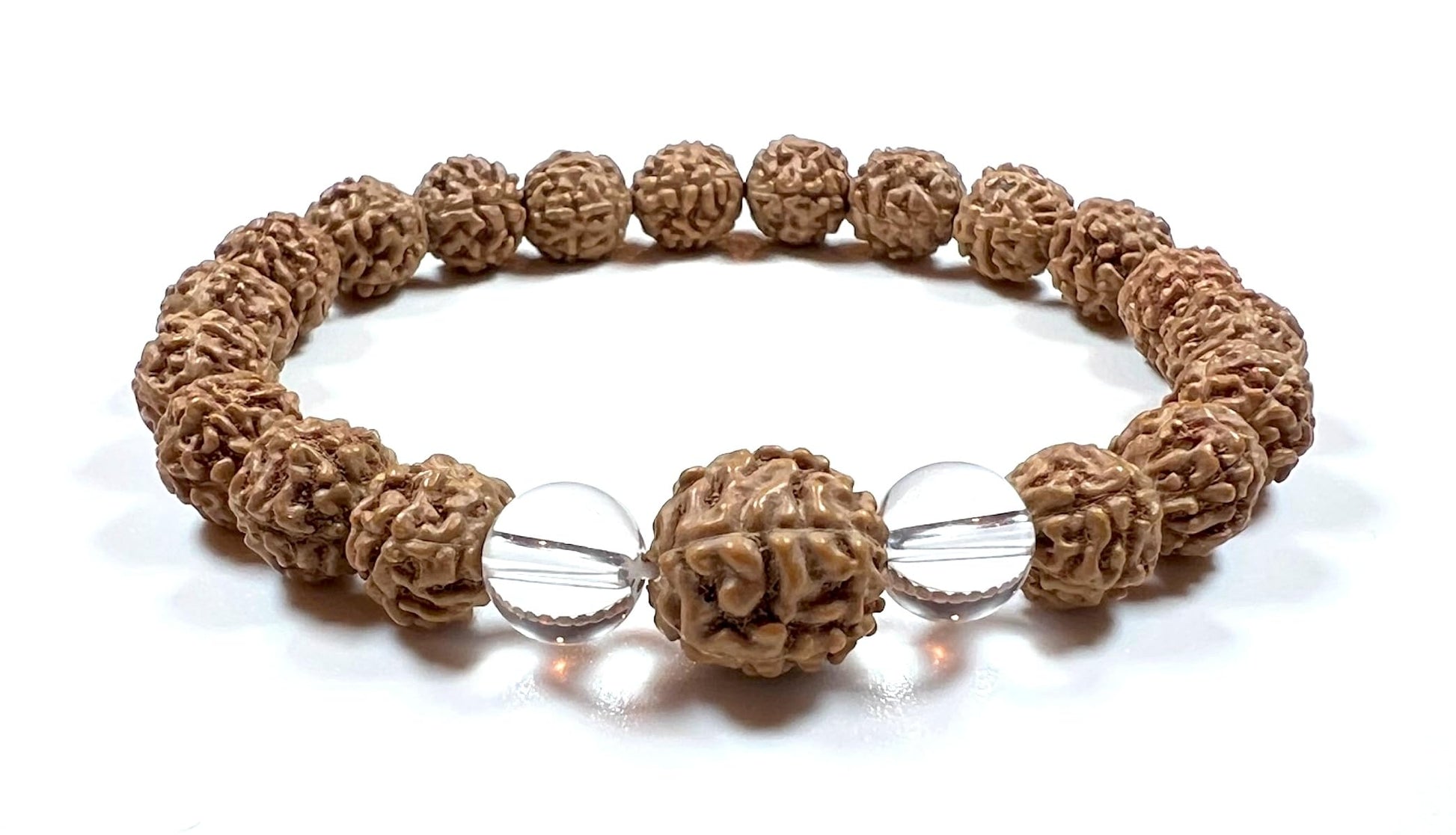 - Handmade in USA. Unleash your inner power with this divine stretch bracelet! Featuring a potent combination of 8mm 5 Mukhi Rudraksha beads and 8mm Crystal Quartz beads, crowned by a powerful 10mm 7 Mukhi Rudraksha bead, this bracelet offers a harmonious blend of spiritual energy and grounding. Crystal Quartz, often associated with the zodiac sign Taurus and considered the April birthstone, amplifies the energy of the Rudraksha beads.