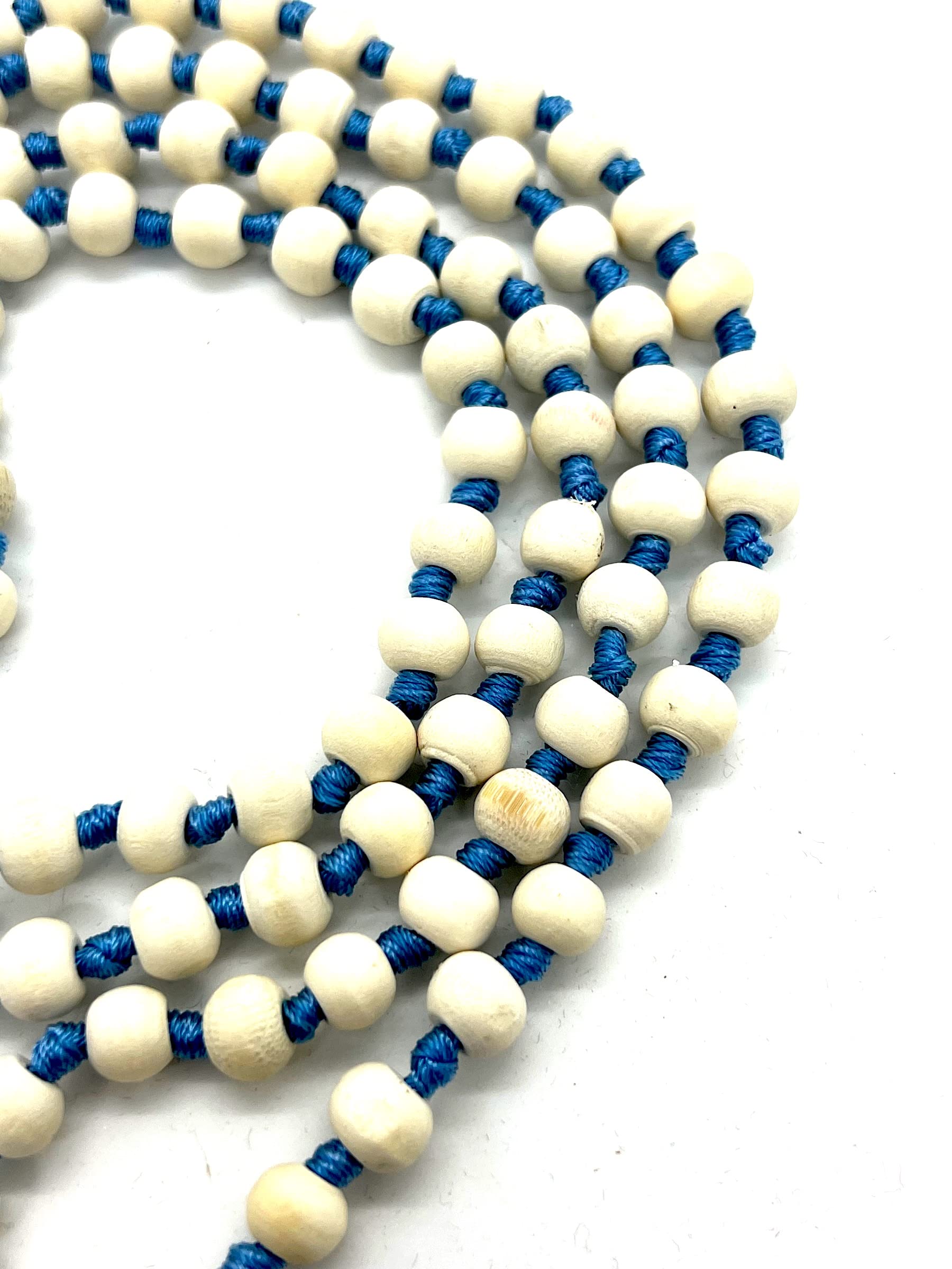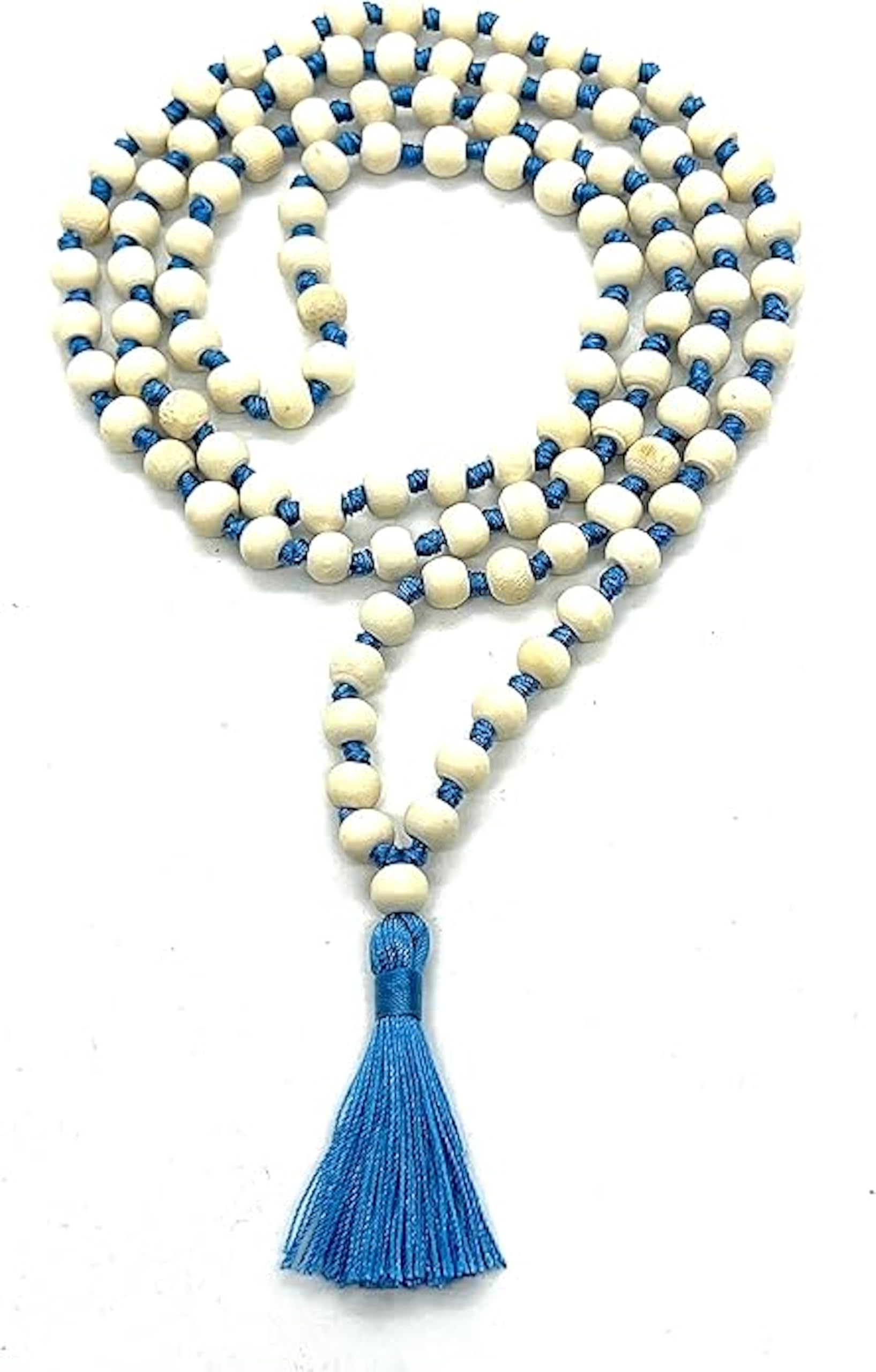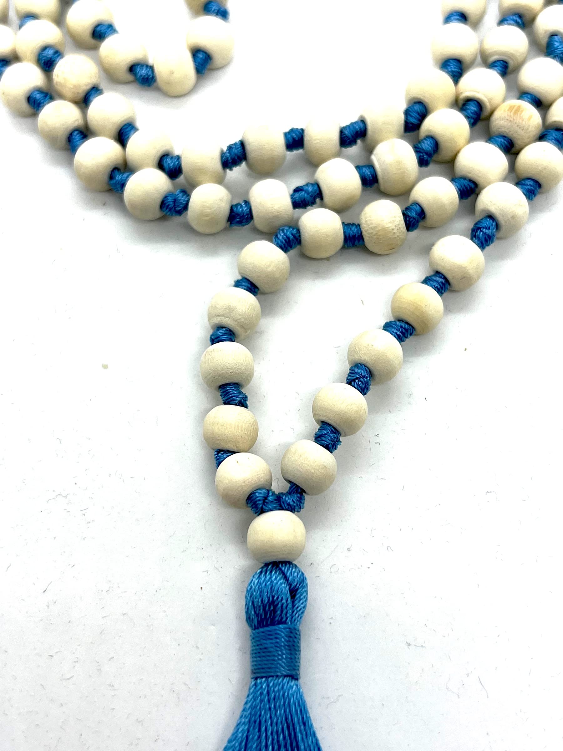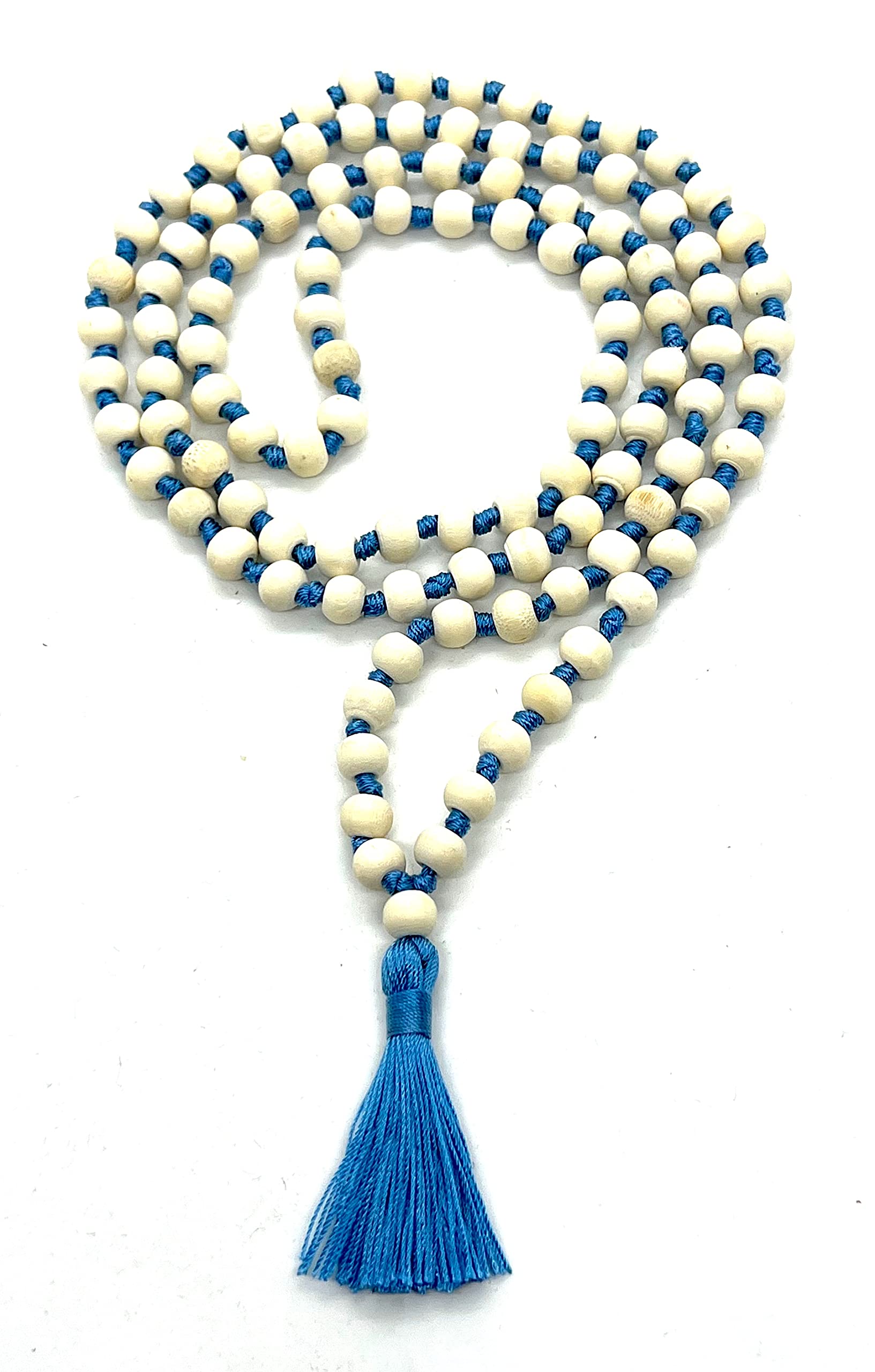 - Style and Significance. This Hand Knotted 8mm Tulsi Mala Necklace is a unique blend of traditional spirituality and modern elegance. The sky blue string and tassel make it a standout piece for meditation, prayer, or everyday wear. It is designed to enhance your spiritual journey while adding a stylish touch to your look.