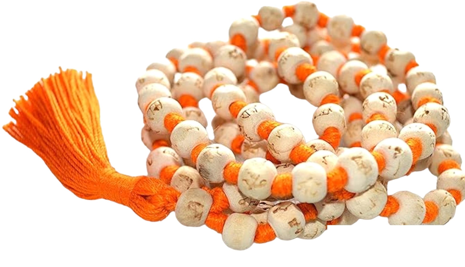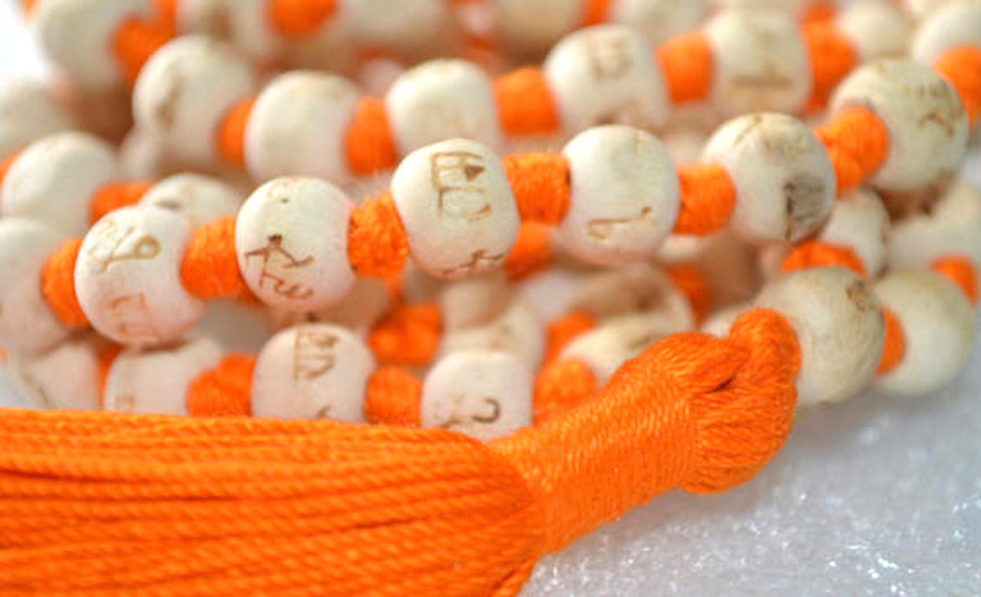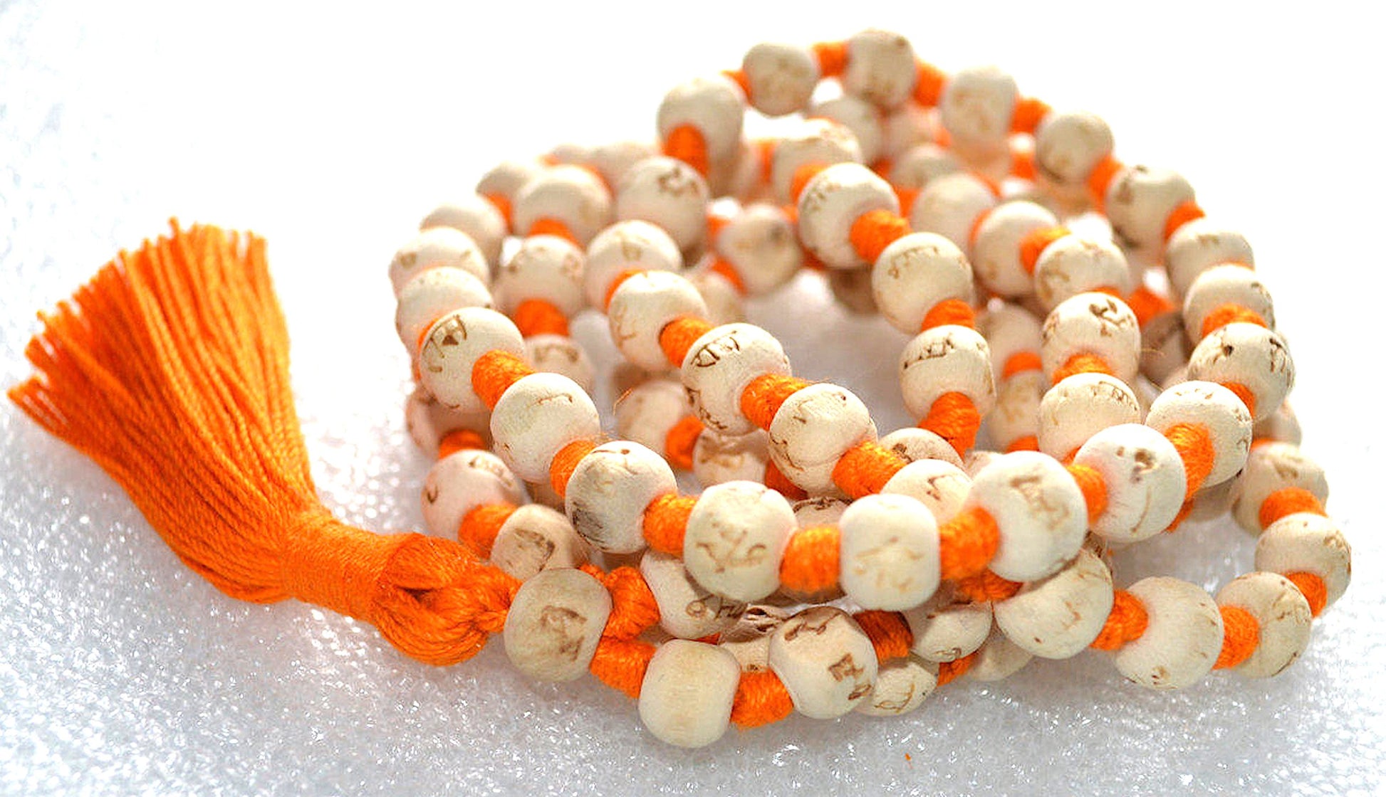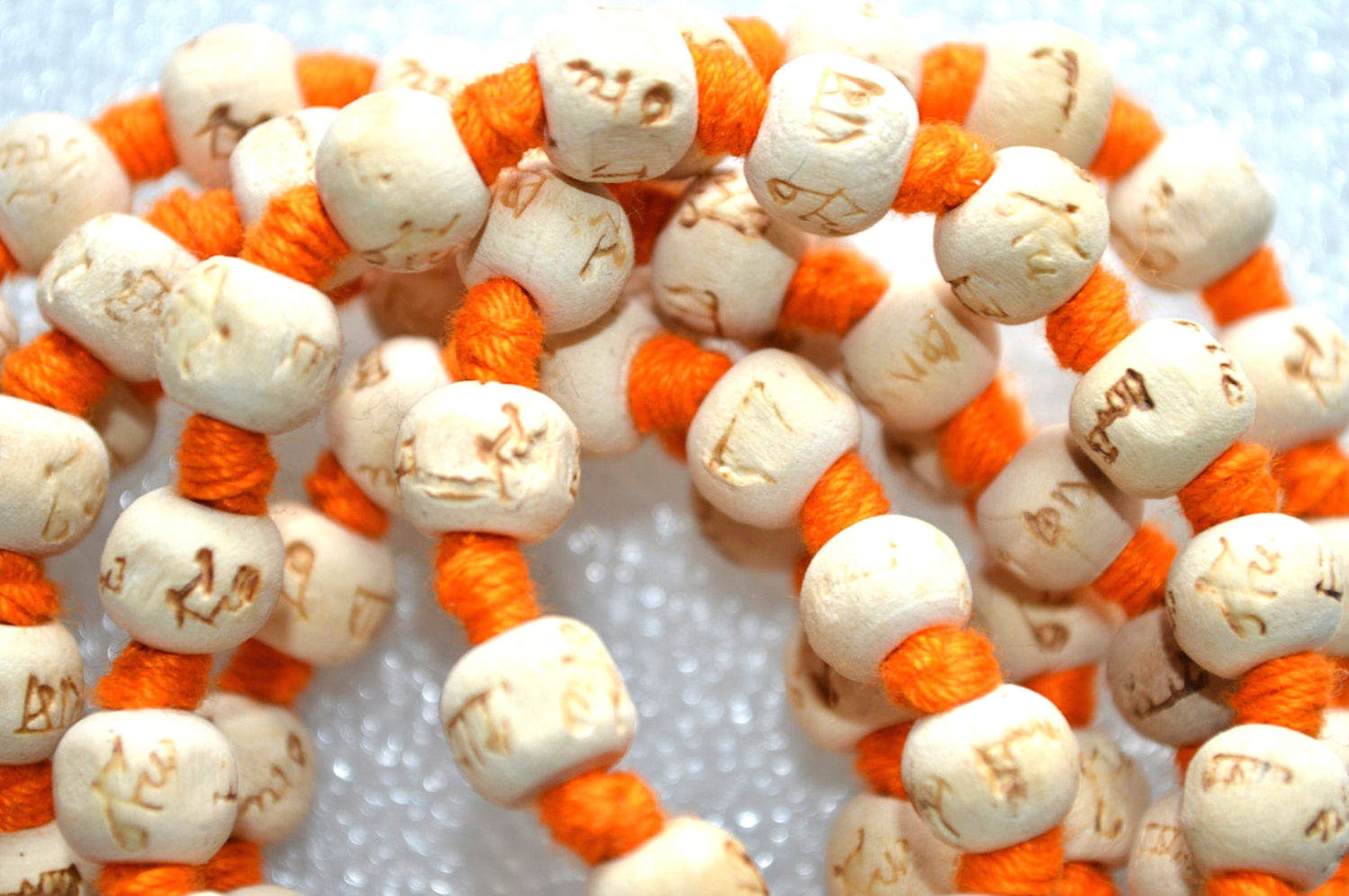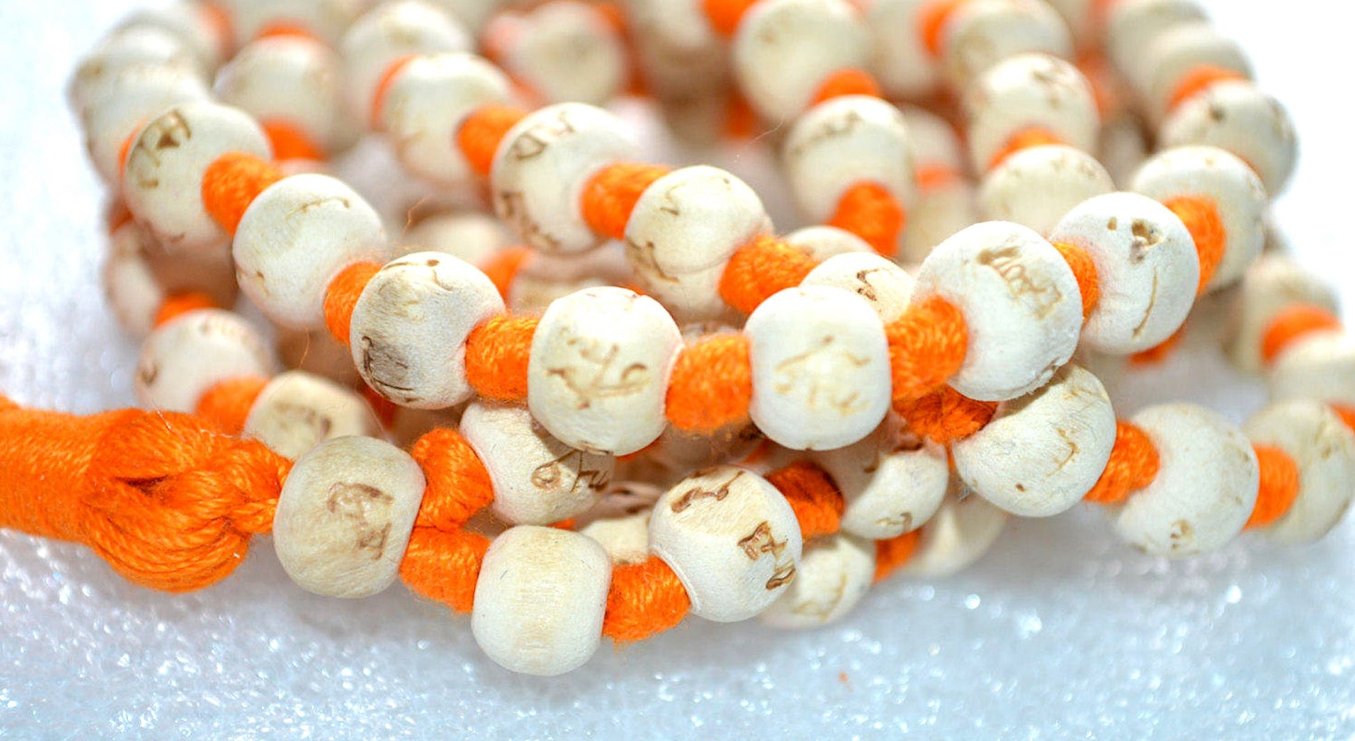 - Style and Significance. Our Hand Knotted 8mm Tulsi Mala Necklace is a fusion of tradition and style. The "Ram" engraving on each bead, paired with the vibrant orange string, makes this mala stand out as both a spiritual tool and a statement piece. Ideal for meditation, prayer, or daily wear, it is a testament to spiritual elegance.