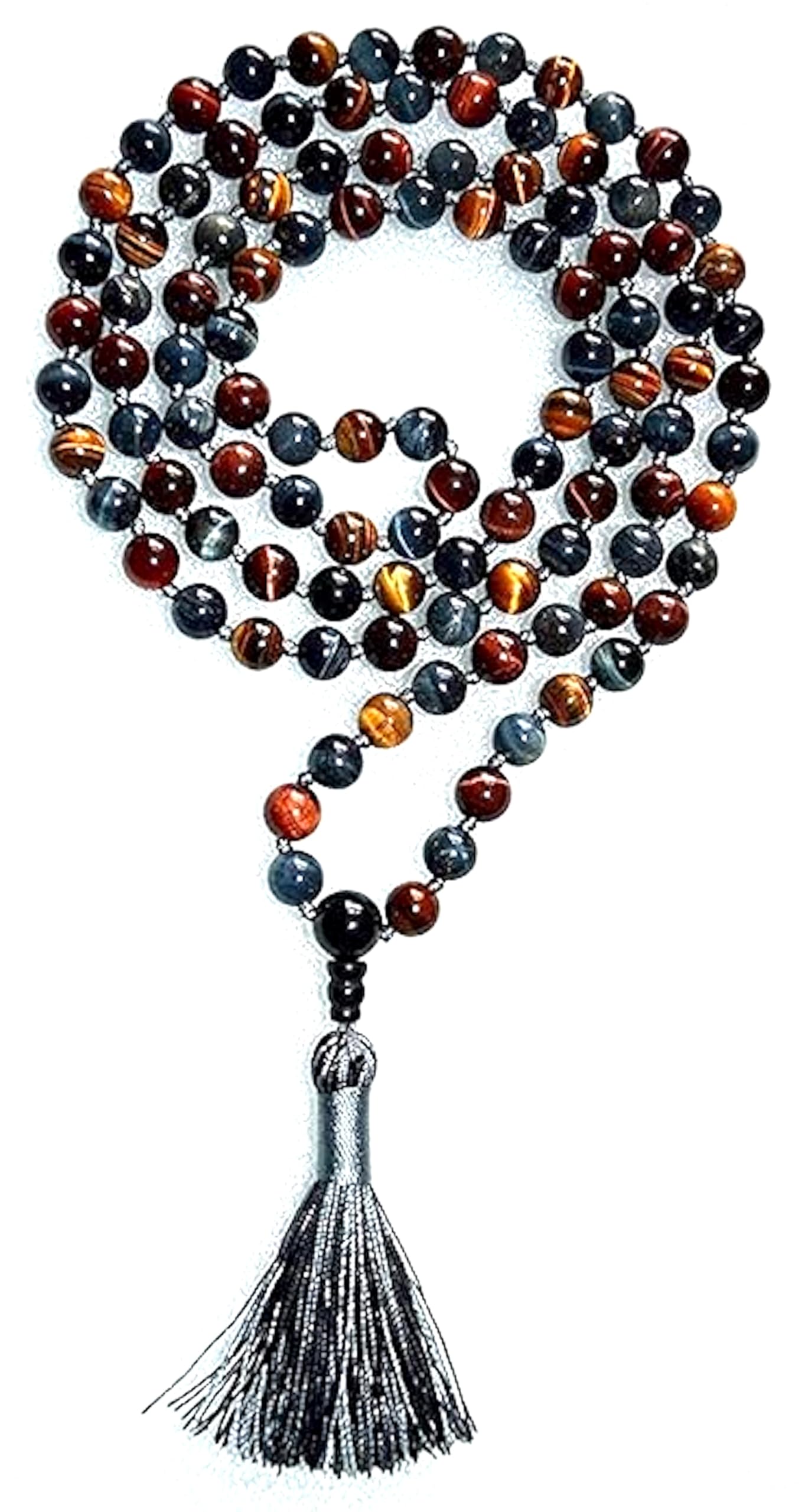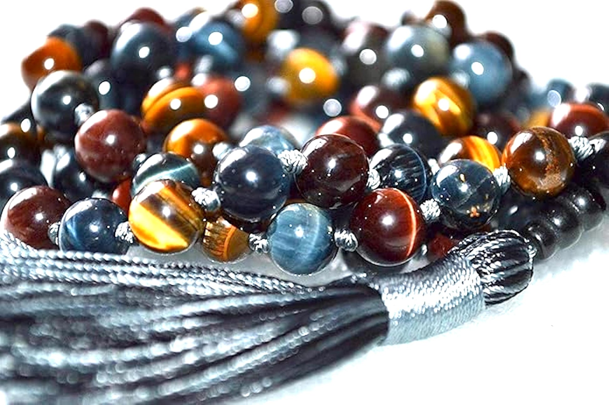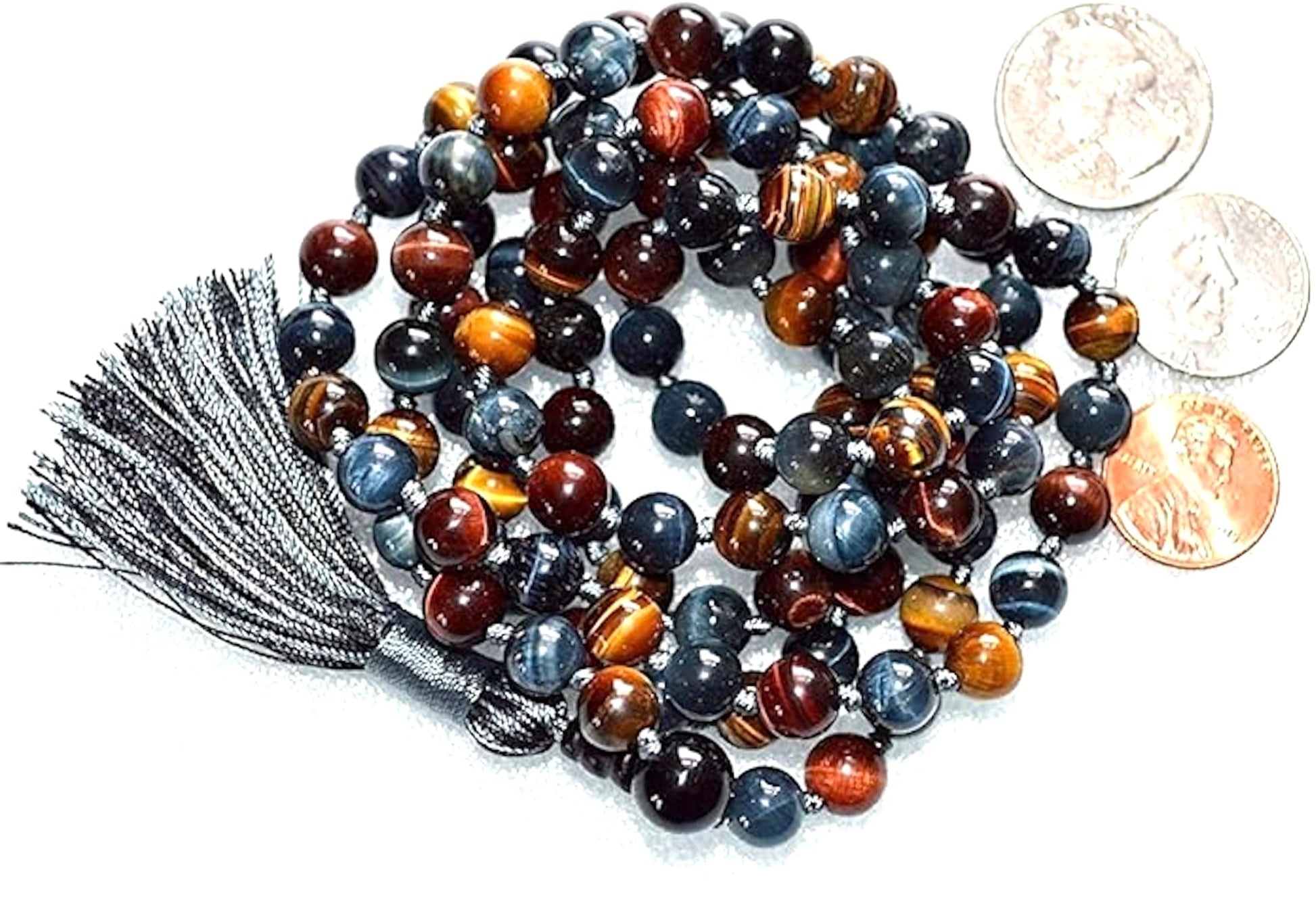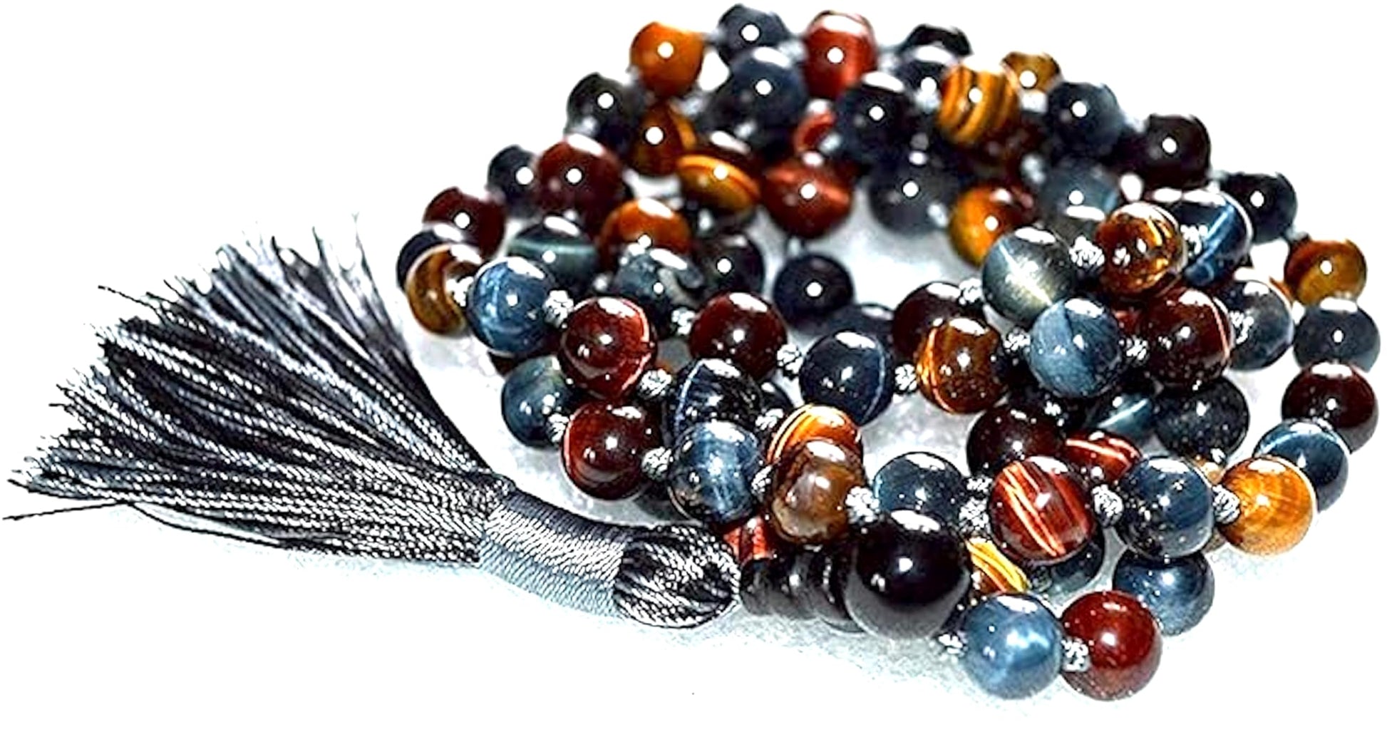 - Discover the unique blend of vibrant colors and spiritual significance with our 8mm Multi-Color Tiger's Eye and Hawk's Eye Mala Necklace. Expertly handcrafted, this mala features 108 beads of striking multi-color Tiger's Eye and Hawk's Eye, each bead meticulously selected for its natural beauty and spiritual properties.