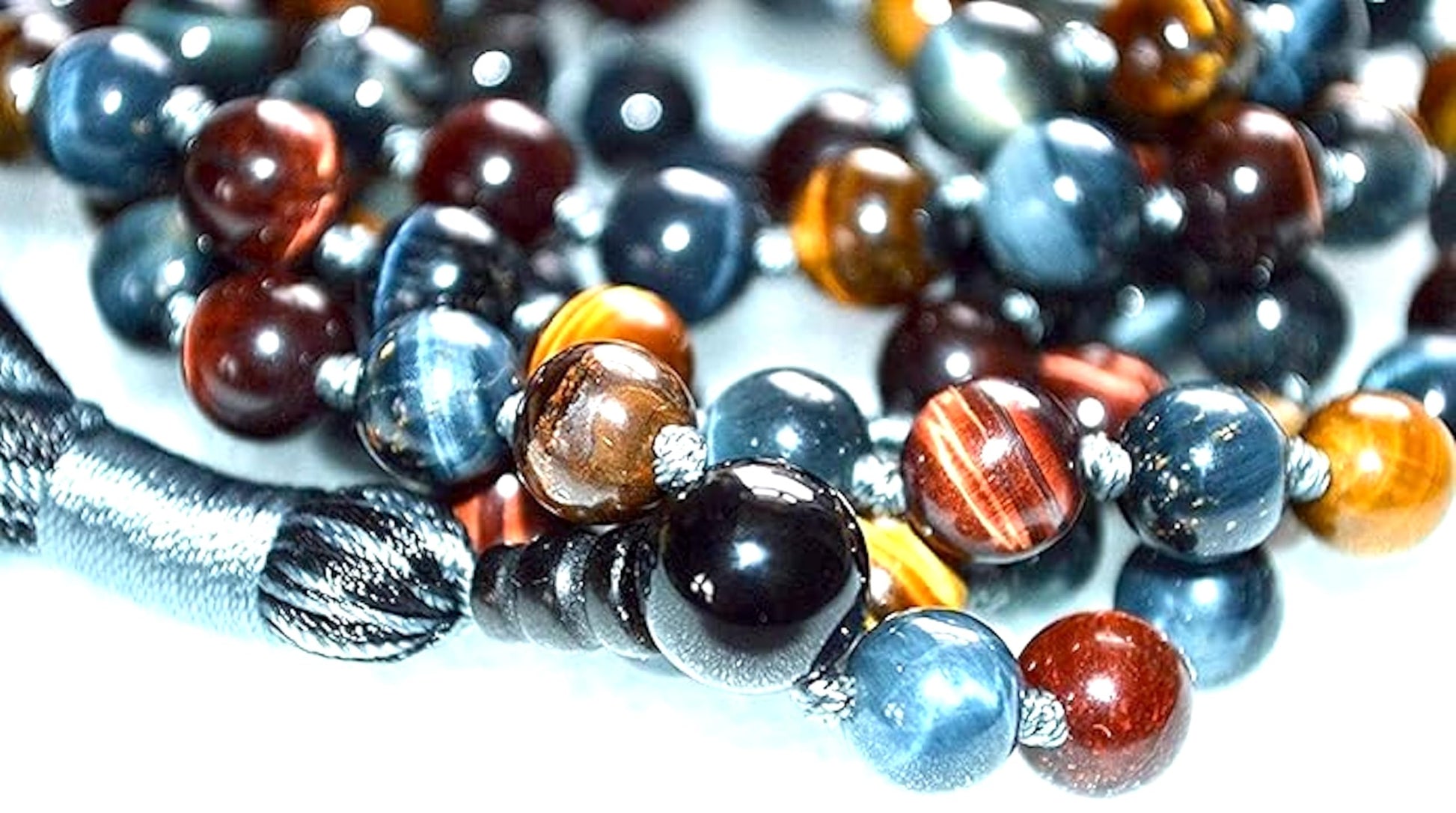 - Key Features: Materials: 8mm Multi-Color Tiger's Eye and Hawk's Eye beads. Bead Count: 108 beads. Design: Hand-knotted for durability and comfort. Birthstone: Tiger's Eye (Universal Birthstone for All Signs), Hawk's Eye (Universal Birthstone for All Signs). Chakra Association: Root Chakra (Tiger's Eye), Third Eye Chakra (Hawk's Eye).