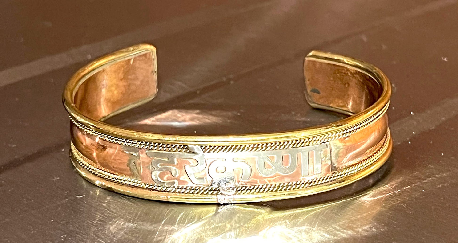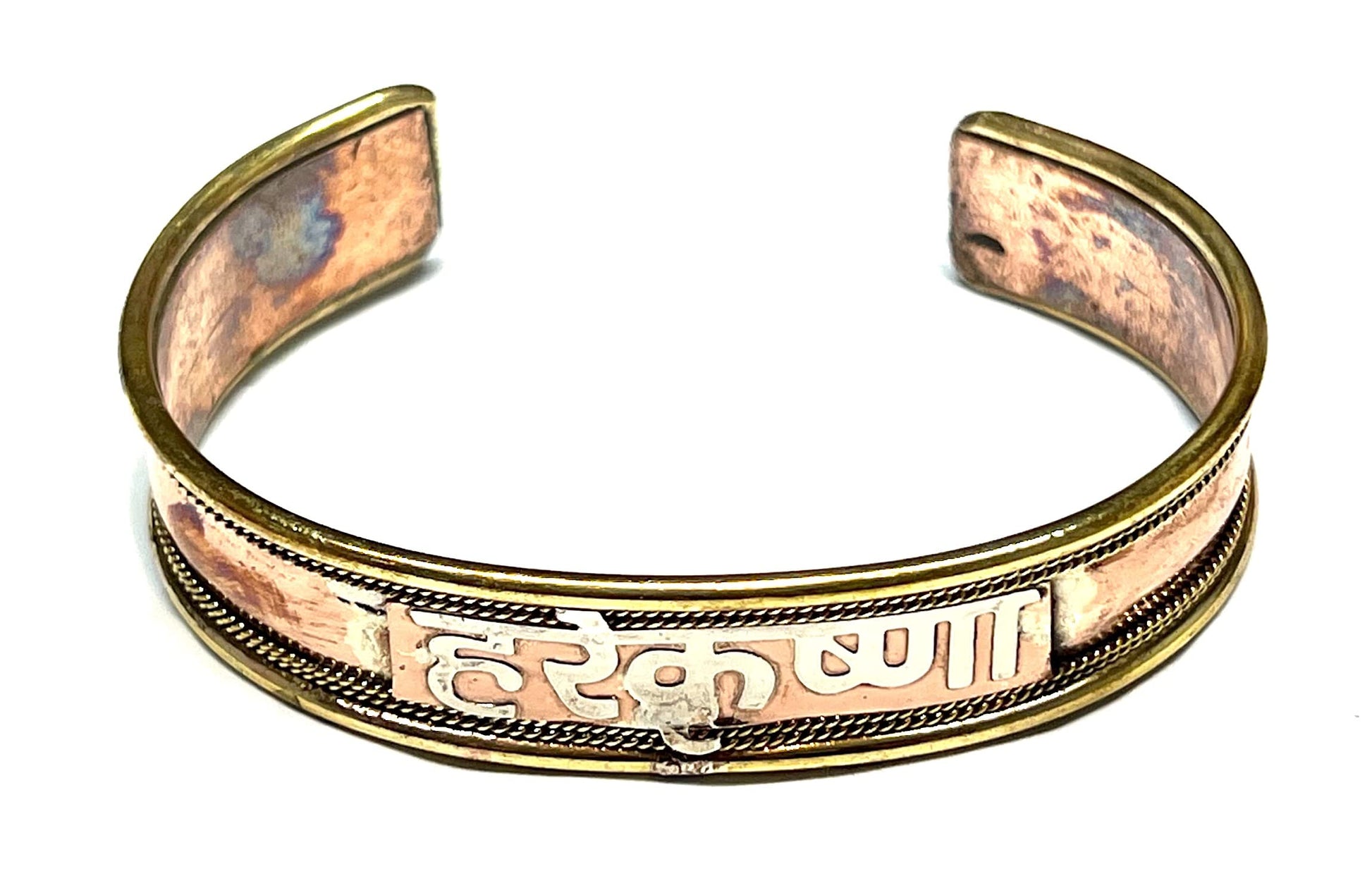 - Embrace Tradition, Grounded Energy & Positive Mantras Embrace your inner strength and connect with tradition while chanting the sacred Hare Krishna mantra with our captivating Copper Brass Cuff Bangle Bracelet. This beautiful bangle, crafted from gleaming copper and brass, features the powerful Hare Krishna mantra, inviting peace and grounding energy into your life. The wide 14mm design ensures a bold statement on your wrist.