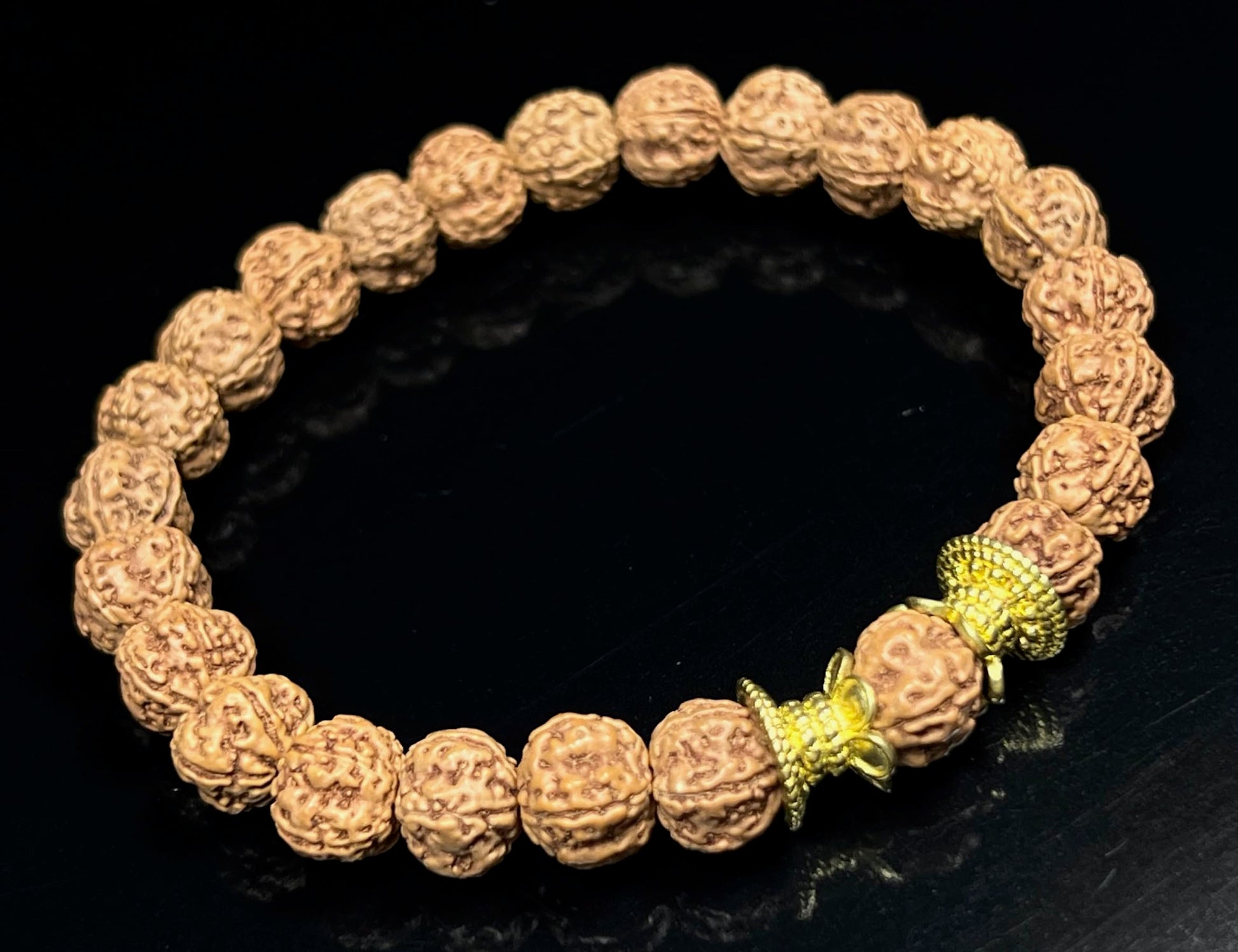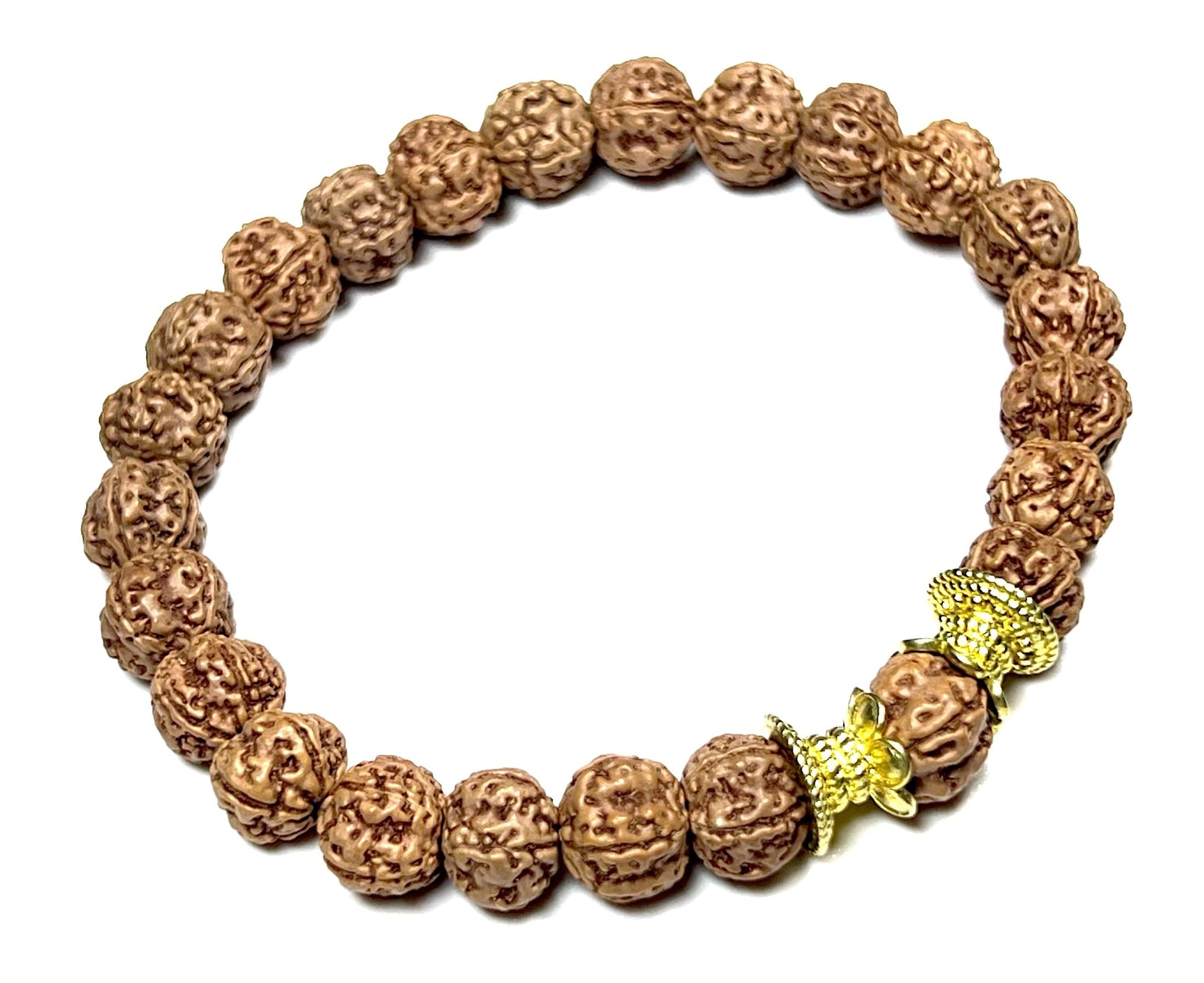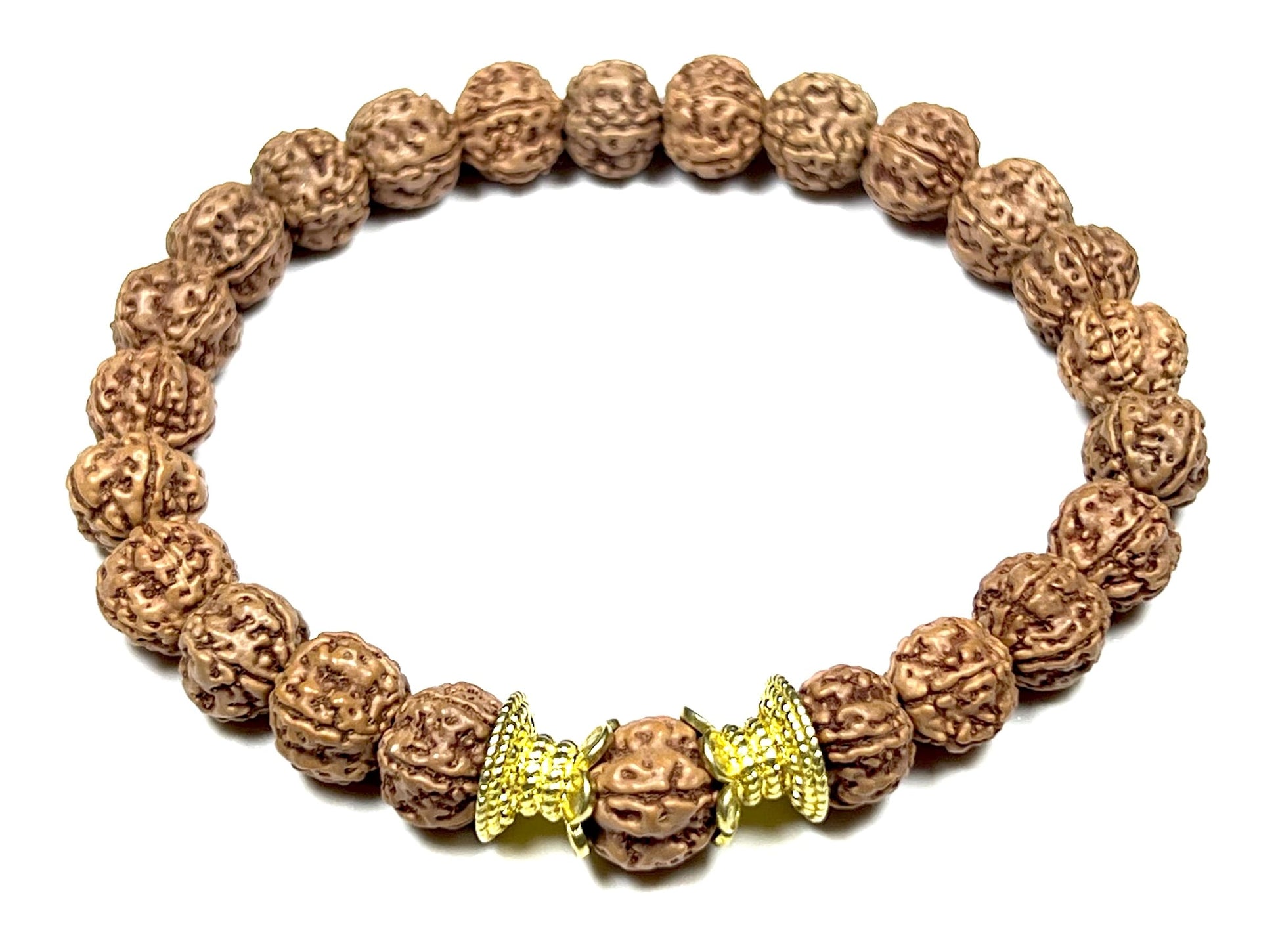 - Embrace Grounding Energy & Find Inner Peace Deepen your connection to your inner strength and cultivate a sense of stability with this beautiful, handmade stretch bracelet. Featuring substantial 10mm Rudraksha seeds accented with sleek, golden tone polished alloy spacers, this piece offers a stylish and meaningful way to promote Root Chakra balance and spiritual well-being (approximately 7.5 inches wrist size)