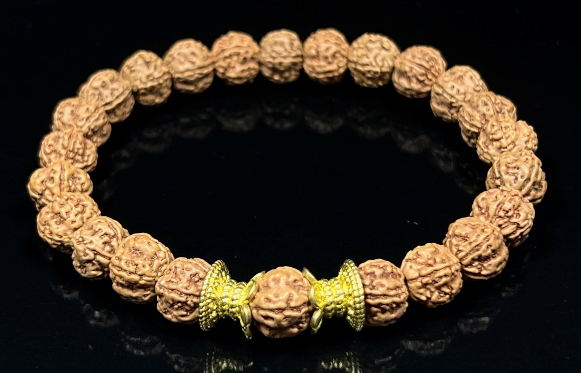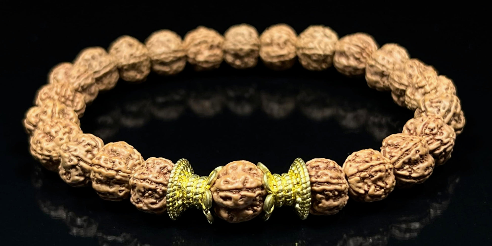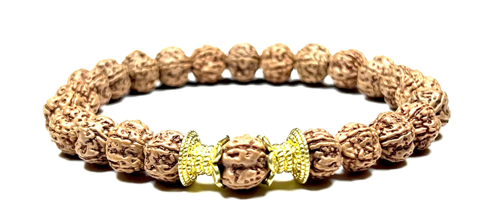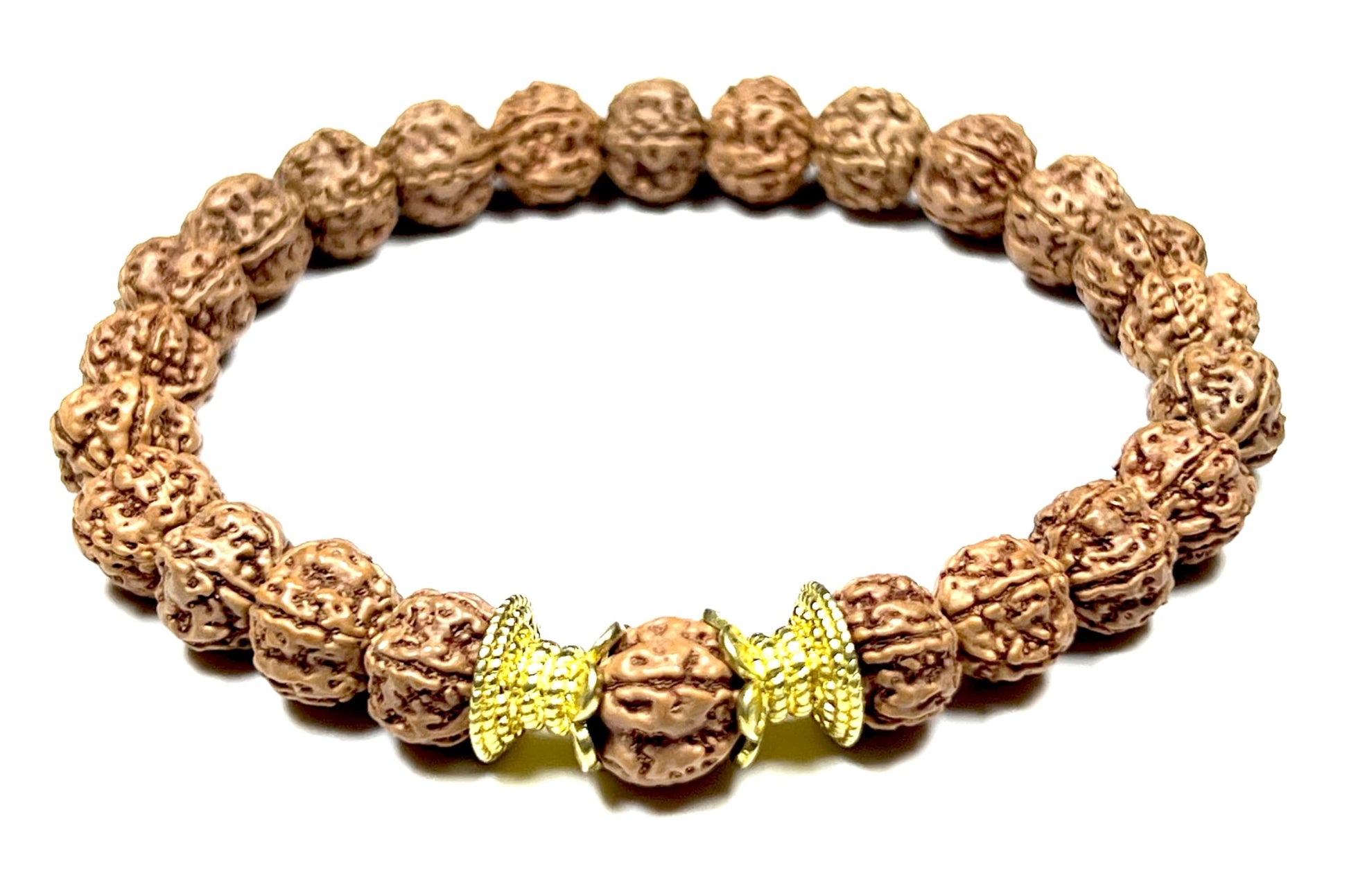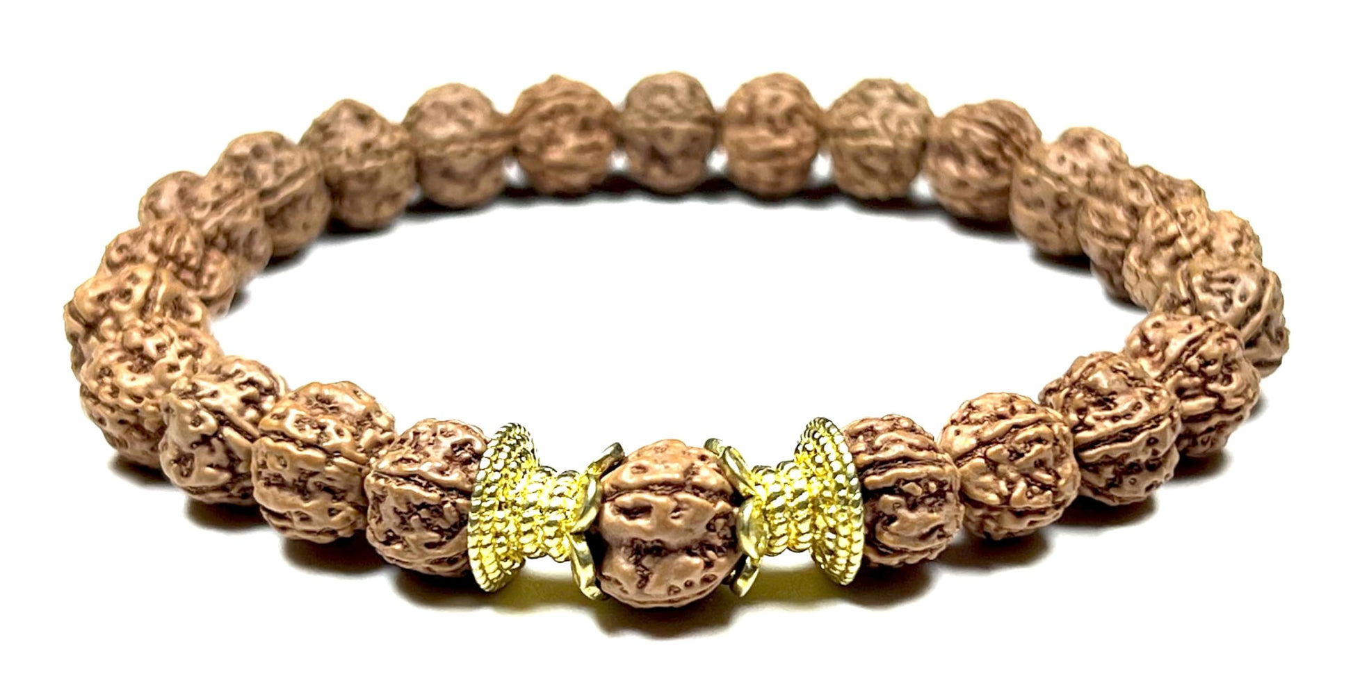 - Stylish & Bold: The larger 10mm Rudraksha beads create a bold and eye-catching statement piece, perfect for everyday wear or meditation practice. Product Specifications: Material: Genuine Rudraksha Beads (8mm), Golden Tone Polished Alloy Spacers Wrist Size: Approximately 7.5 inches (stretchy design for some adjustability) Style: Stretch Bracelet
