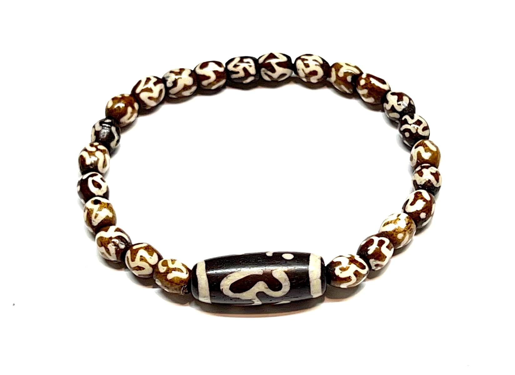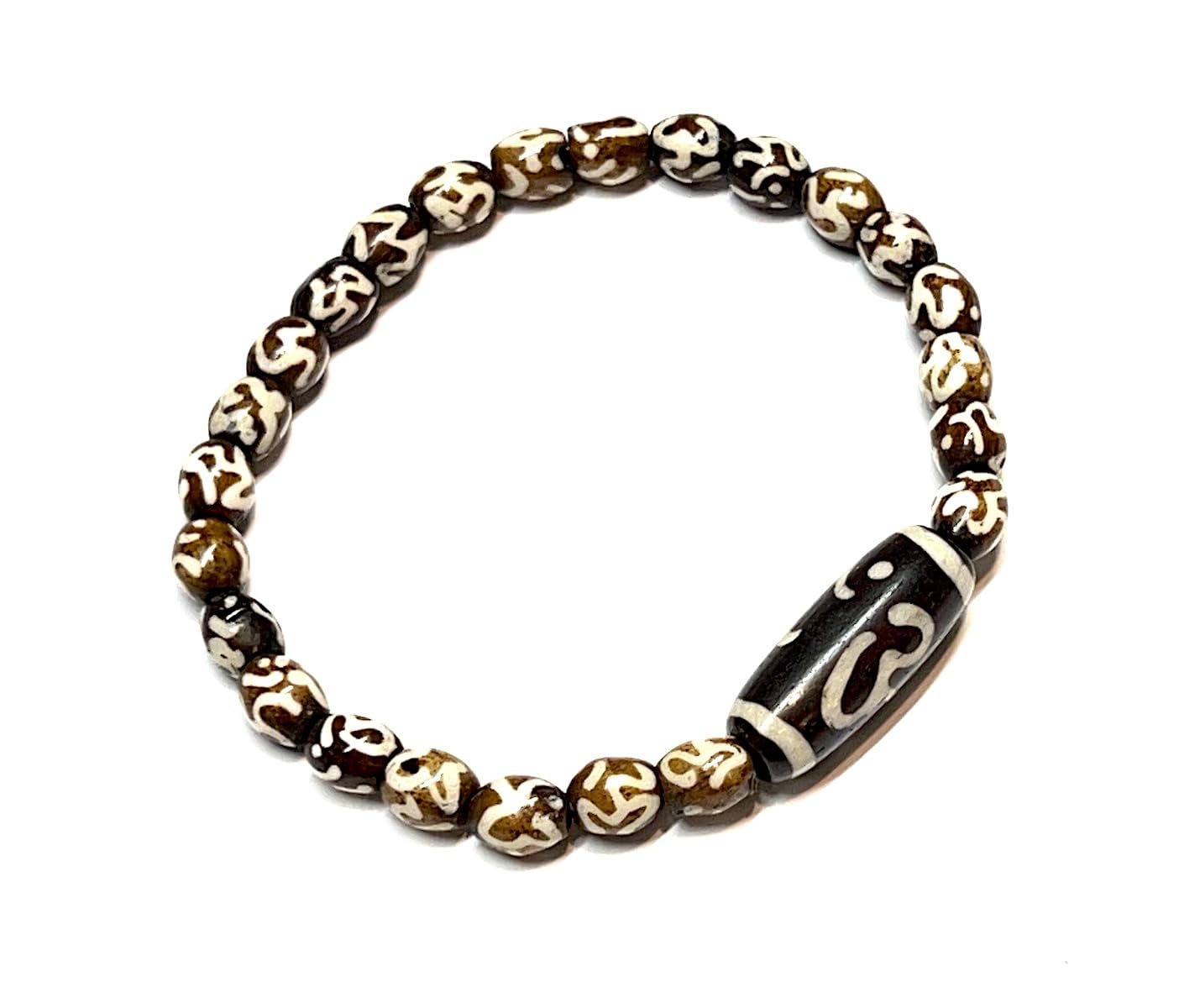 - The Bracelet is extremely MAGICAL AND AUSPICIOUS for helping in all problems, Inner doshas, stress, worries, health problems and insomnia. This unique quality unisex Elastic band bracelet with some having AUM OR OM inscribed/enameled in Hindi on each scared wood bead, was made by master craftsmen in the Kingdom of Nepal. The beads in between adds to the beauty of this bracelet.