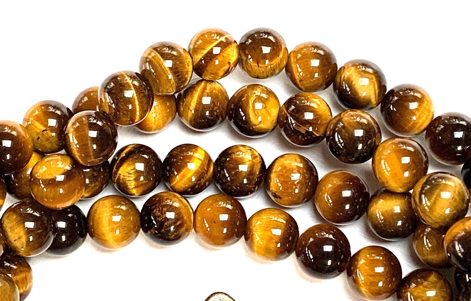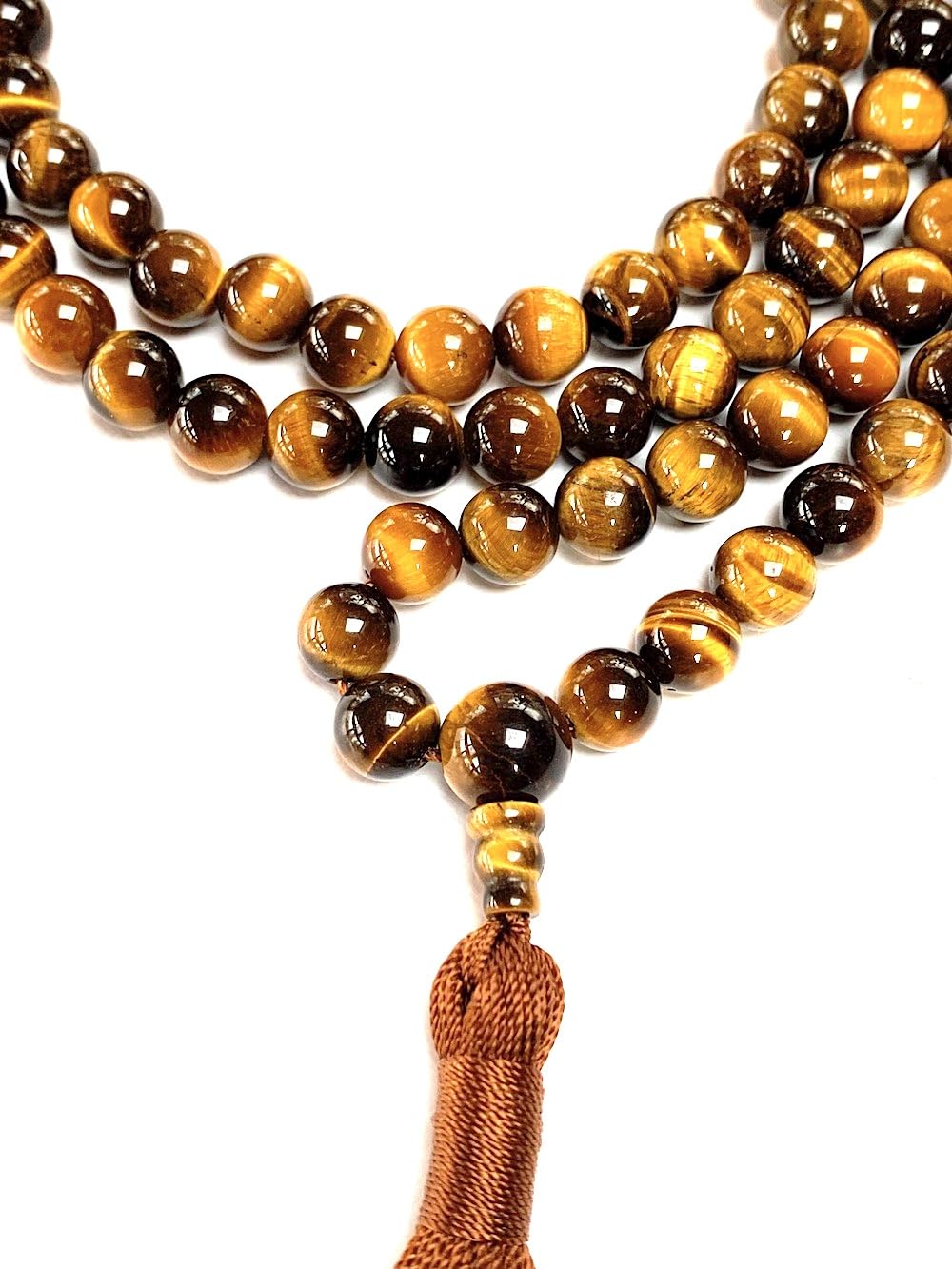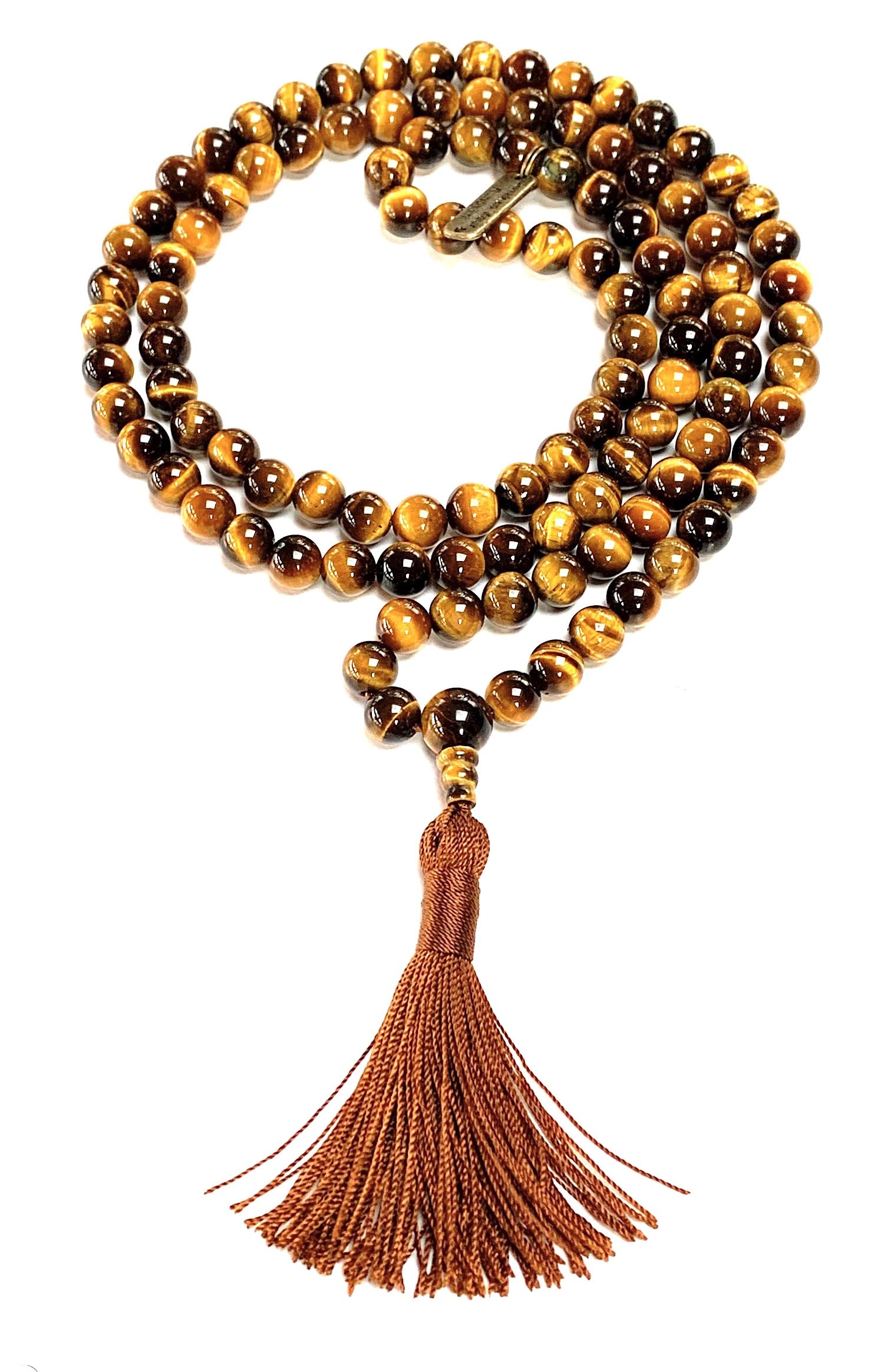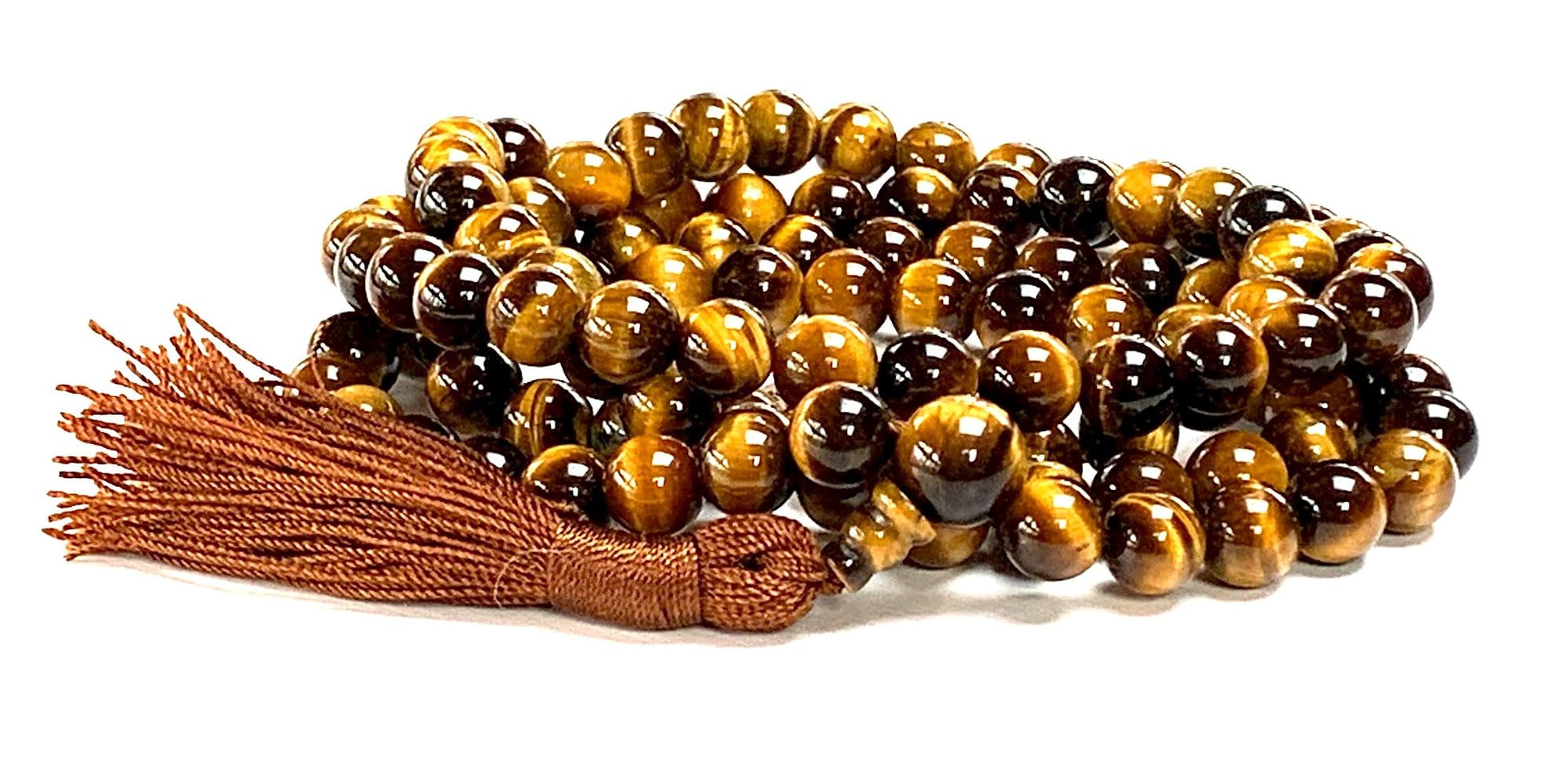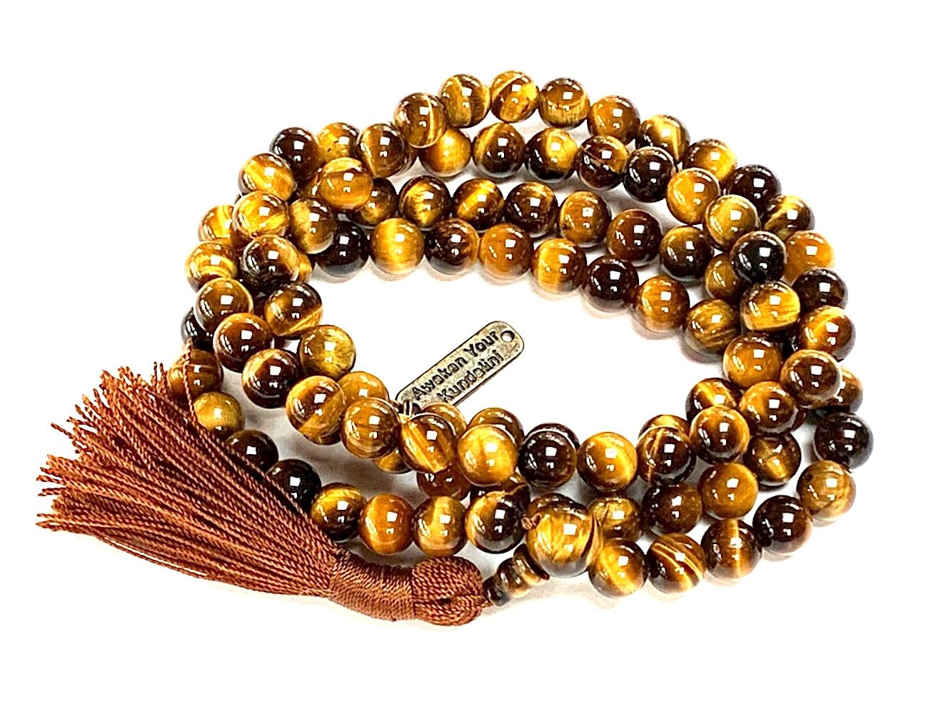 AWAKEN YOUR KUNDALINI Tiger's Eye Mala Beads Necklace - 3rd Chakra Throat Chakra 108 Prayer Beads - Grounding, Will Power, Intuition
