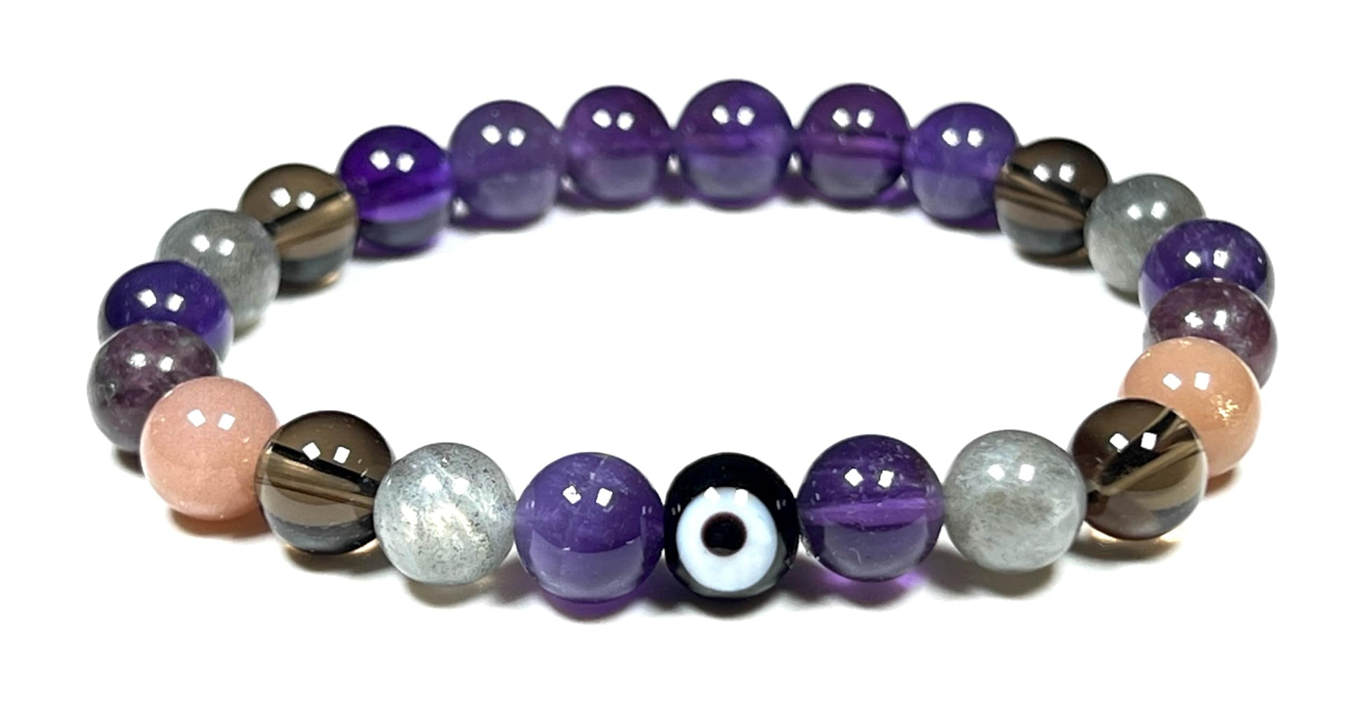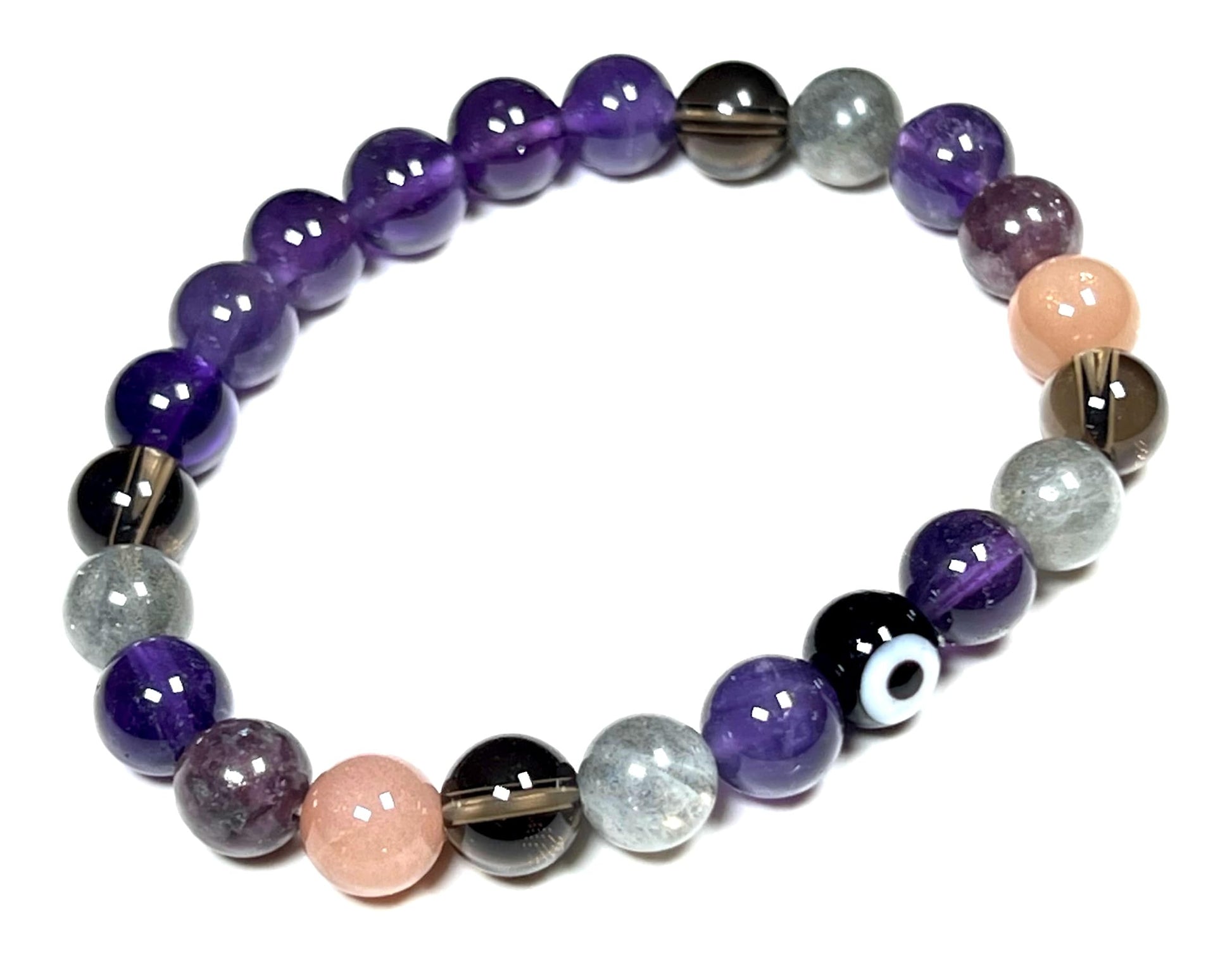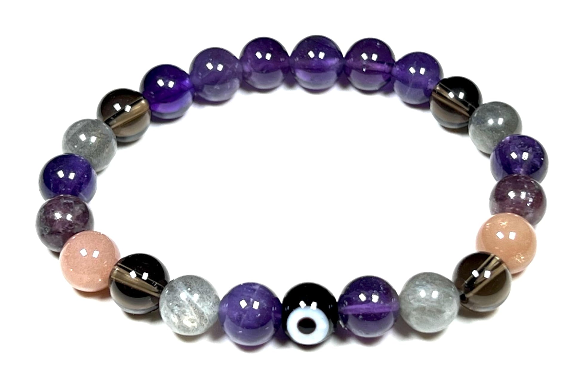 AWAKEN YOUR KUNDALINI Tranquility and Emotional Balance Stretch Bracelet, Evil Eye, Rose Quartz, Amethyst, Smoky Quartz, Labradorite, Charoite