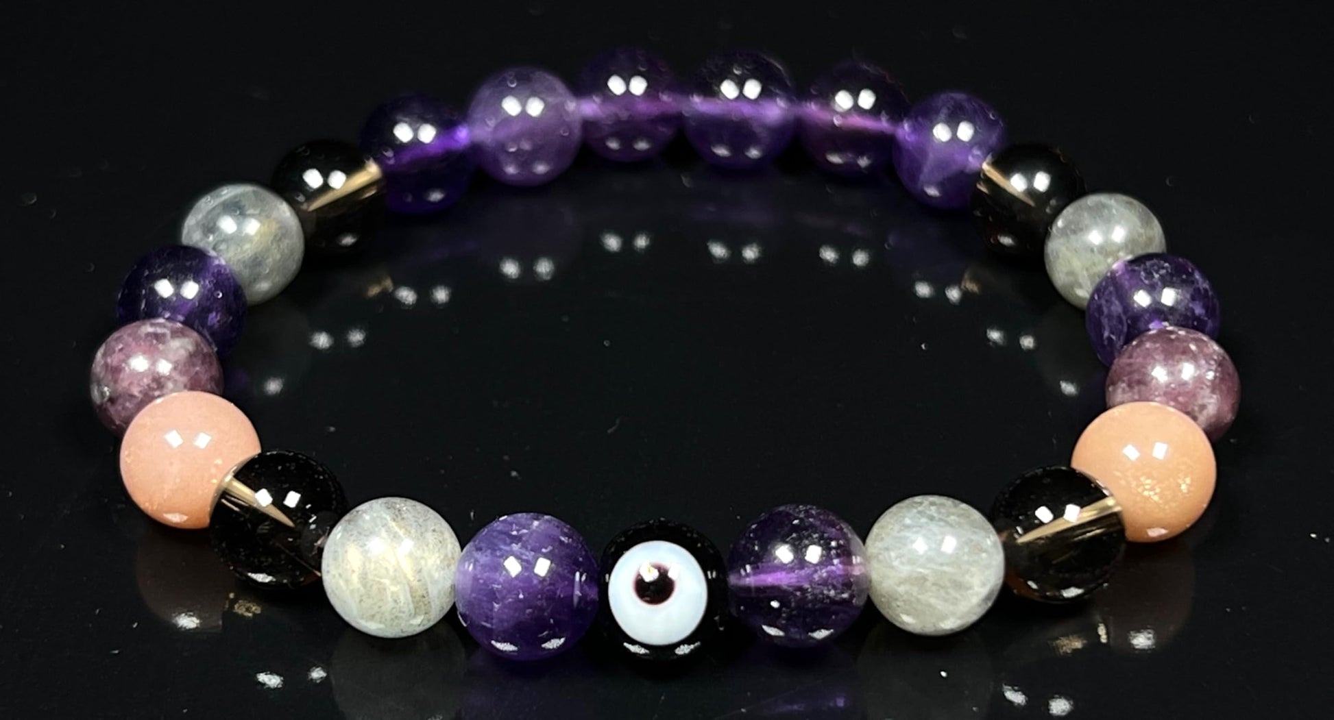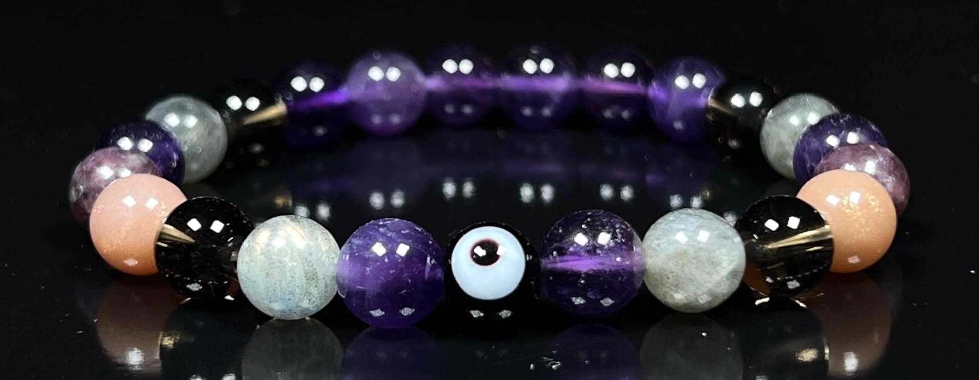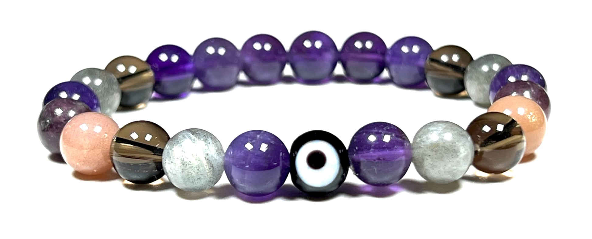 AWAKEN YOUR KUNDALINI Tranquility and Emotional Balance Stretch Bracelet, Evil Eye, Rose Quartz, Amethyst, Smoky Quartz, Labradorite, Charoite