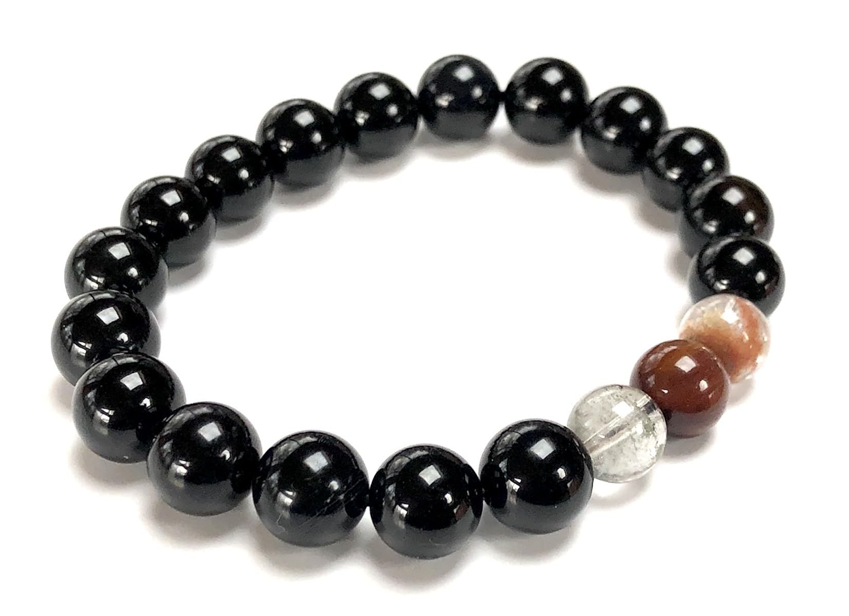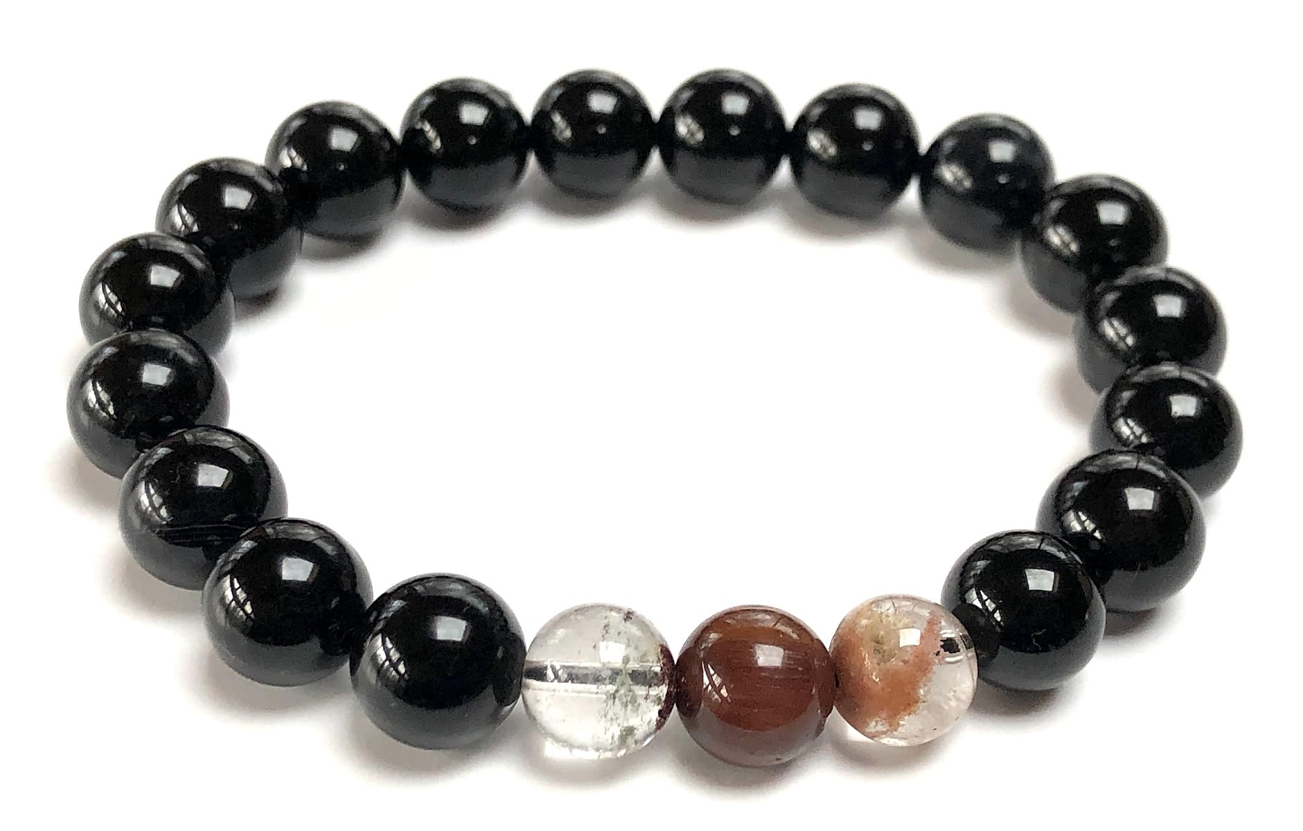 - Black tourmaline is a grounding stone often associated with the root chakra. Its deep black hue pairs beautifully with the mystical energy of Super Seven gemstones. Known for their combination of seven minerals, Super Seven stones bring a colorful yet subtle charm to this bracelet. Together, these gemstones make for a visually striking and powerful combination suitable for everyday wear.