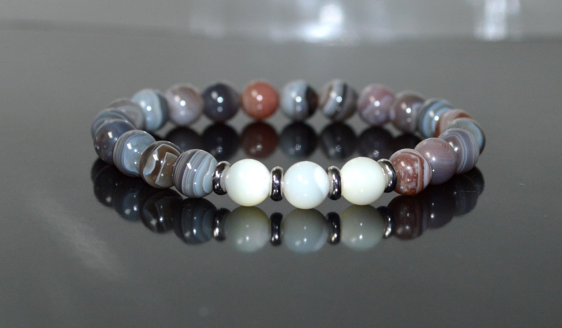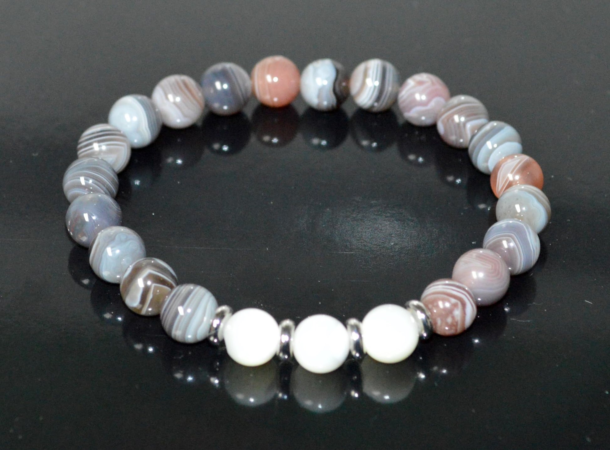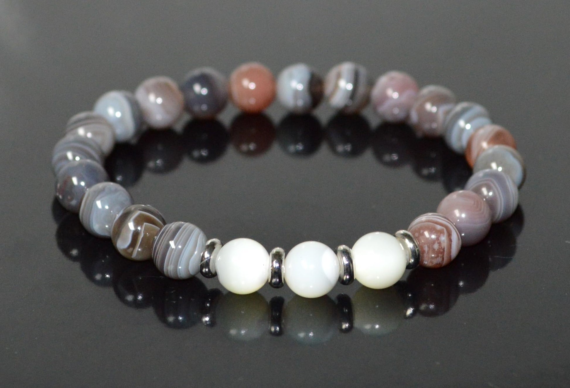 - Elevate your style with this 8mm handmade Botswana Agate and Mother of Pearl stretch bracelet. The bracelet features a harmonious blend of natural Botswana Agate and lustrous Mother of Pearl beads, elegantly separated by silver-tone alloy spacers. Designed to fit wrist sizes from 6 to 9 inches, this bracelet offers both comfort and style. The timeless design makes it a versatile accessory that pairs well with any outfit, while its spiritual associations add a meaningful touch.