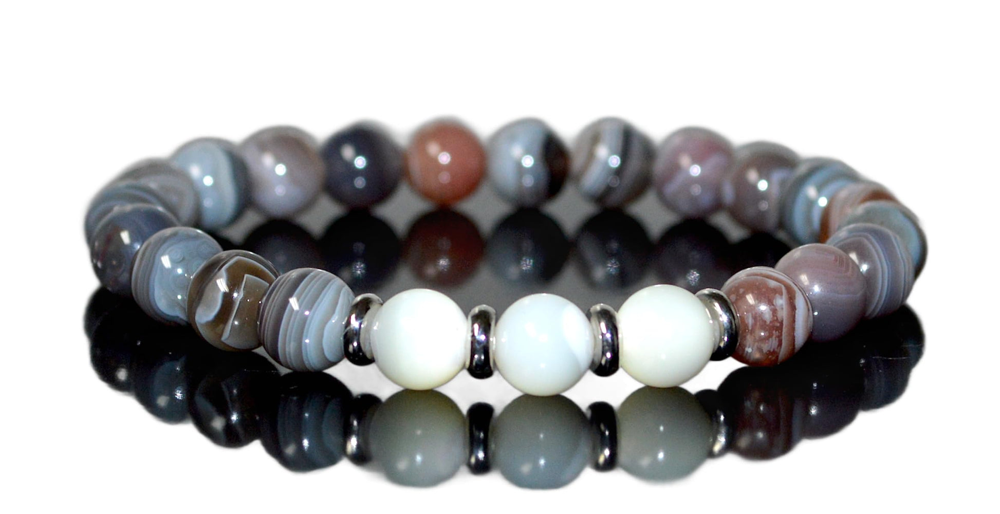 - Elevate your style with this 8mm handmade Botswana Agate and Mother of Pearl stretch bracelet. The bracelet features a harmonious blend of natural Botswana Agate and lustrous Mother of Pearl beads, elegantly separated by silver-tone alloy spacers. Designed to fit wrist sizes from 6 to 9 inches, this bracelet offers both comfort and style. The timeless design makes it a versatile accessory that pairs well with any outfit, while its spiritual associations add a meaningful touch.