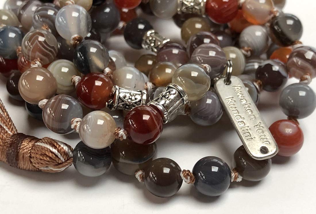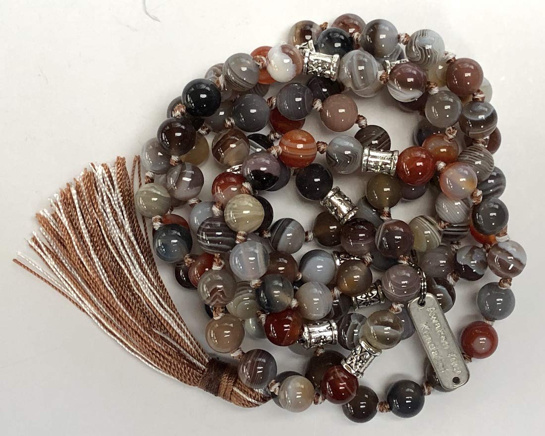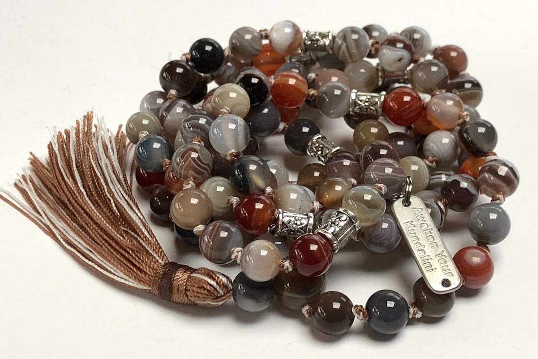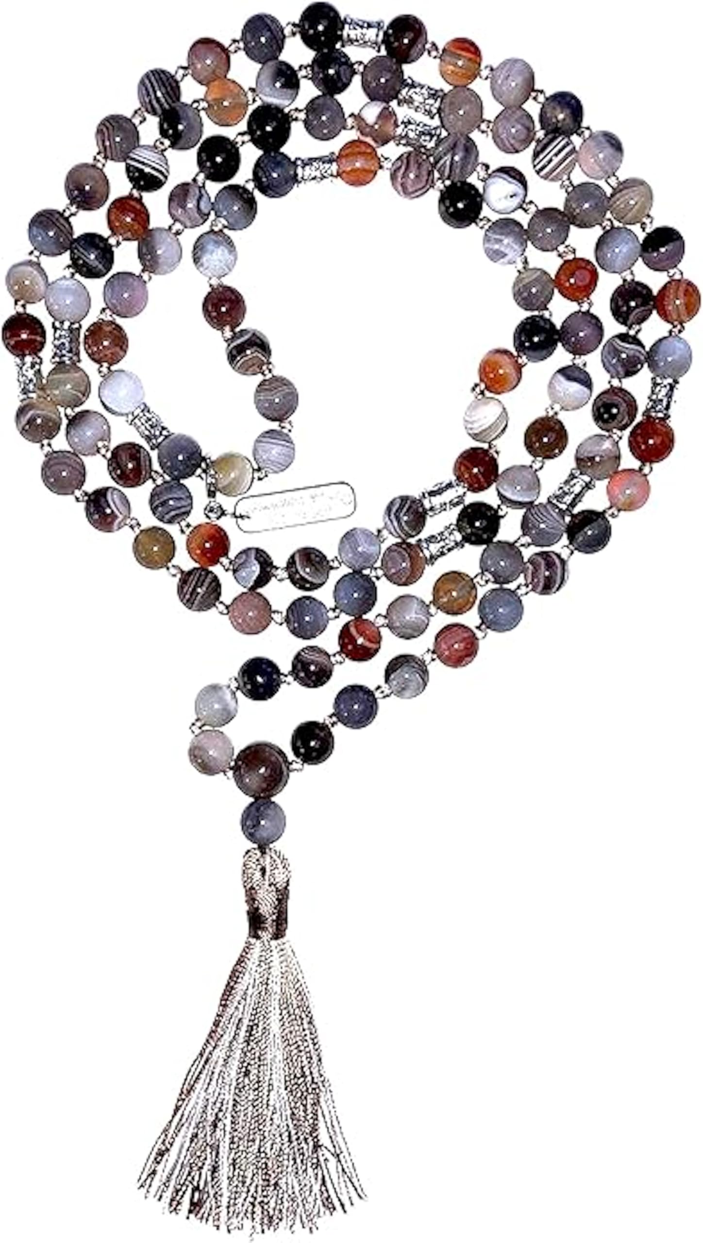 - Hand knotted in USA. Elevate your spiritual practice and style with our Hand Knotted Botswana Agate Mala Necklace. Featuring 8mm beads and elegant alloy spacers, this necklace is meticulously crafted for both aesthetic beauty and spiritual significance.
