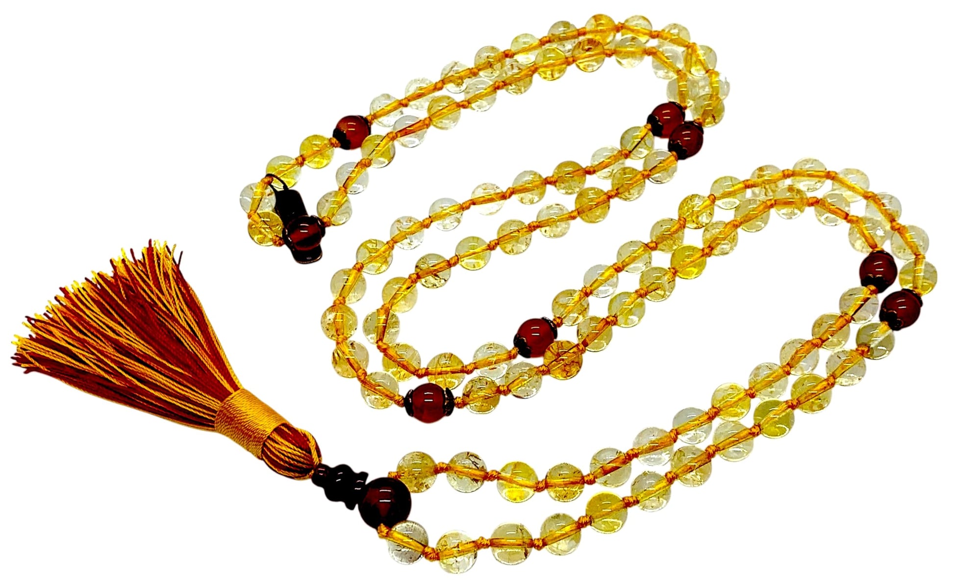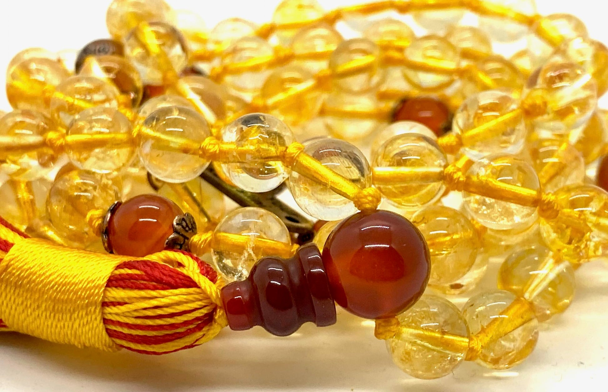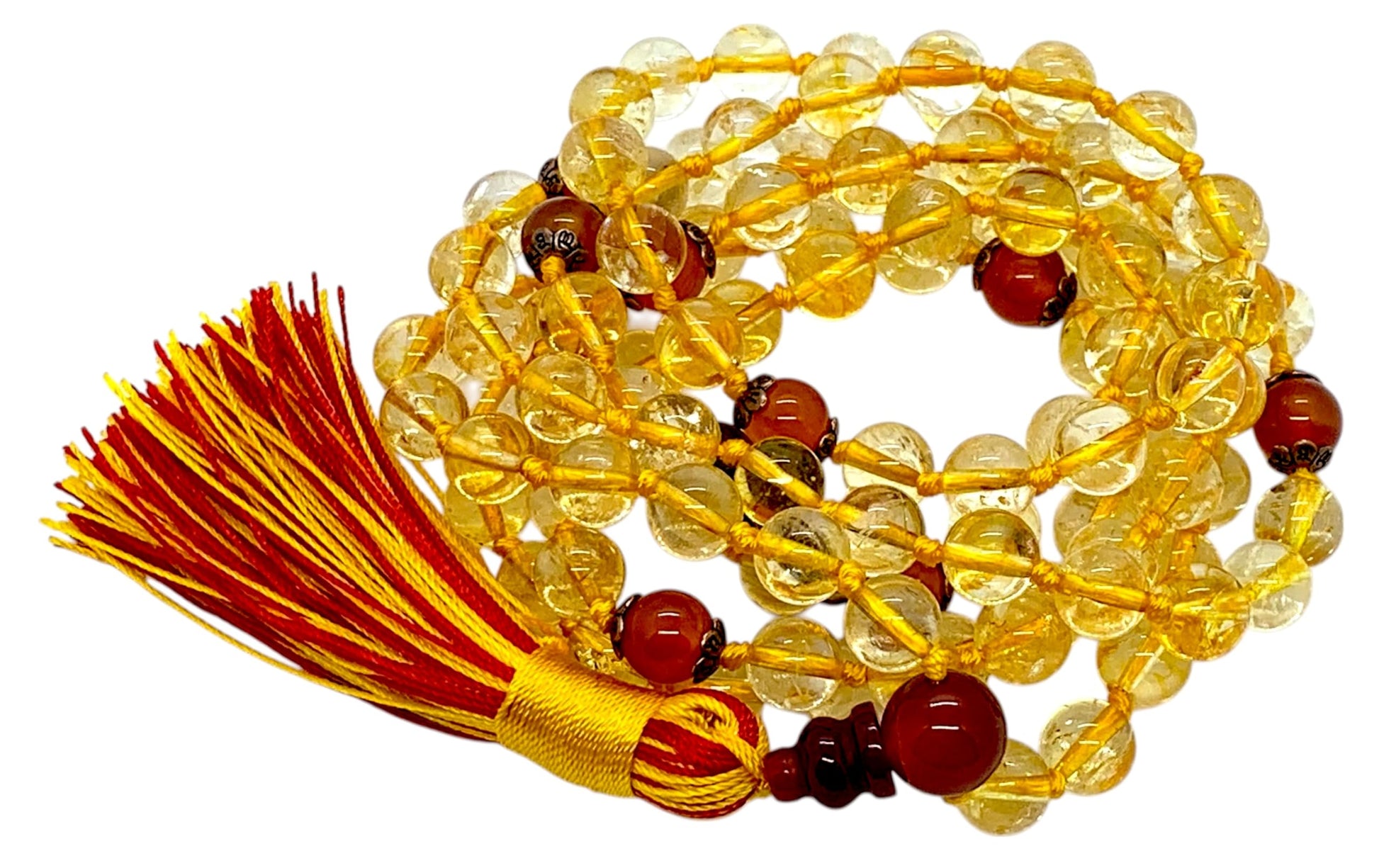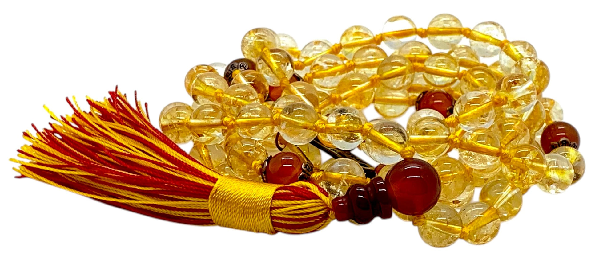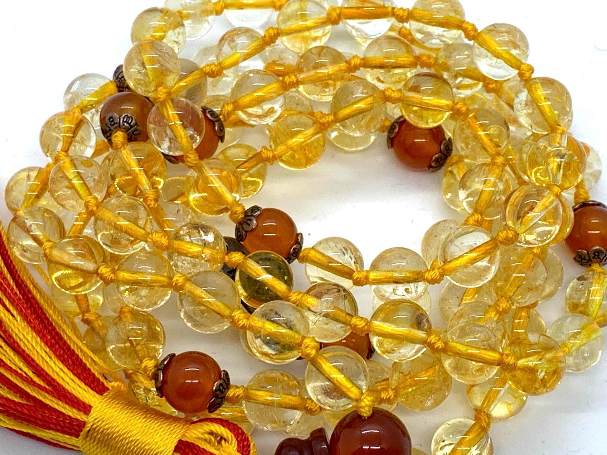 - This beautiful hand-knotted 8mm Citrine and Carnelian Mala Beads Necklace is crafted with precision and elegance, featuring 108 beads that resonate with spiritual and aesthetic significance. Citrine, the November birthstone, is known for its connection to the Sagittarius zodiac sign, while Carnelian, the July birthstone, relates to Cancer. Together, they create a harmonious balance for those seeking grounding and warmth.