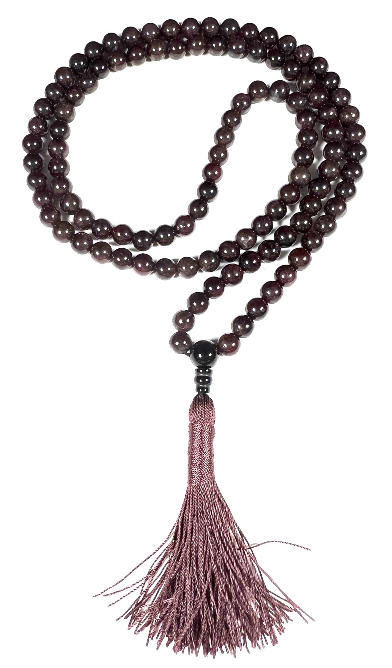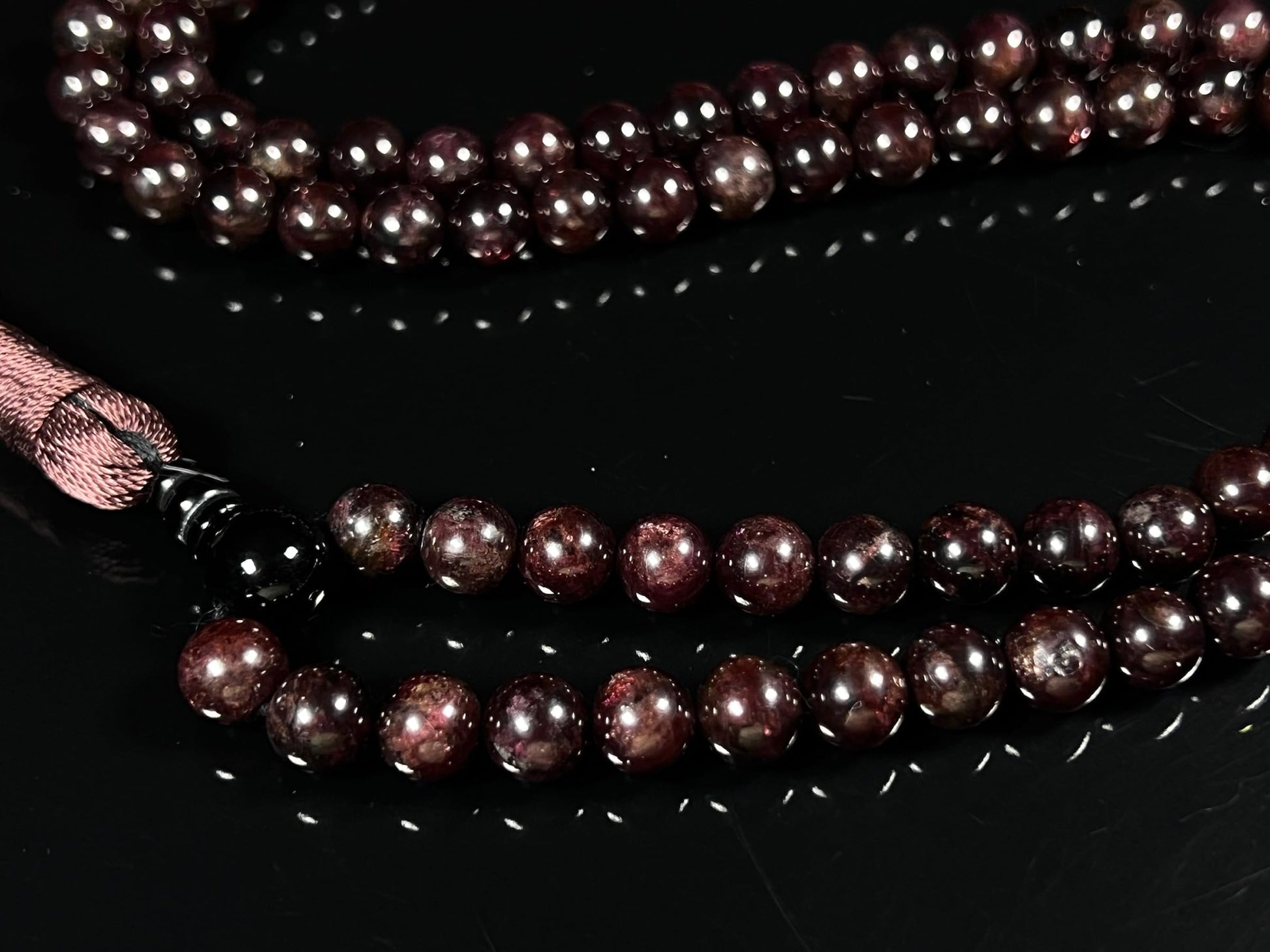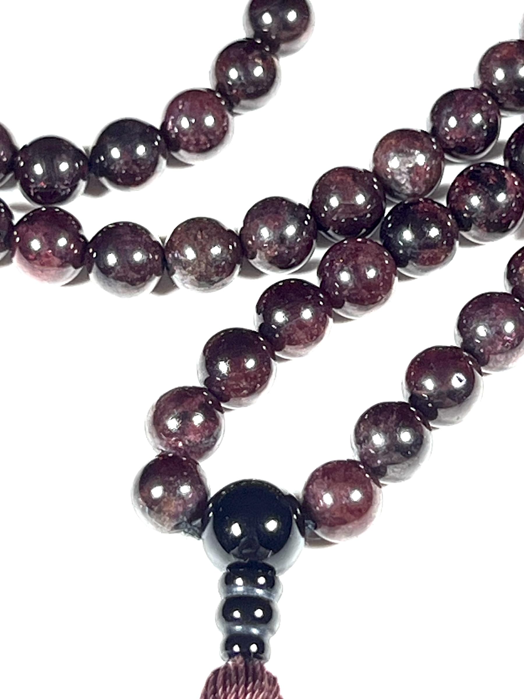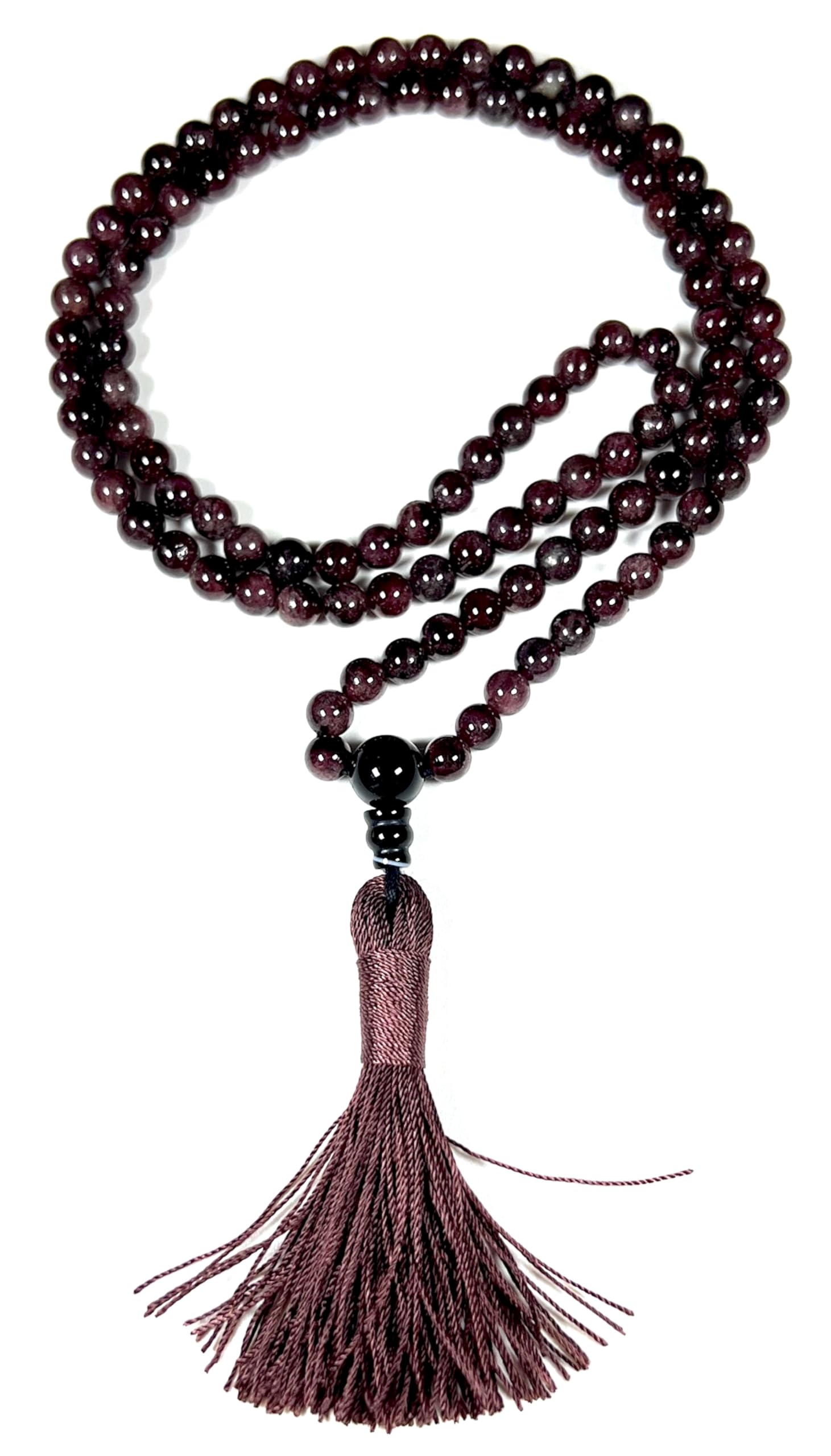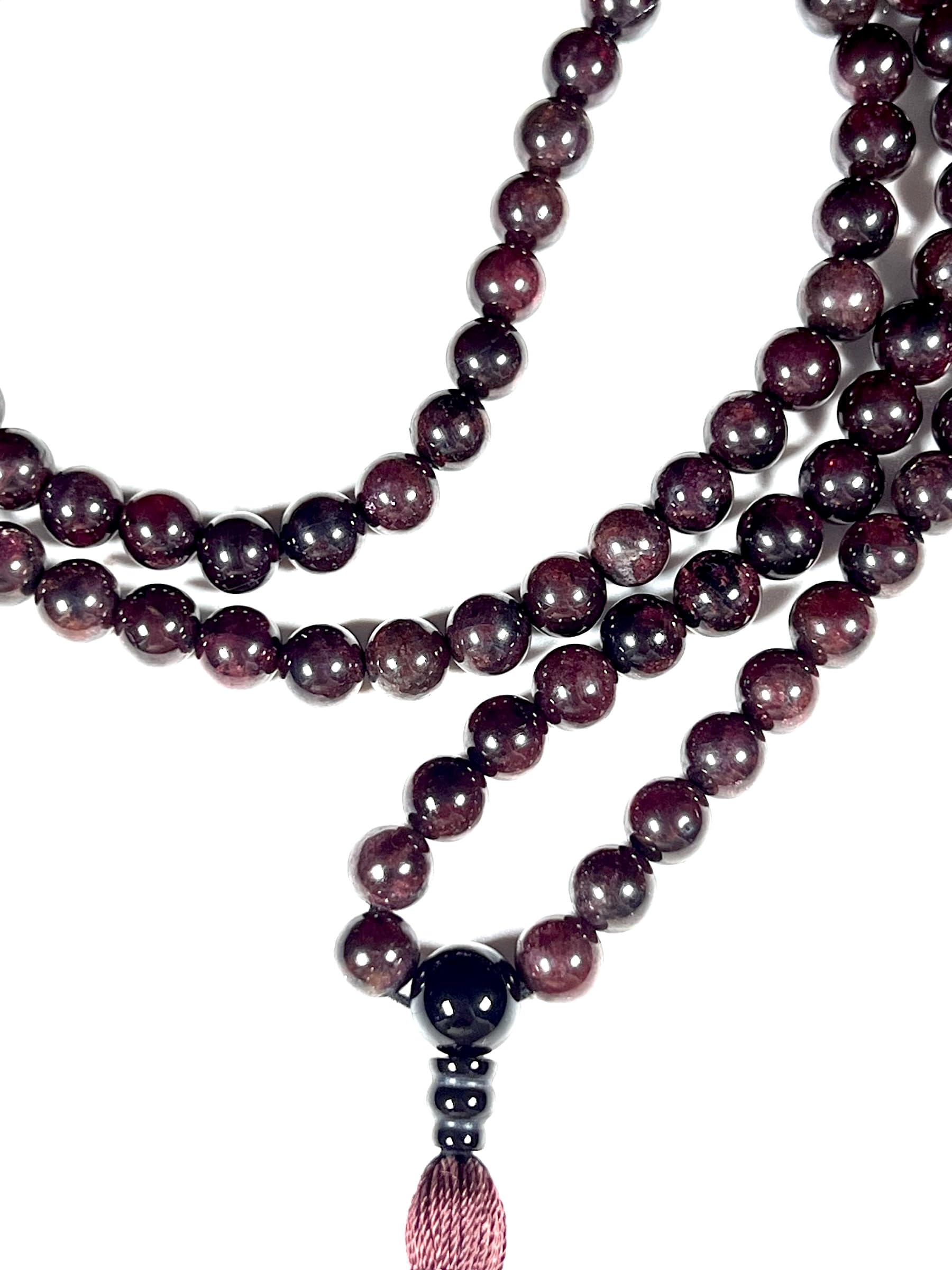 108 hand-knotted natural garnet beads in 6mm, 8mm, or 10mm sizes
