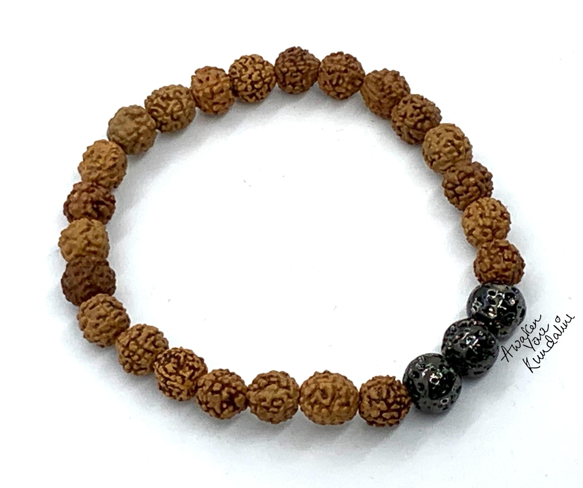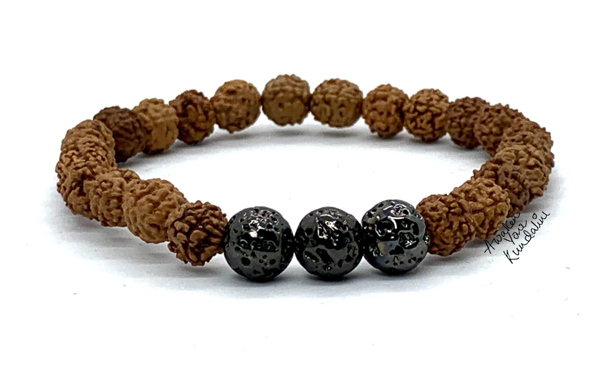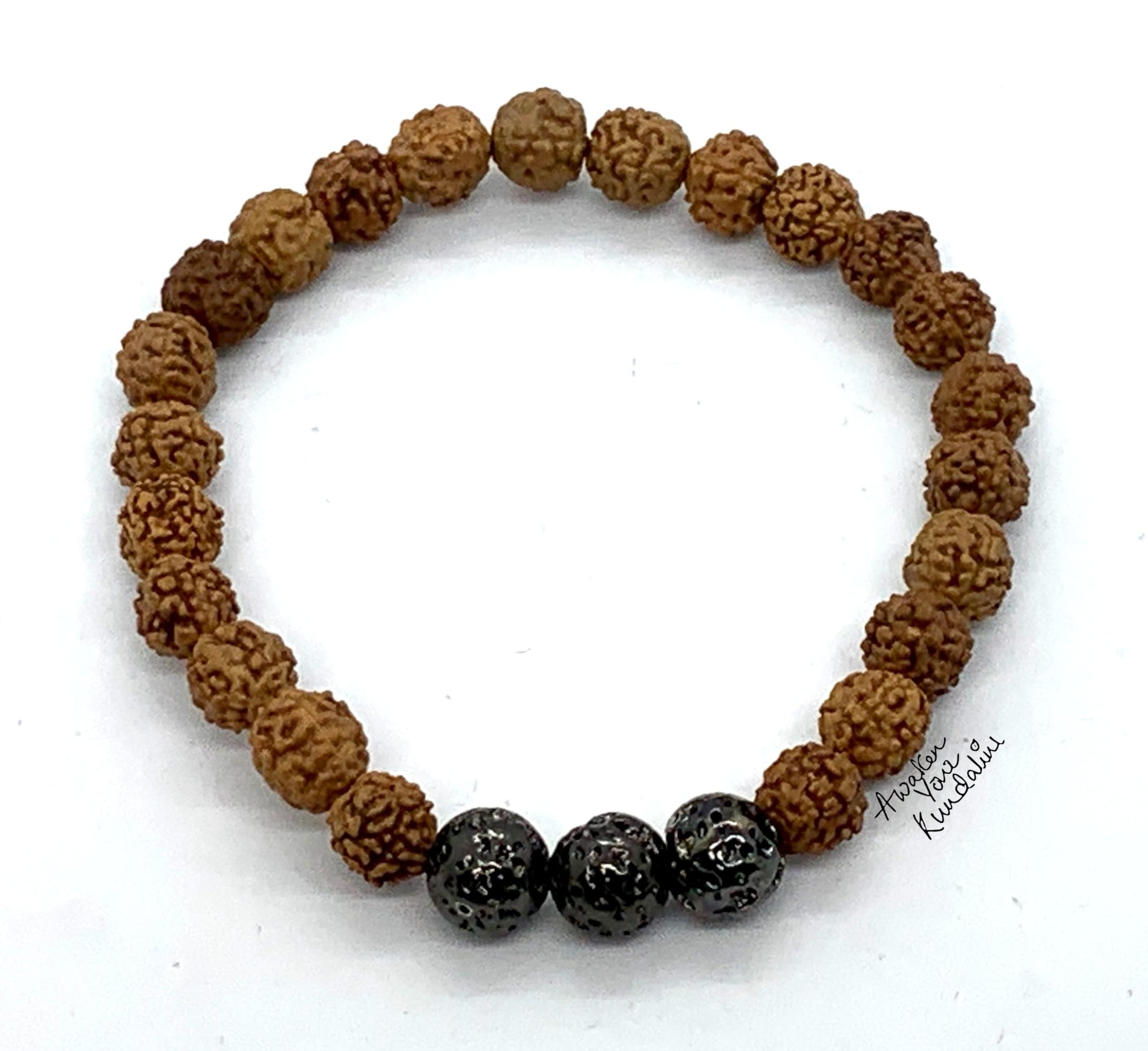 The 5 Mukhi Rudraksha & Lava Bracelet from the AKSHA Collection by Awaken Your Kundalini (AYK) is a sacred talisman of grounding, courage, and spiritual focus. Handcrafted with natural 8mm Rudraksha beads and raw lava stones, this bracelet balances the Root Chakra while connecting you to both the protective blessings of Shiva and the fiery life force of the earth.