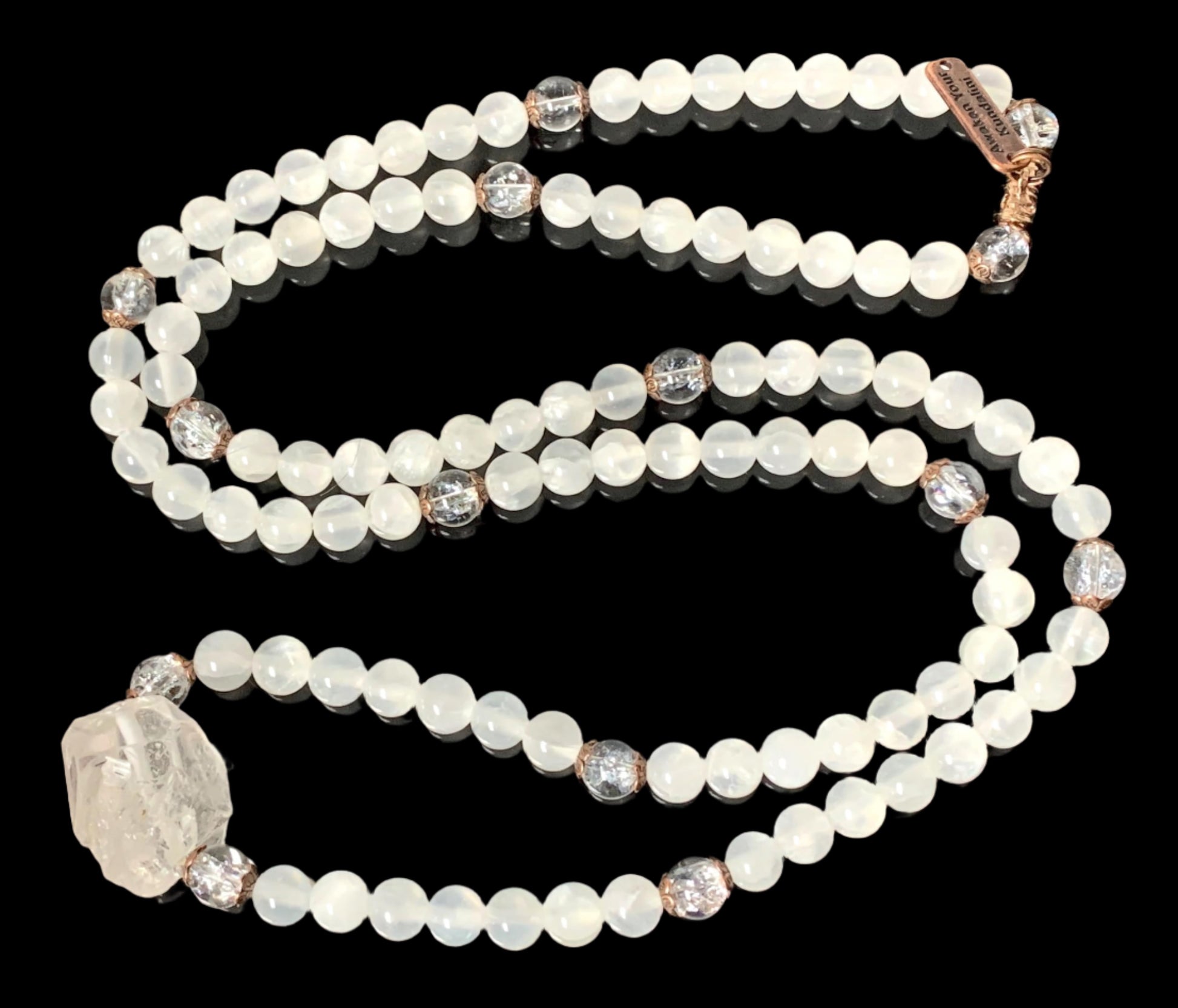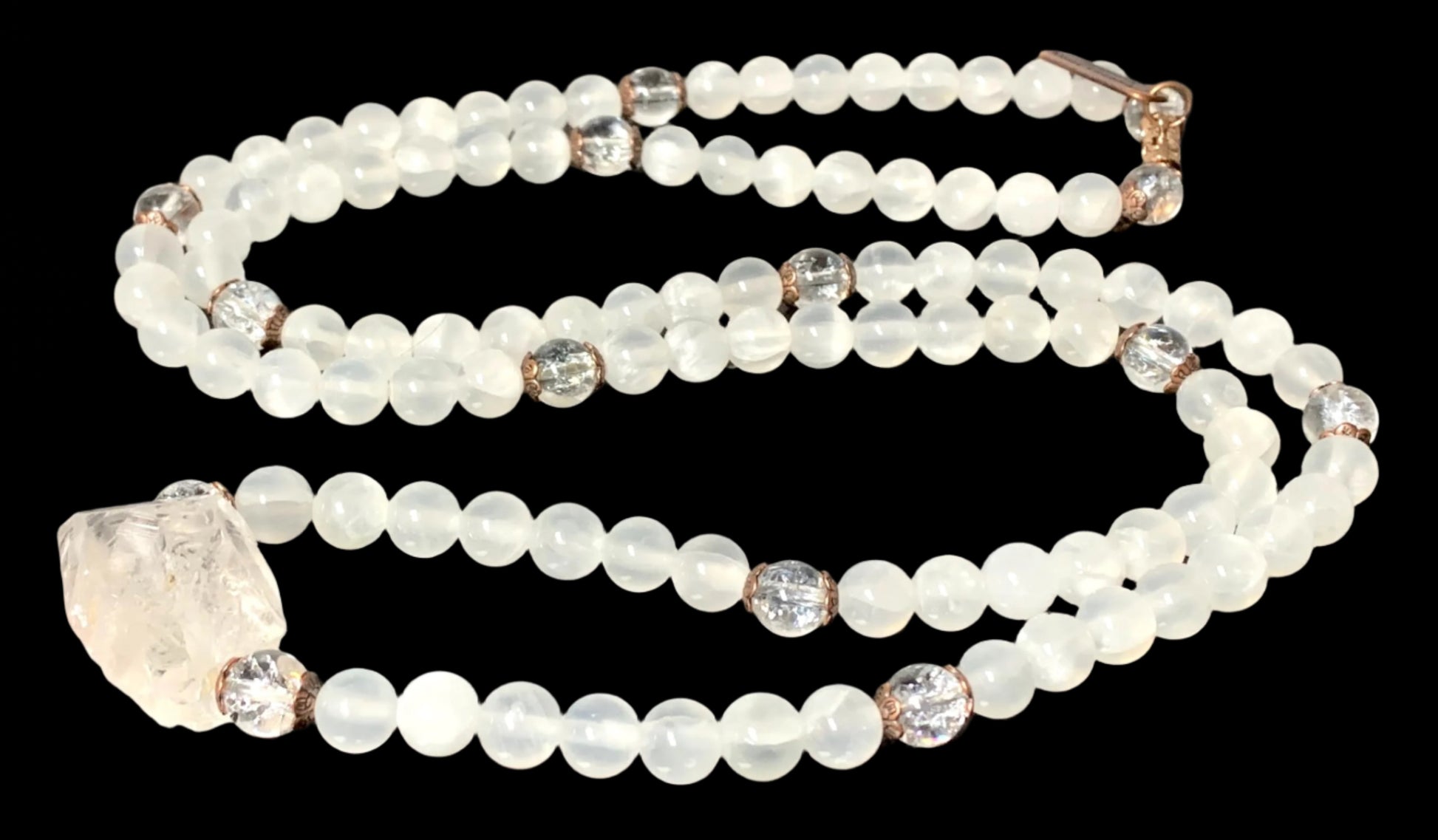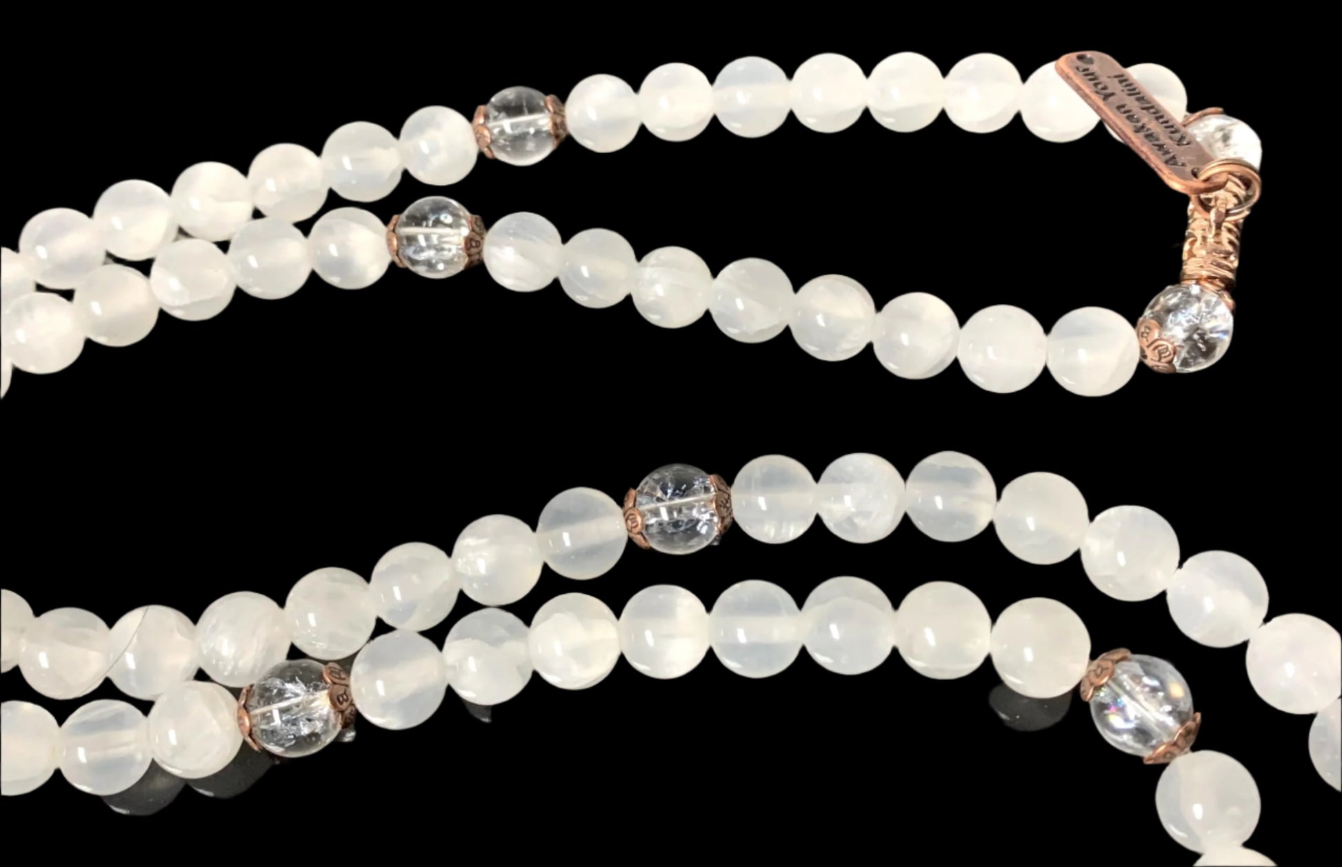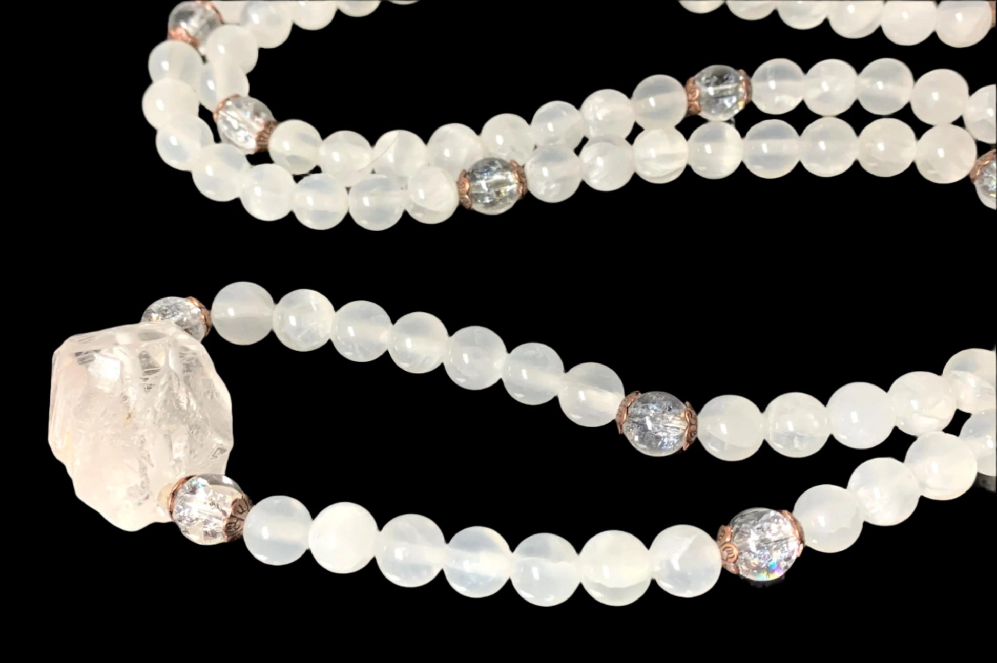 Together, selenite and quartz create the Selenite & Quartz Mala Necklace — a talisman of divine light and truth, guiding you toward wisdom, healing, and spiritual awakening.