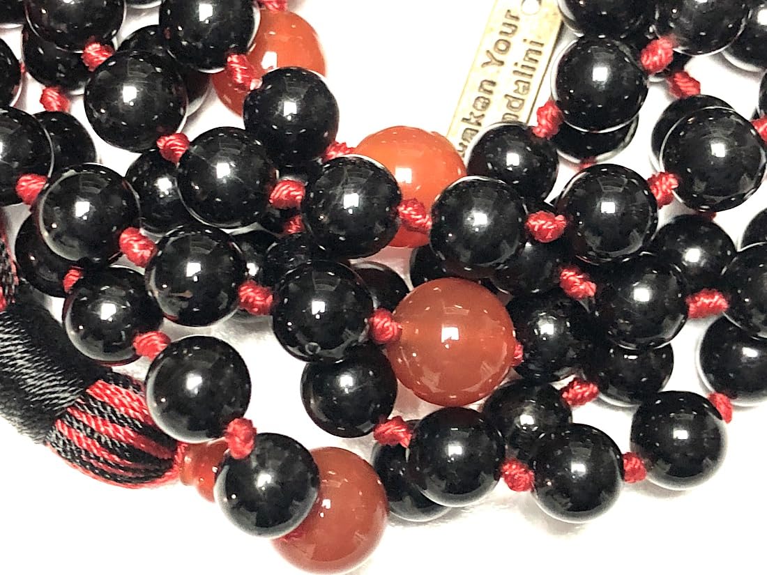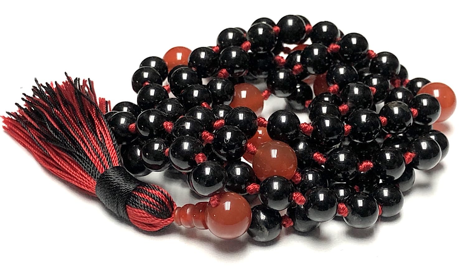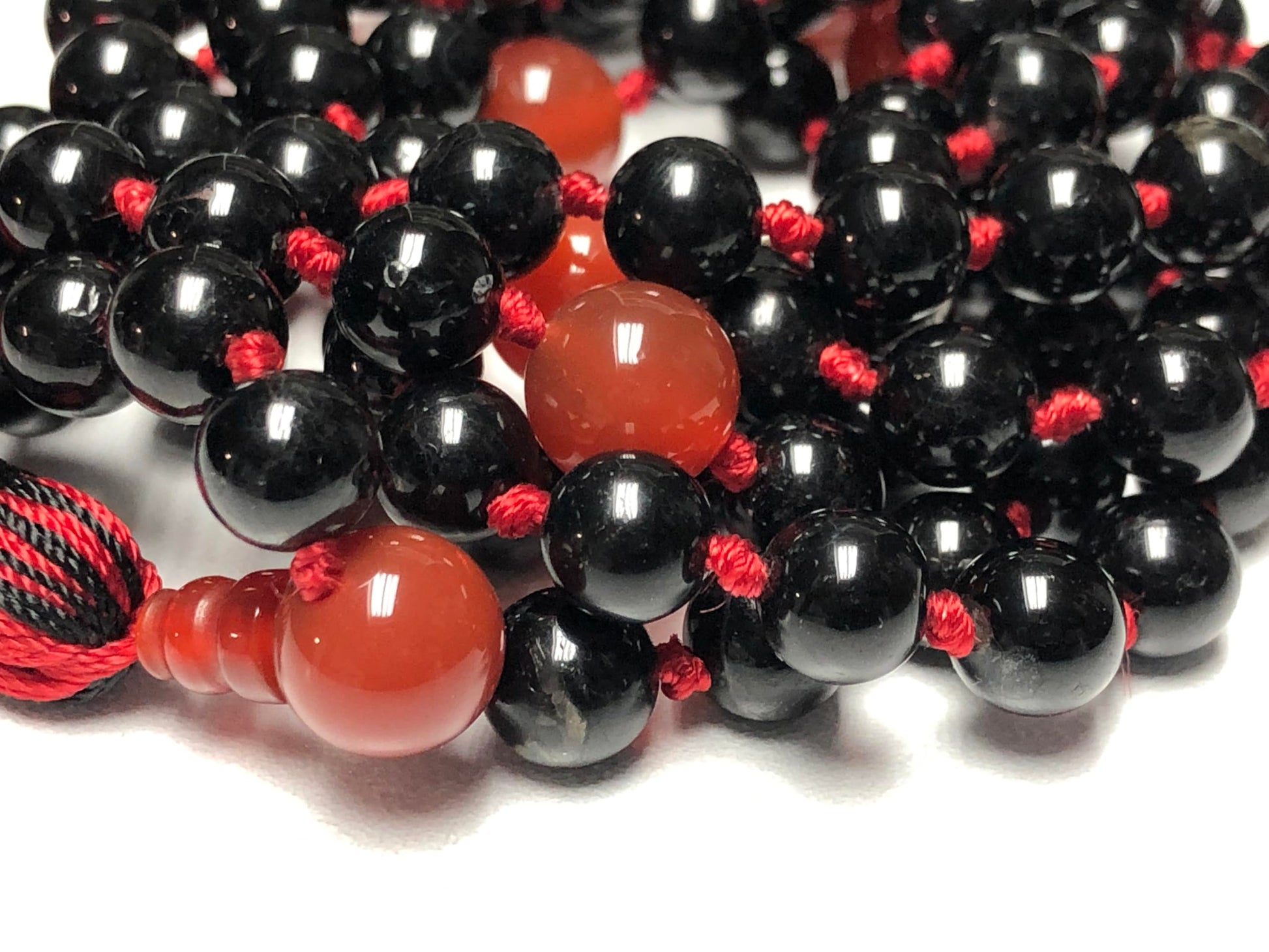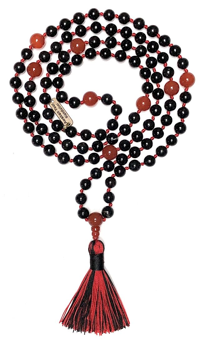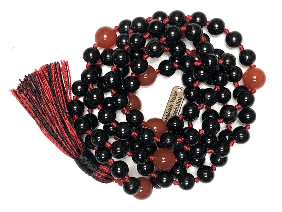 108 hand-knotted 8mm beads of natural black tourmaline & red carnelian
