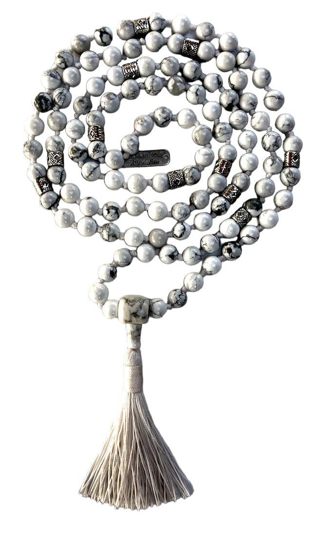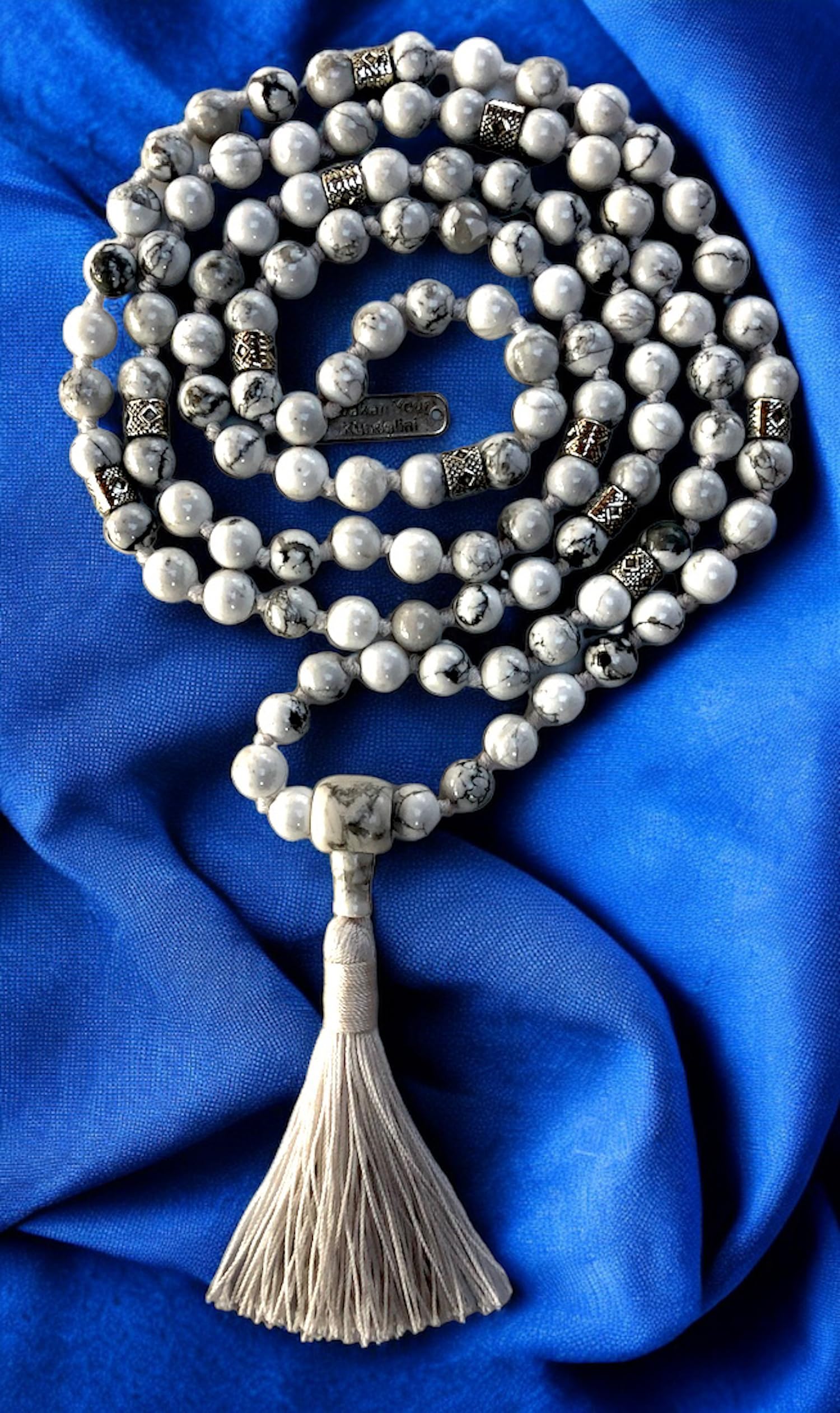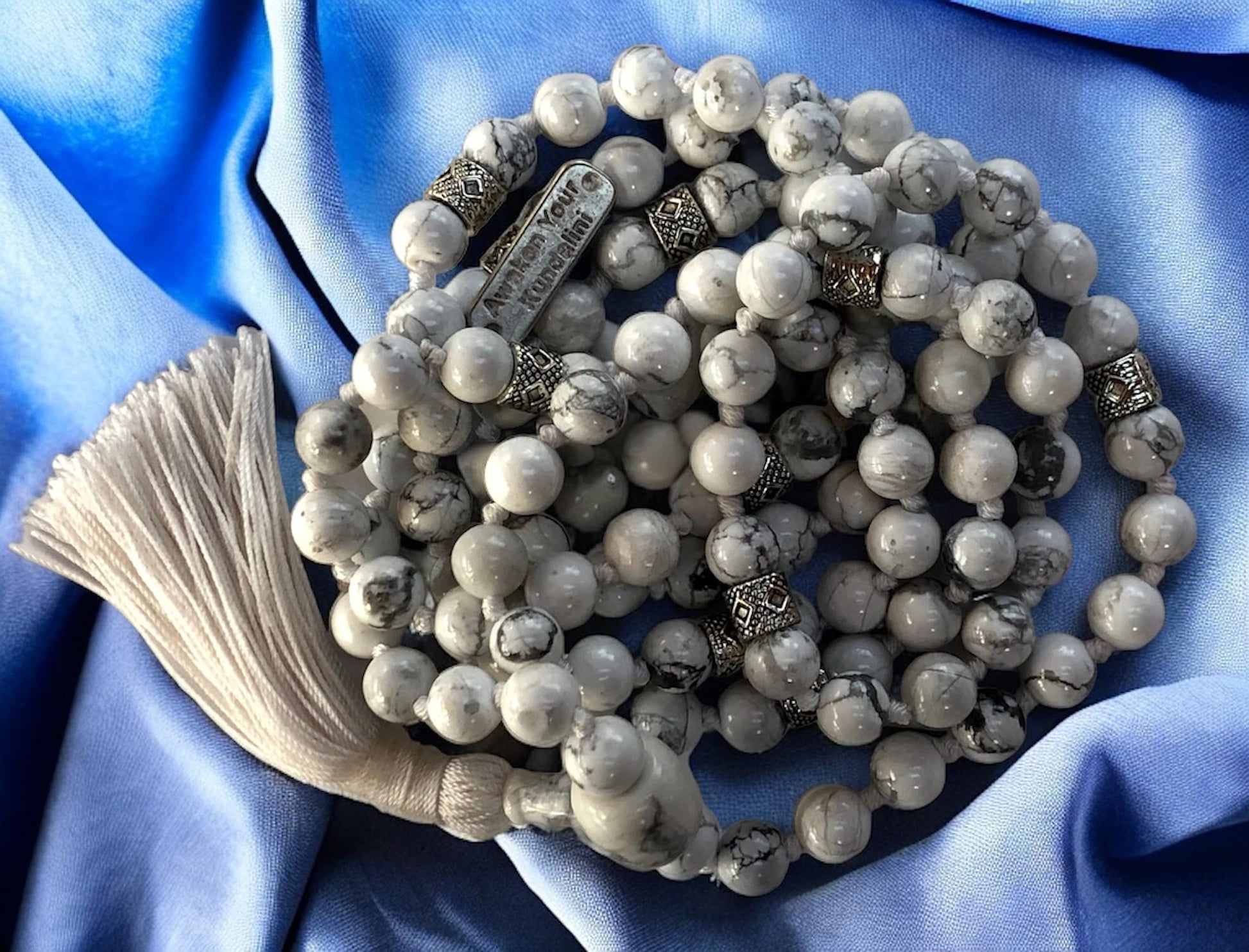108 natural 8mm white howlite beads, hand-knotted for strength and sacred tradition