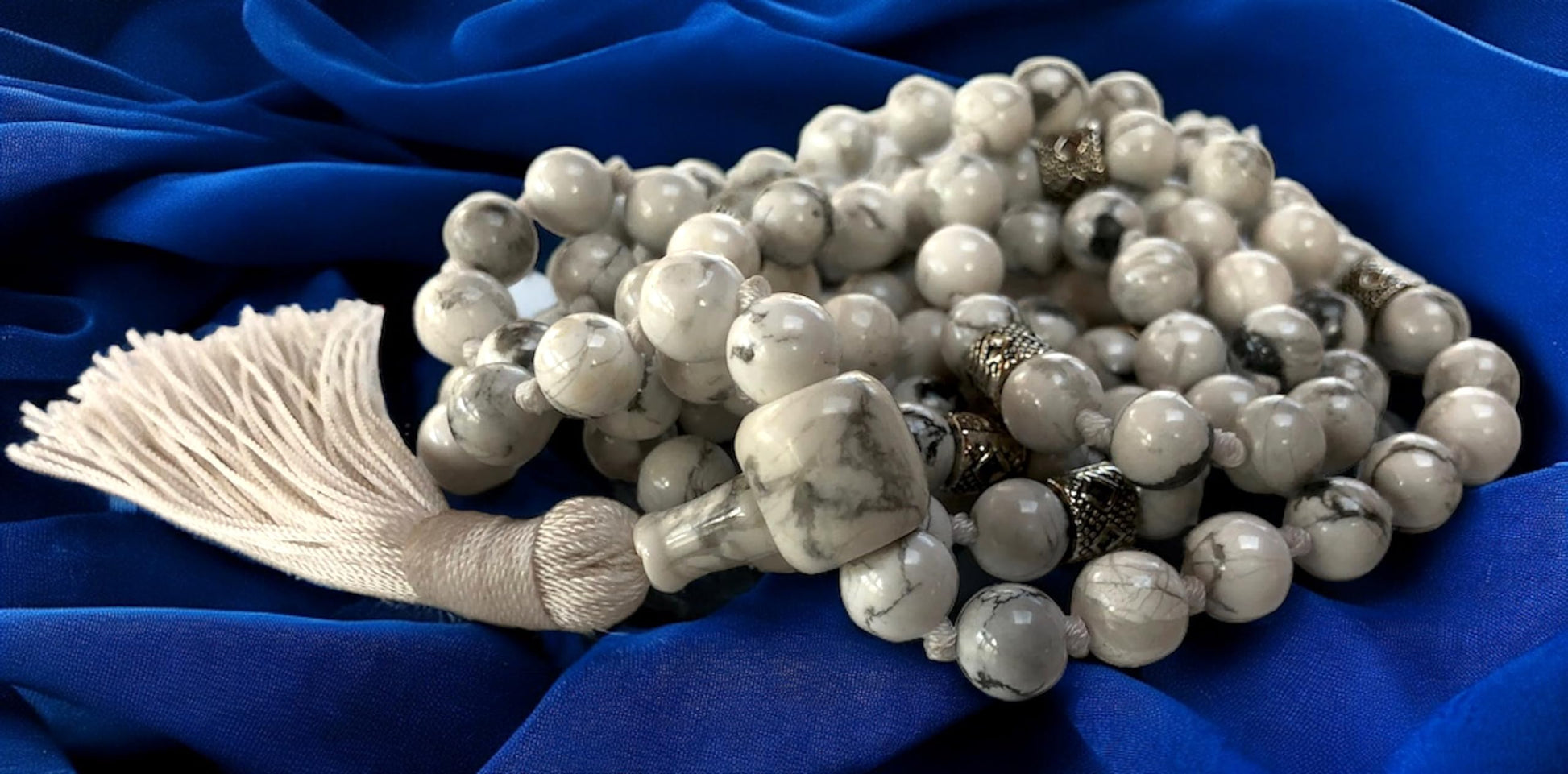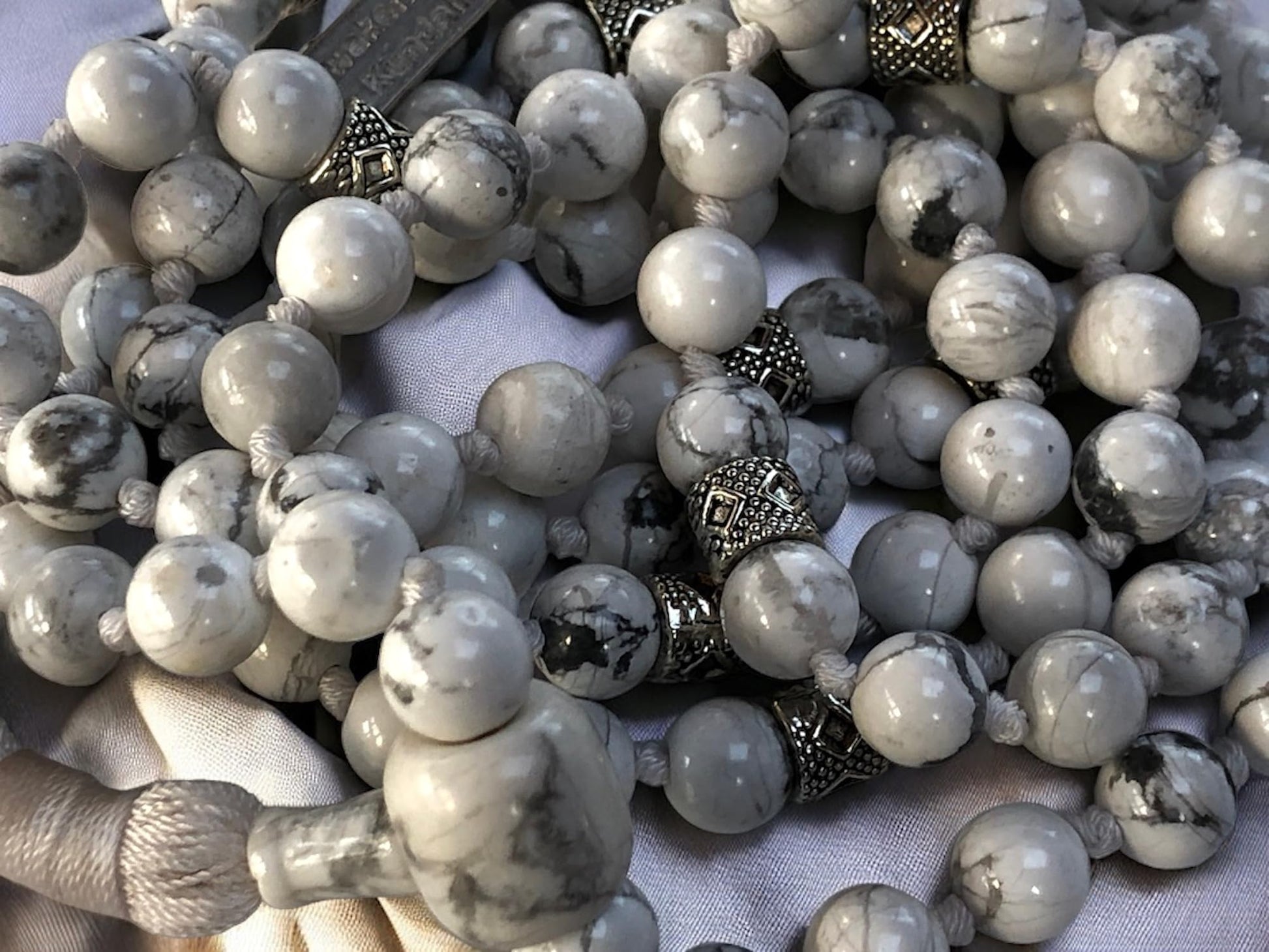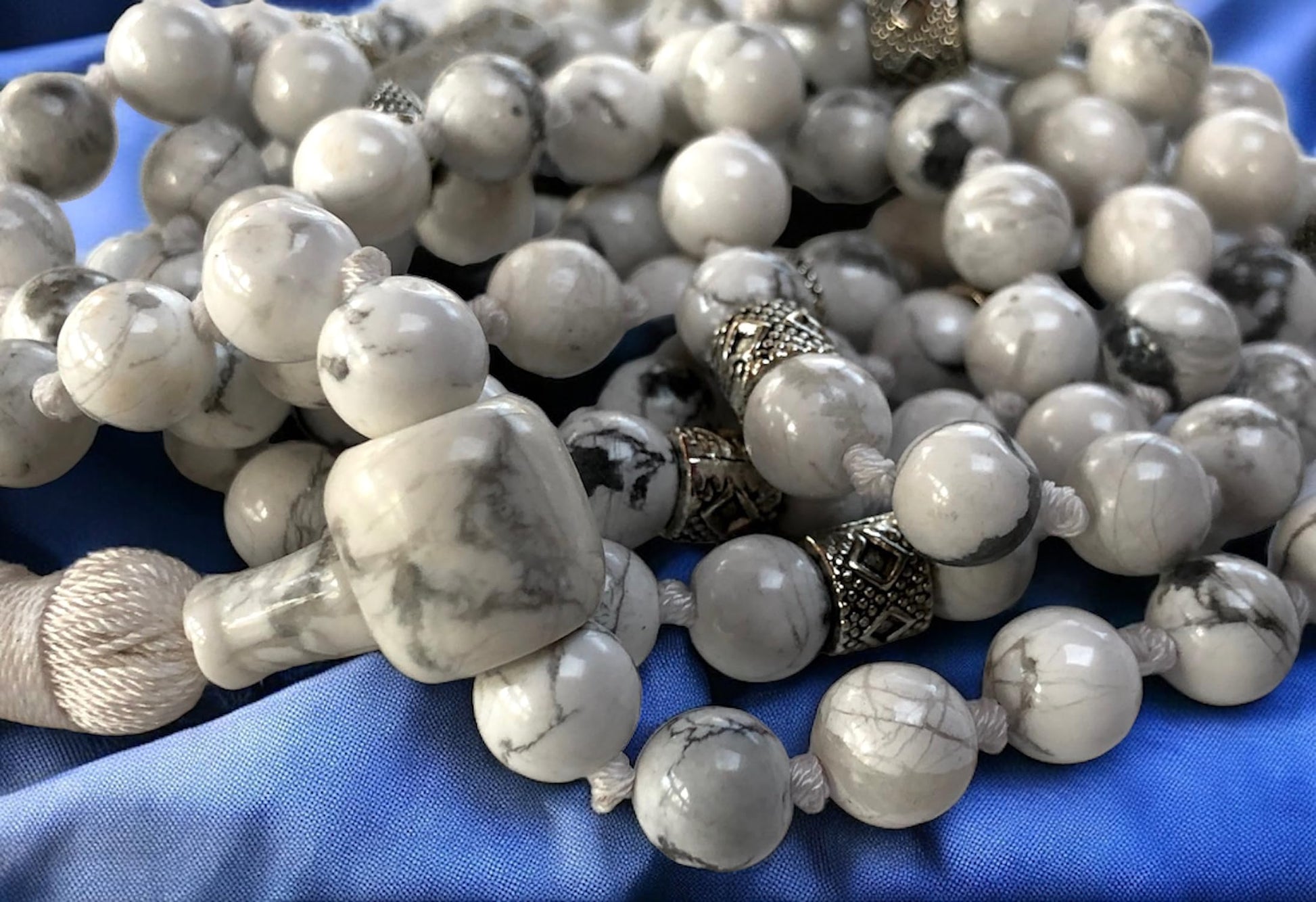 108 natural 8mm white howlite beads, hand-knotted for strength and sacred tradition