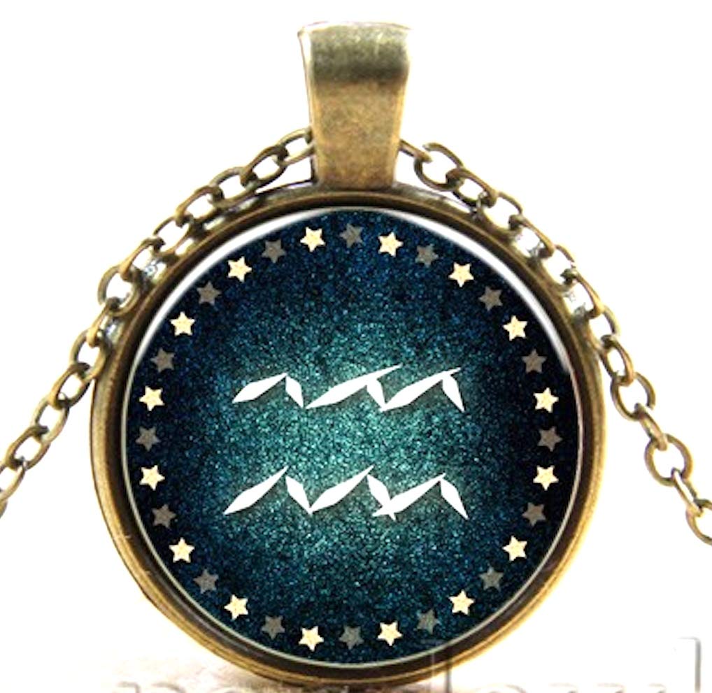 Constellation Zodiac Sign Flat Round Glass Pendant Necklaces, with Alloy Chains, Antique Bronze, 18" (Aquarius)