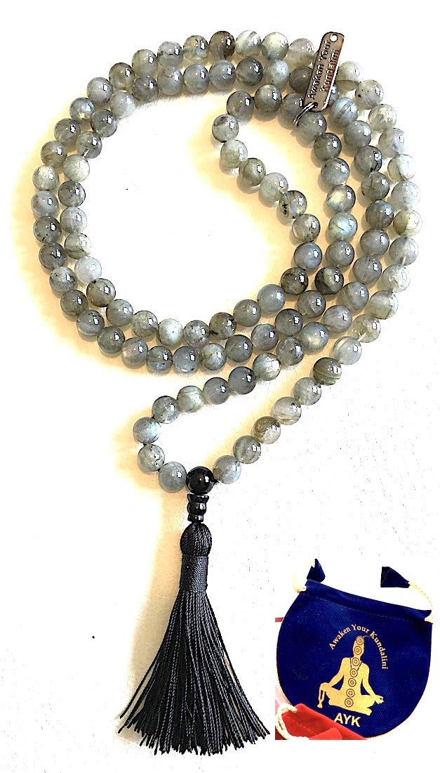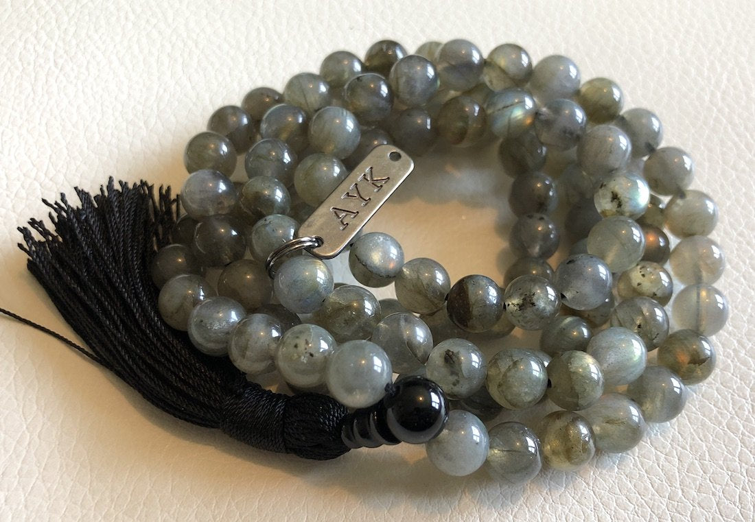 - Product Features: Bead Size: 8mm labradorite beads with a 10mm black onyx guru bead. Material: High-quality labradorite and black onyx. Design: Hand-knotted mala necklace for durability and flexibility. Length: Traditional 108 bead mala for meditation and mindfulness practices.