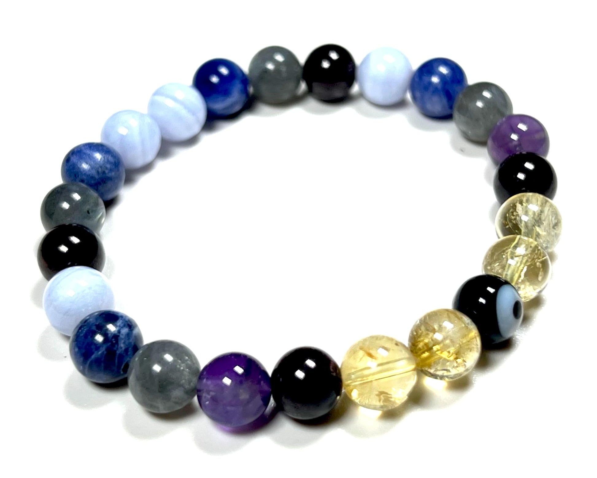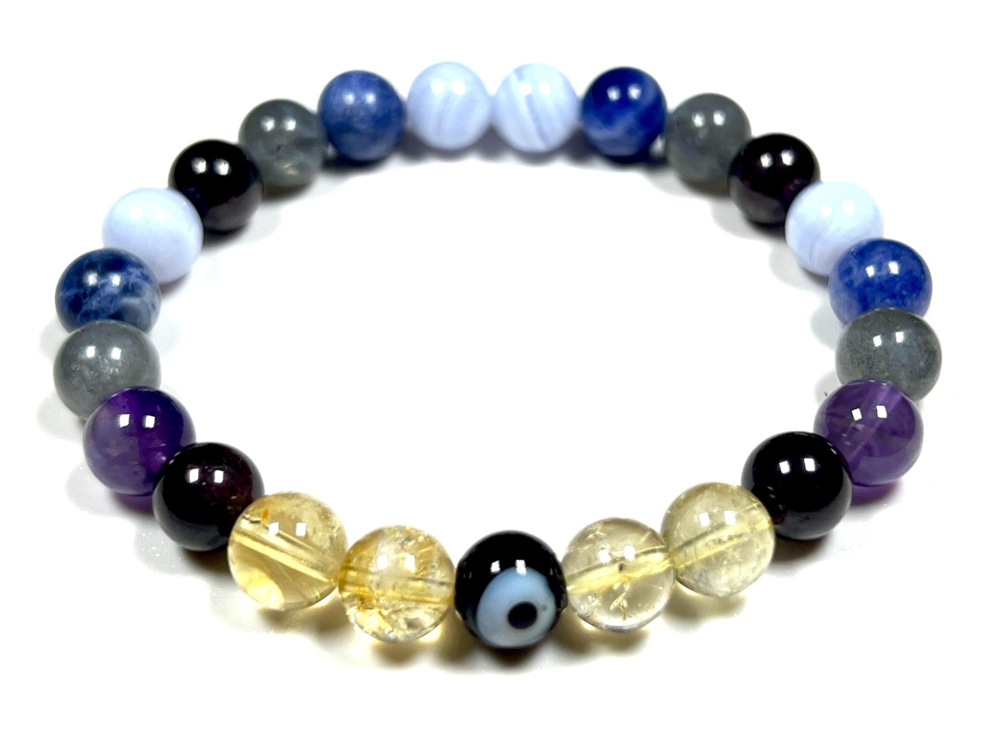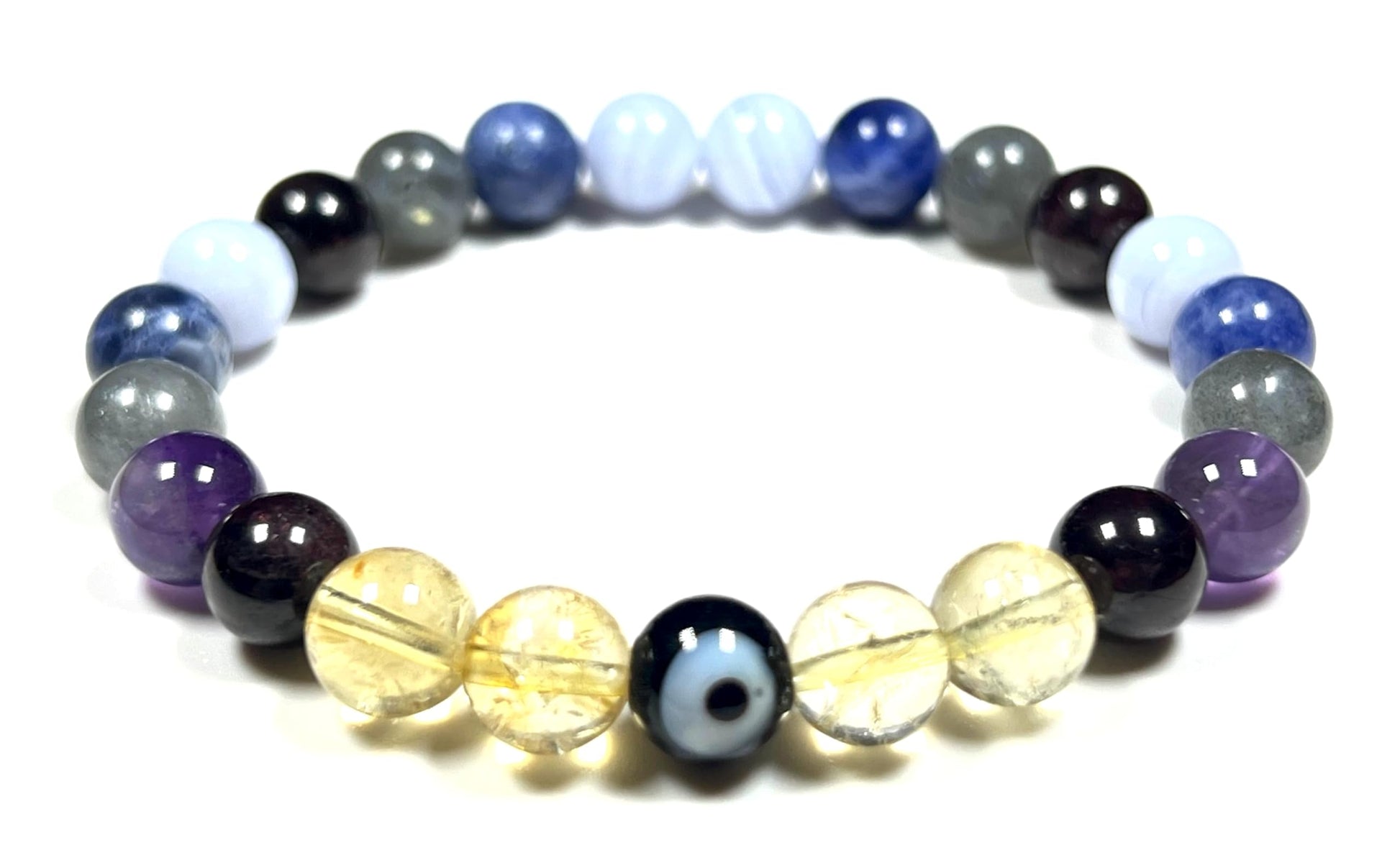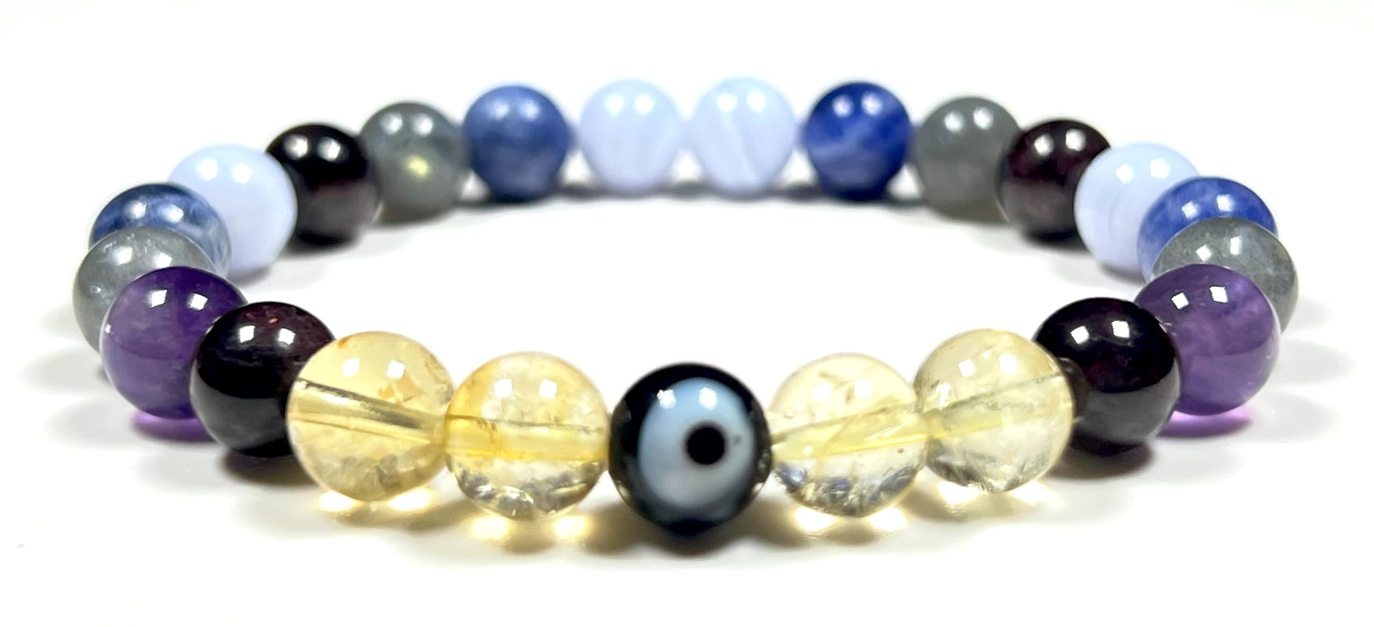 - Please Note: The healing bracelet listed is hand crafted by artisans with utmost care & high grade beads. Each Mala will be Unique & may vary slightly in color size texture. Approx.7.5 Inches. Gemstones in Bracelet: Amethyst Blue Lace Agate Labradorite Citrine Sodalite Garnet Evil Eye. #HealingCrystals #AnxietyRelief #StressRelief #DepressionRelief #MentalHealth #CalmingBeads #BeadedBracelet #StretchableBracelet #StonesForAntietyStressDepressionMentalHealthCalmness