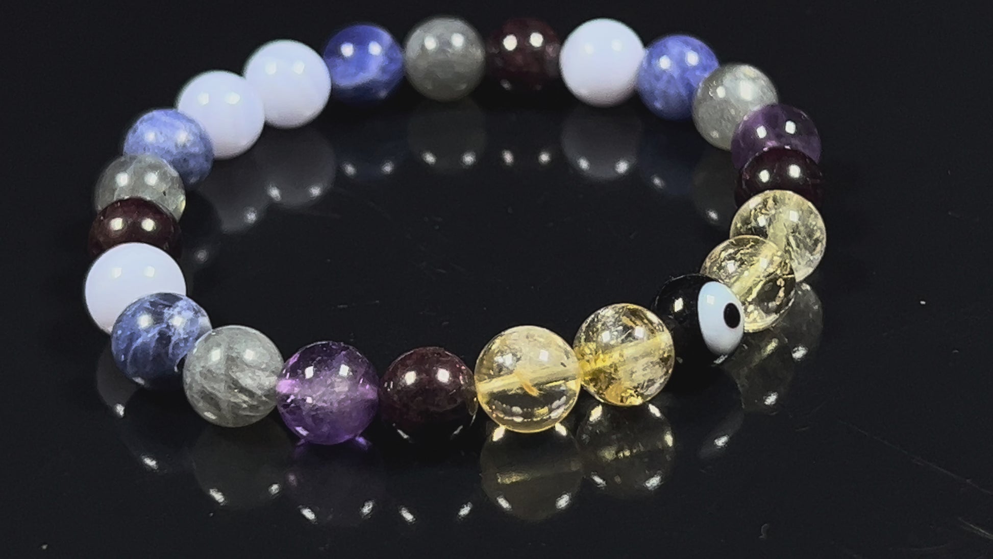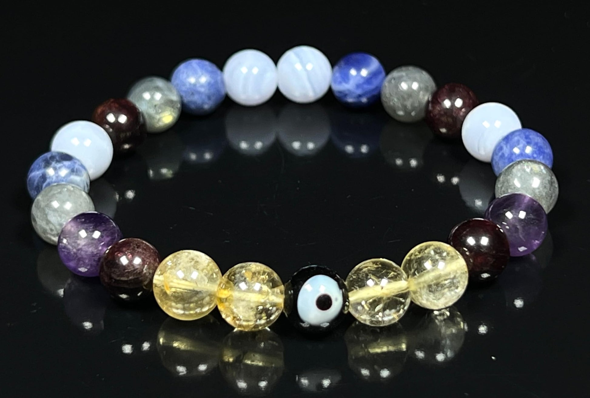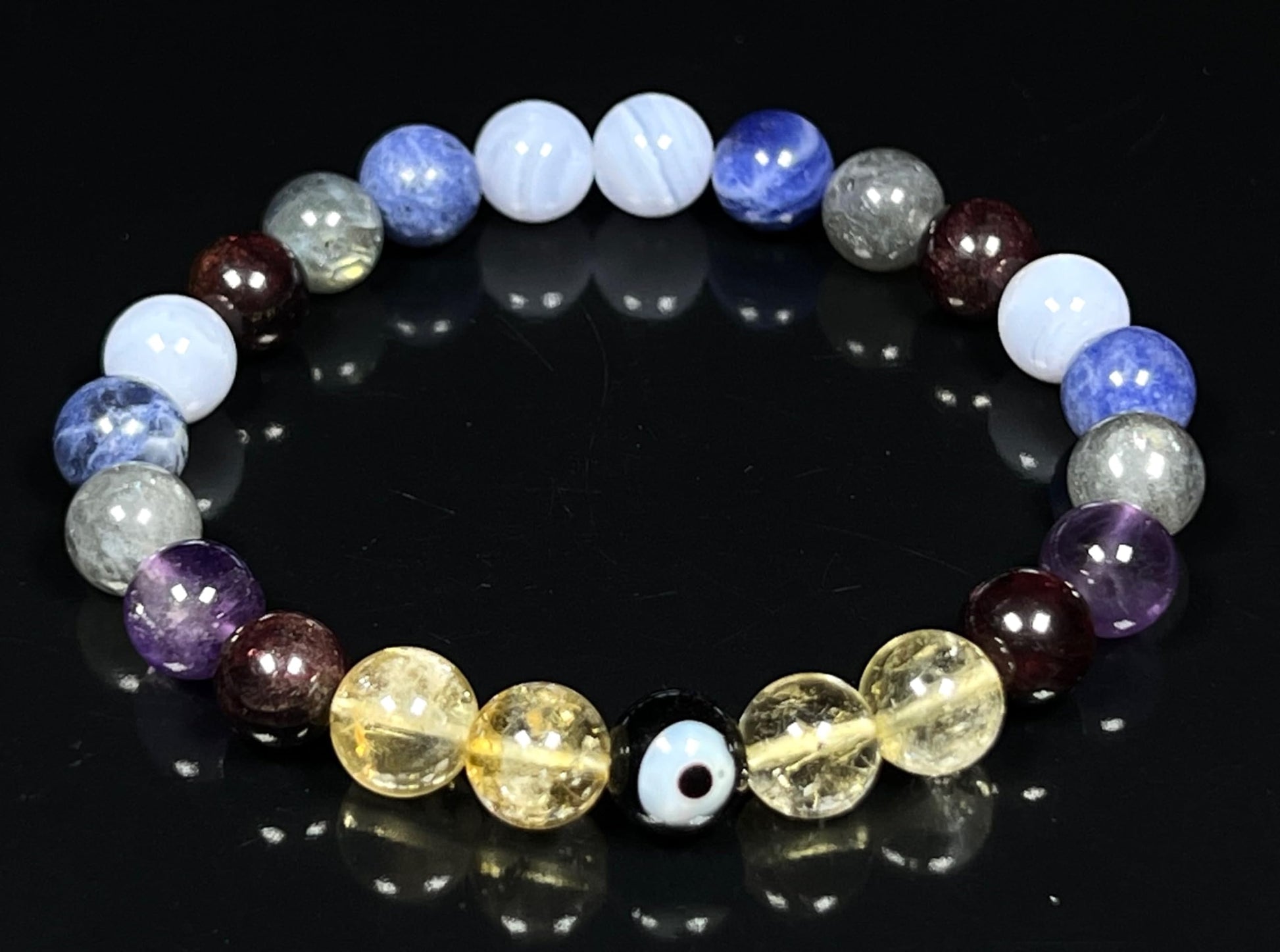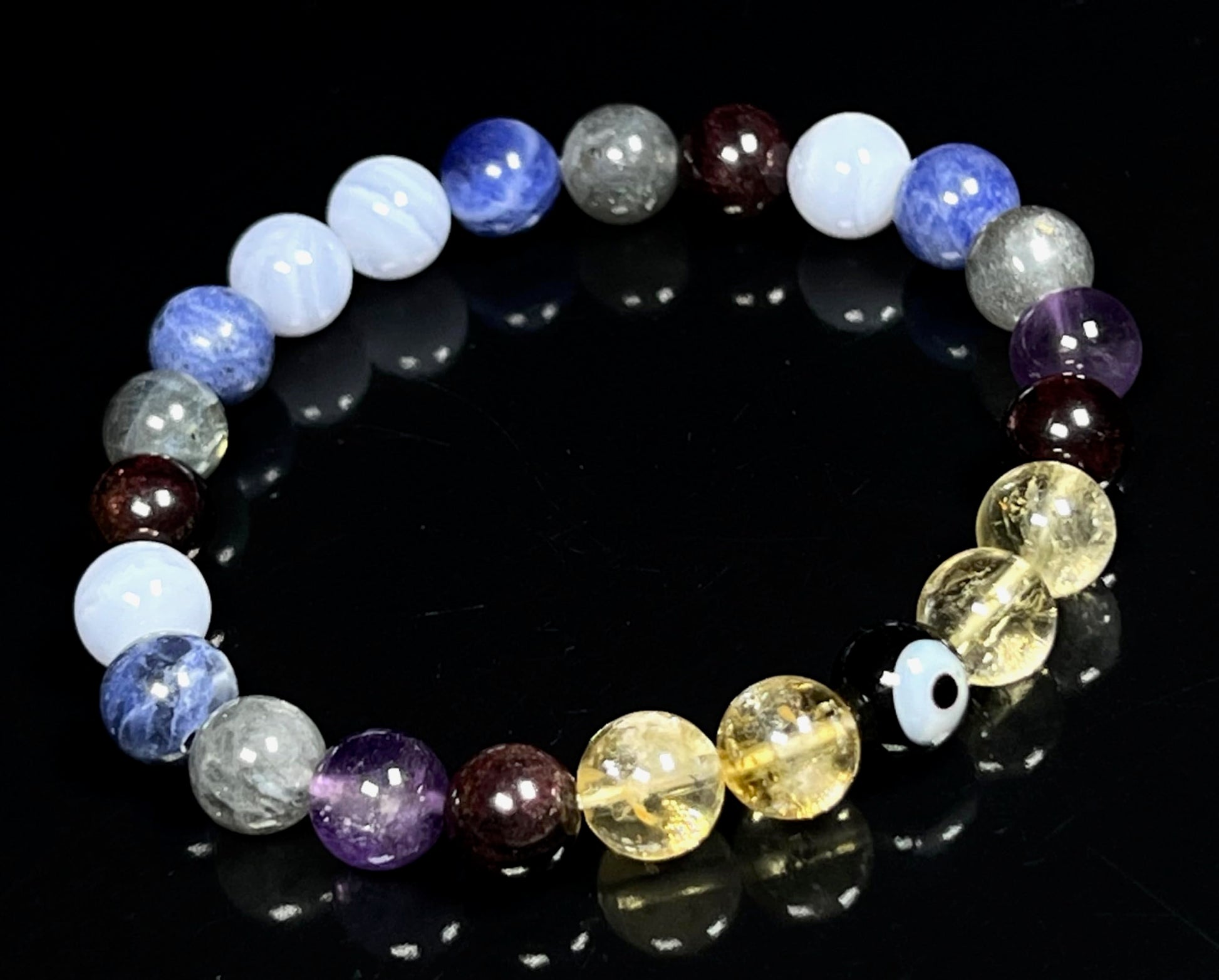 - Please Note: The healing bracelet listed is hand crafted by artisans with utmost care & high grade beads. Each Mala will be Unique & may vary slightly in color size texture. Approx.7.5 Inches. Gemstones in Bracelet: Amethyst Blue Lace Agate Labradorite Citrine Sodalite Garnet Evil Eye. #HealingCrystals #AnxietyRelief #StressRelief #DepressionRelief #MentalHealth #CalmingBeads #BeadedBracelet #StretchableBracelet #StonesForAntietyStressDepressionMentalHealthCalmness