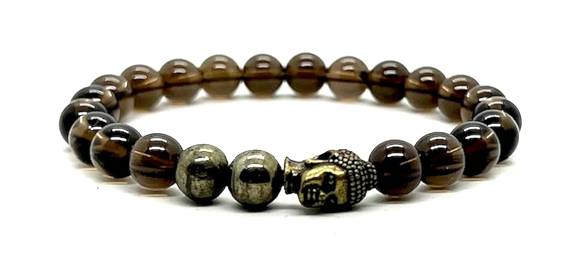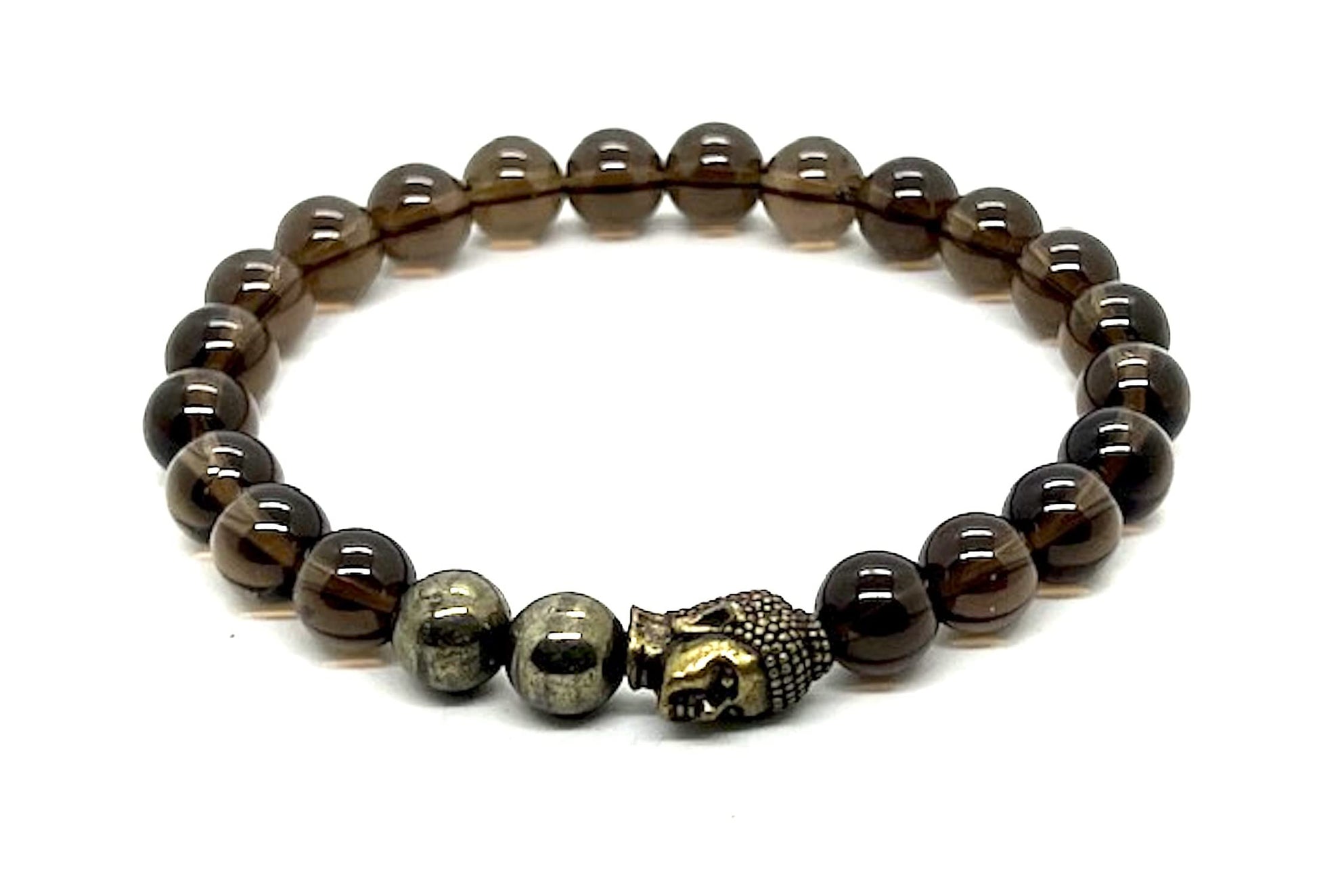 - Embrace Inner Strength & Manifestation Experience the power of natural stones aligned with your birthstone with this handmade mala bracelet. Featuring genuine Smoky Quartz and Pyrite gemstones, this piece offers a unique combination of grounding energy and the drive to bring your dreams to life. Bead size 8mm; Wrist Size 7.5 Inches.