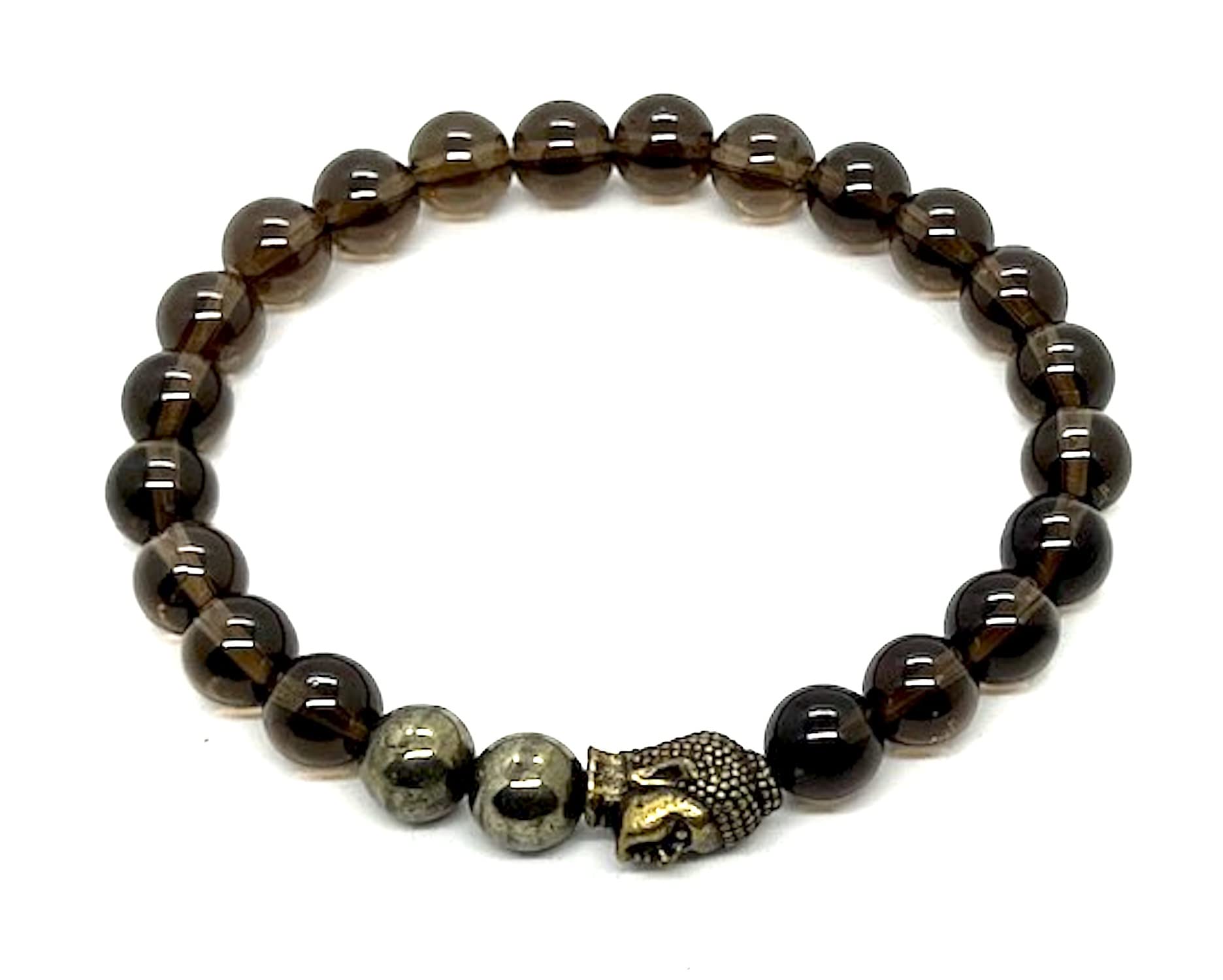 Cultivate Grounding & Transformation: Capricorn Birthstone - Smoky Quartz & Pyrite Root & Solar Plexus Chakra Mala Bracelet (8mm Beads) - Unisex - Buddha Head Spacer