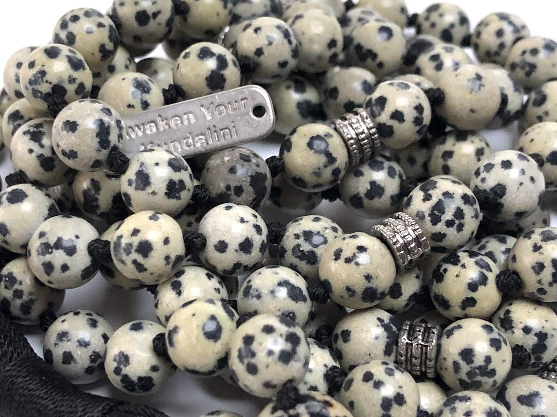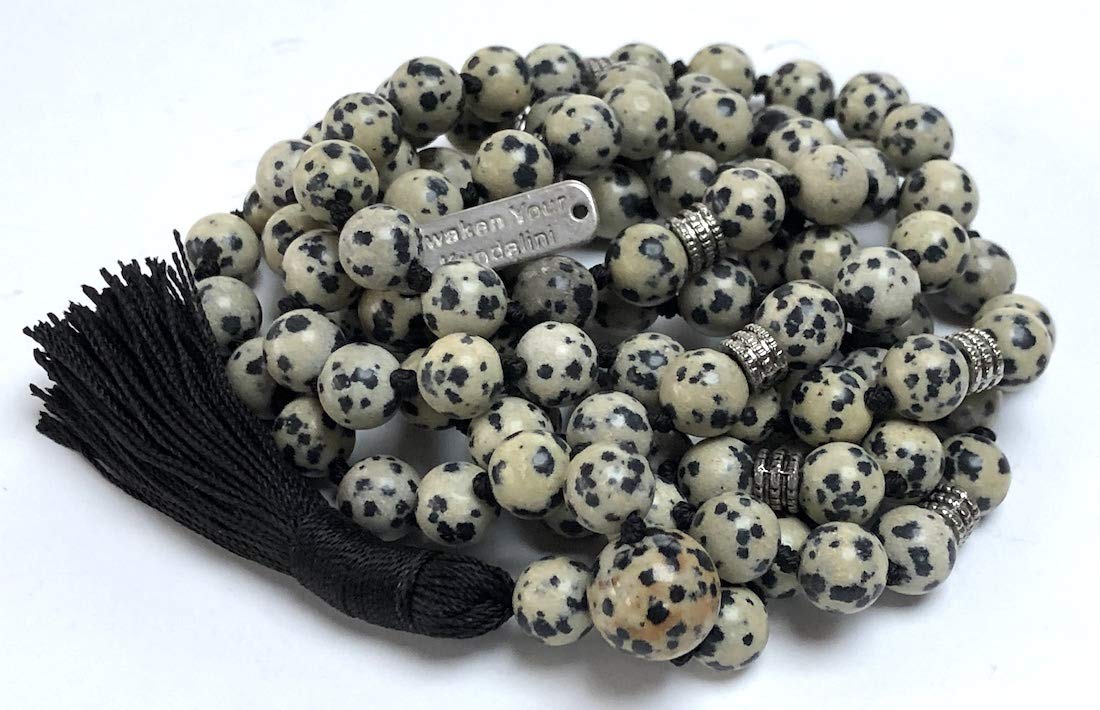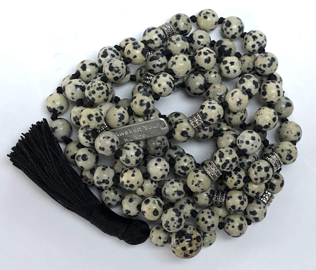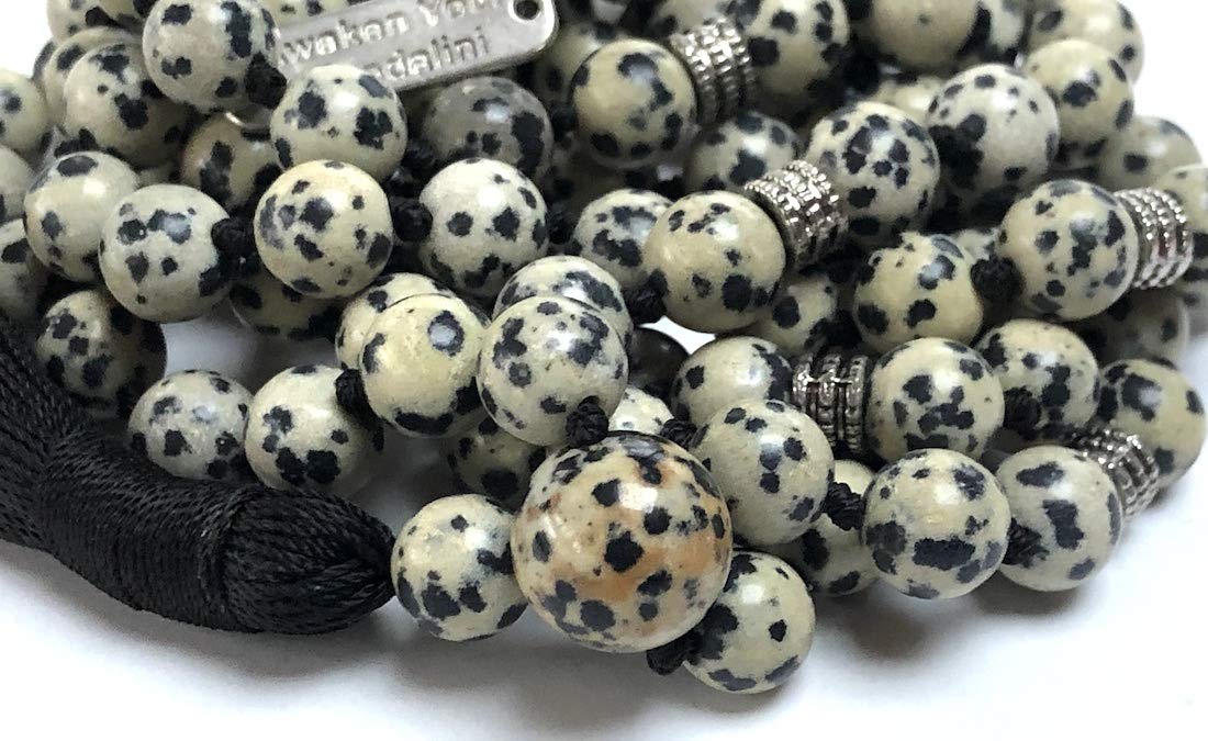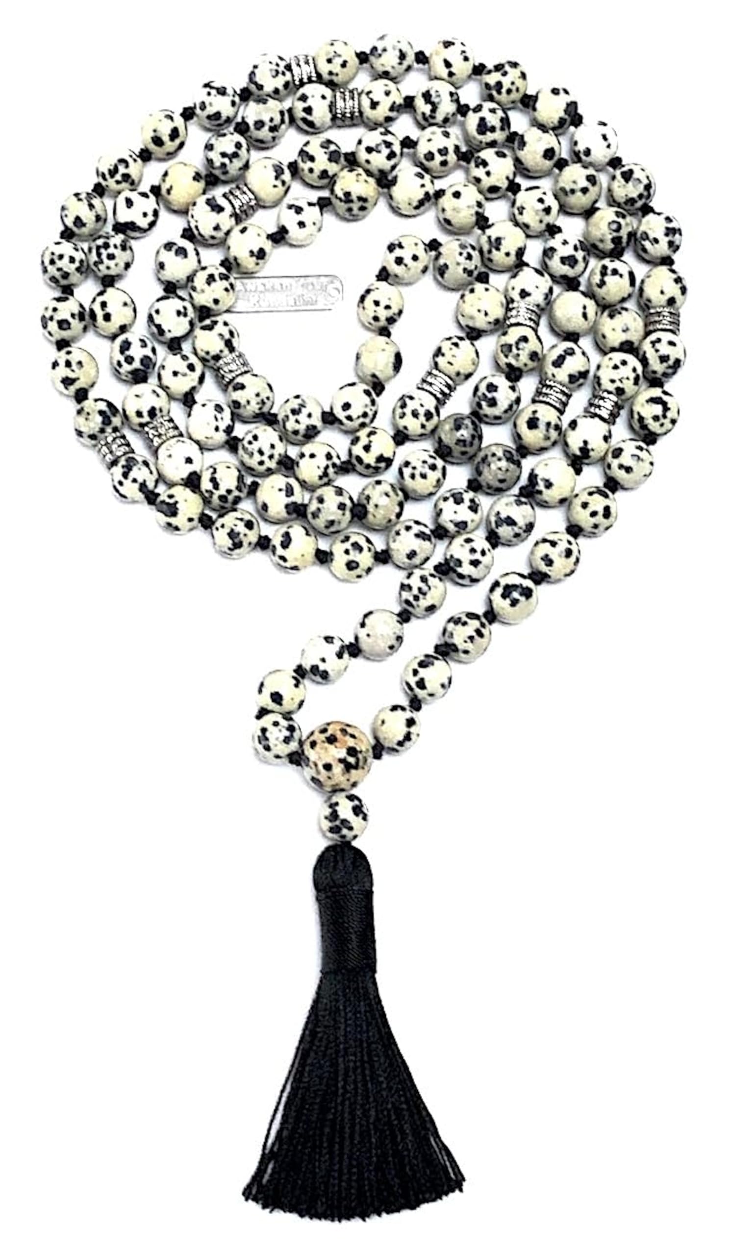- Handcrafted with Care in USA. Each mala necklace is meticulously hand-knotted, a practice steeped in tradition. This thoughtful creation features genuine Dalmatian Jasper gemstones and sleek alloy spacers for a touch of modern elegance.