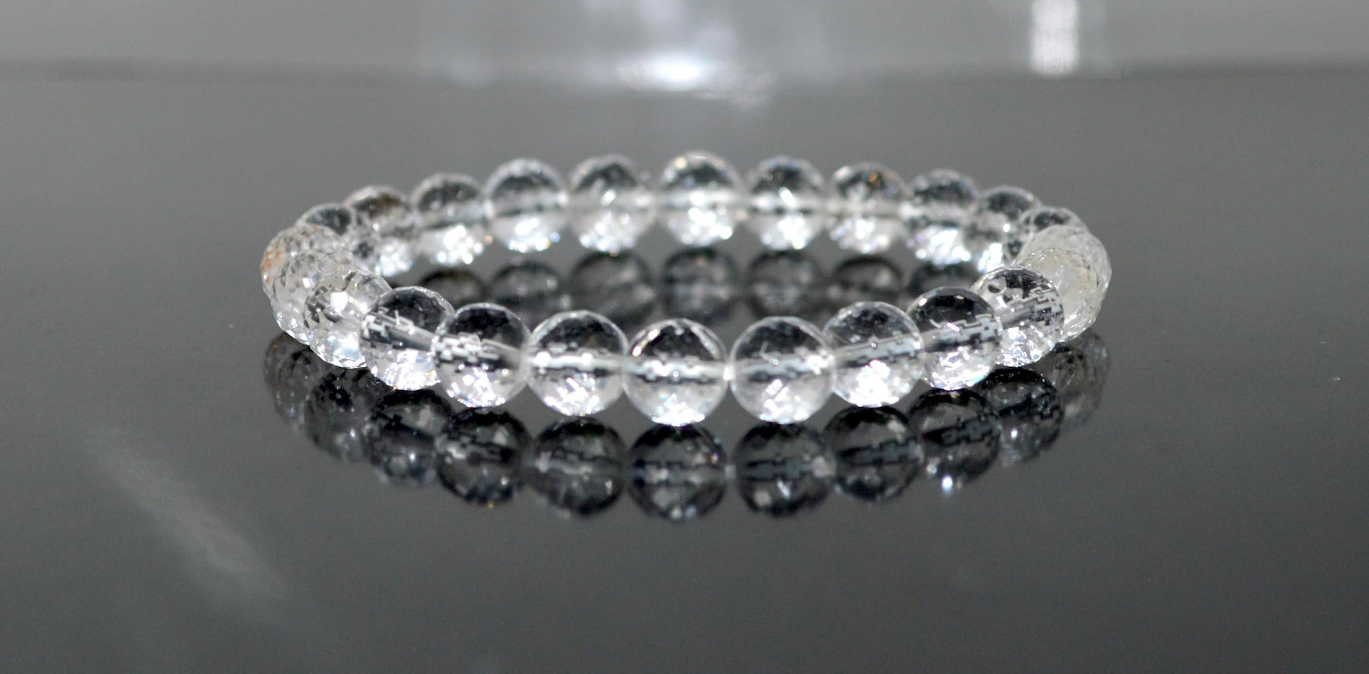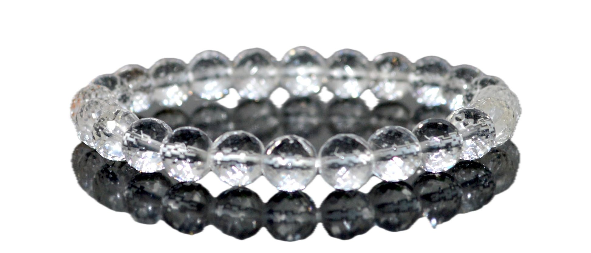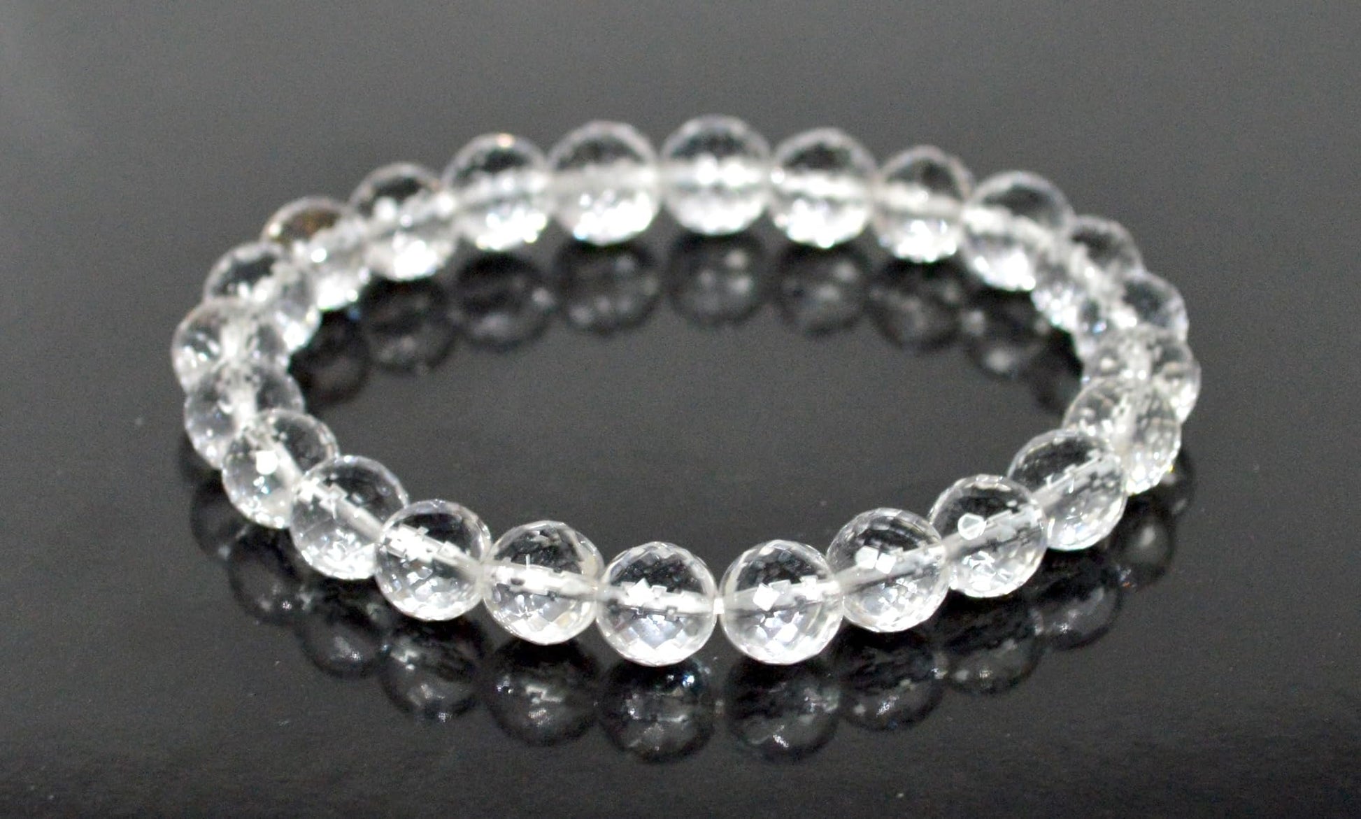- This Stretch Bracelet is the epitome of elegance & spiritual charm. Crafted from high-quality crystal quartz with a brilliant diamond cut finish, this bracelet radiates clarity & beauty. Available in two bead sizes, 6mm and 8mm, & stretchable to fit wrist sizes from 6 to 9 inches, it's a versatile accessory that suits any occasion. Associated with the Crown Chakra, it complements your inner balance and energy flow.