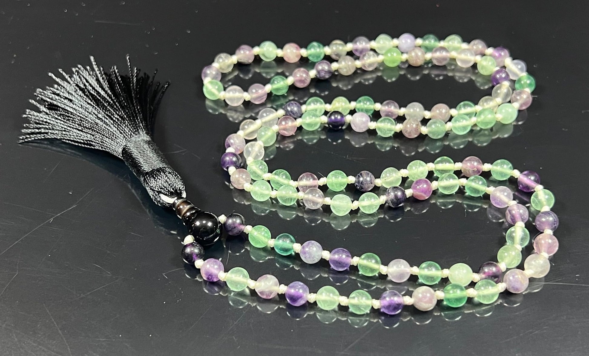 - #RainbowFluoriteMala #PiscesBirthstone #LibraJewelry #HeartChakra #ThirdEyeChakra #SpiritualJewelry #HandKnottedMala #BohemianStyle #MeditationBeads