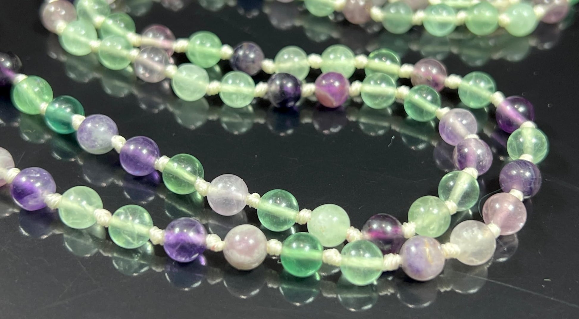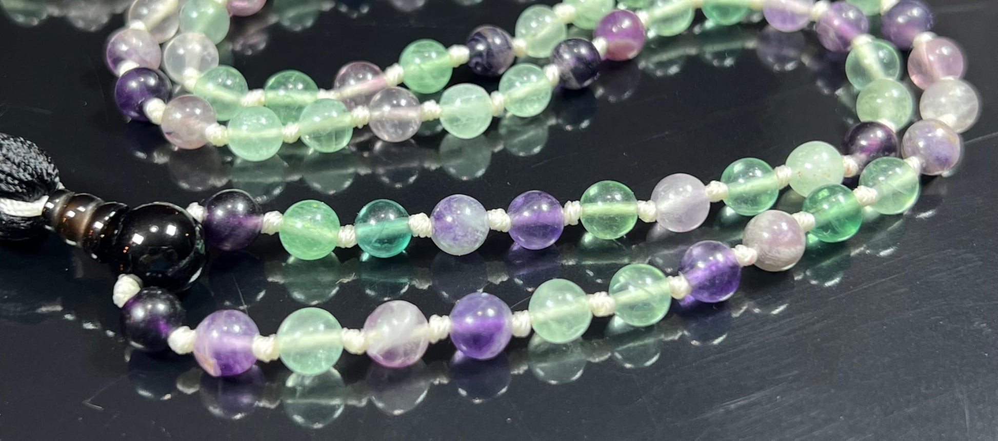 - Rainbow Fluorite, known for its captivating array of colors, is a stone associated with balance and clarity. As the birthstone for Pisces and a stone linked to Libra, this mala is particularly meaningful for individuals born under these signs. The connection to the Heart Chakra fosters emotional equilibrium, while the Third Eye Chakra association enhances clarity of thought and insight. The hand-knotted design ensures durability, making it a cherished & mindfulness in their spiritual practices.