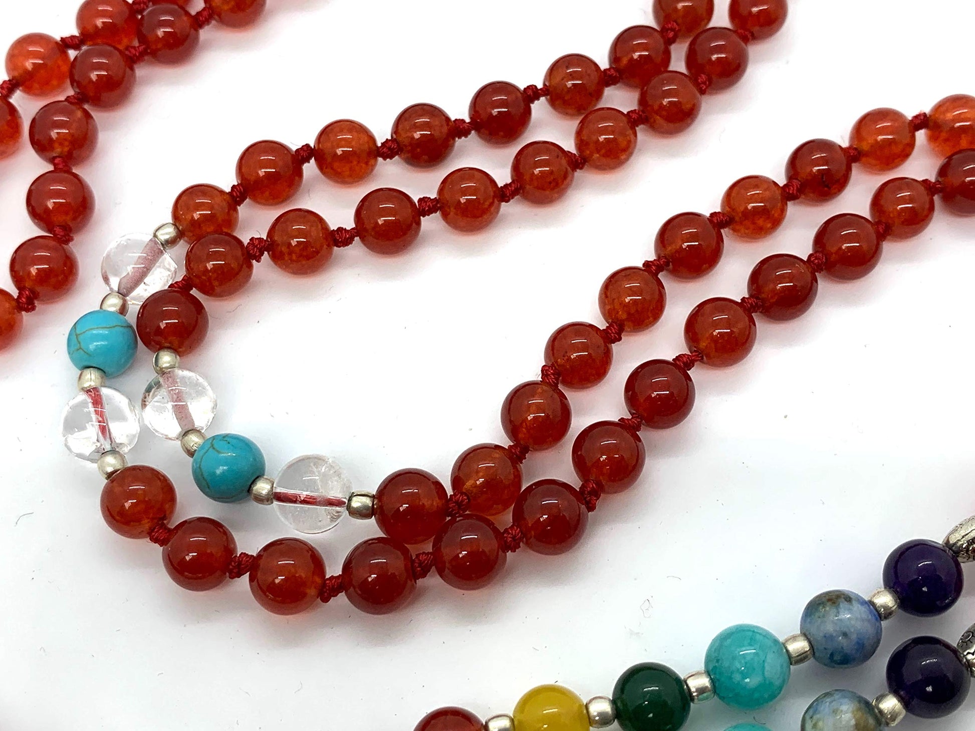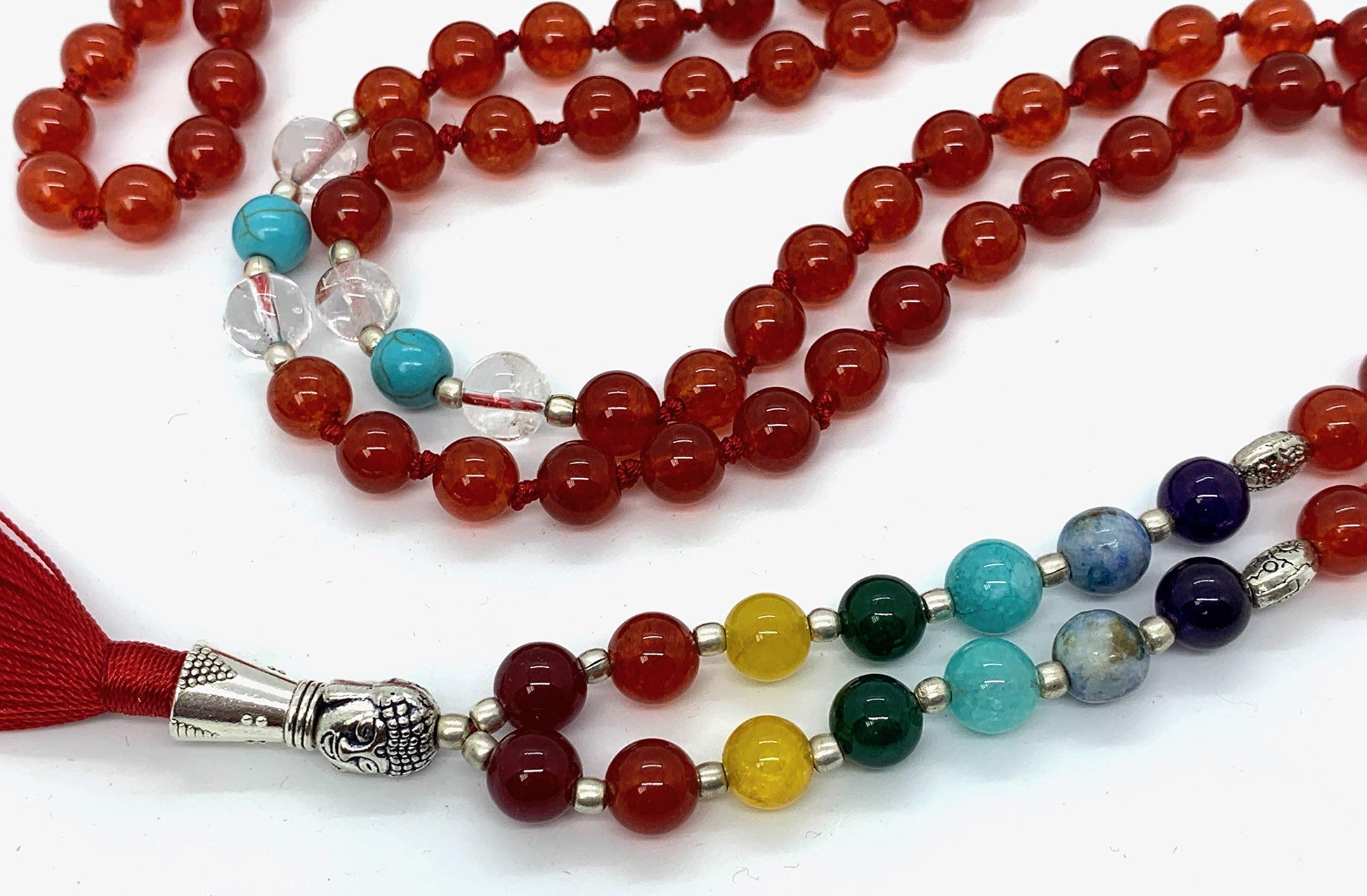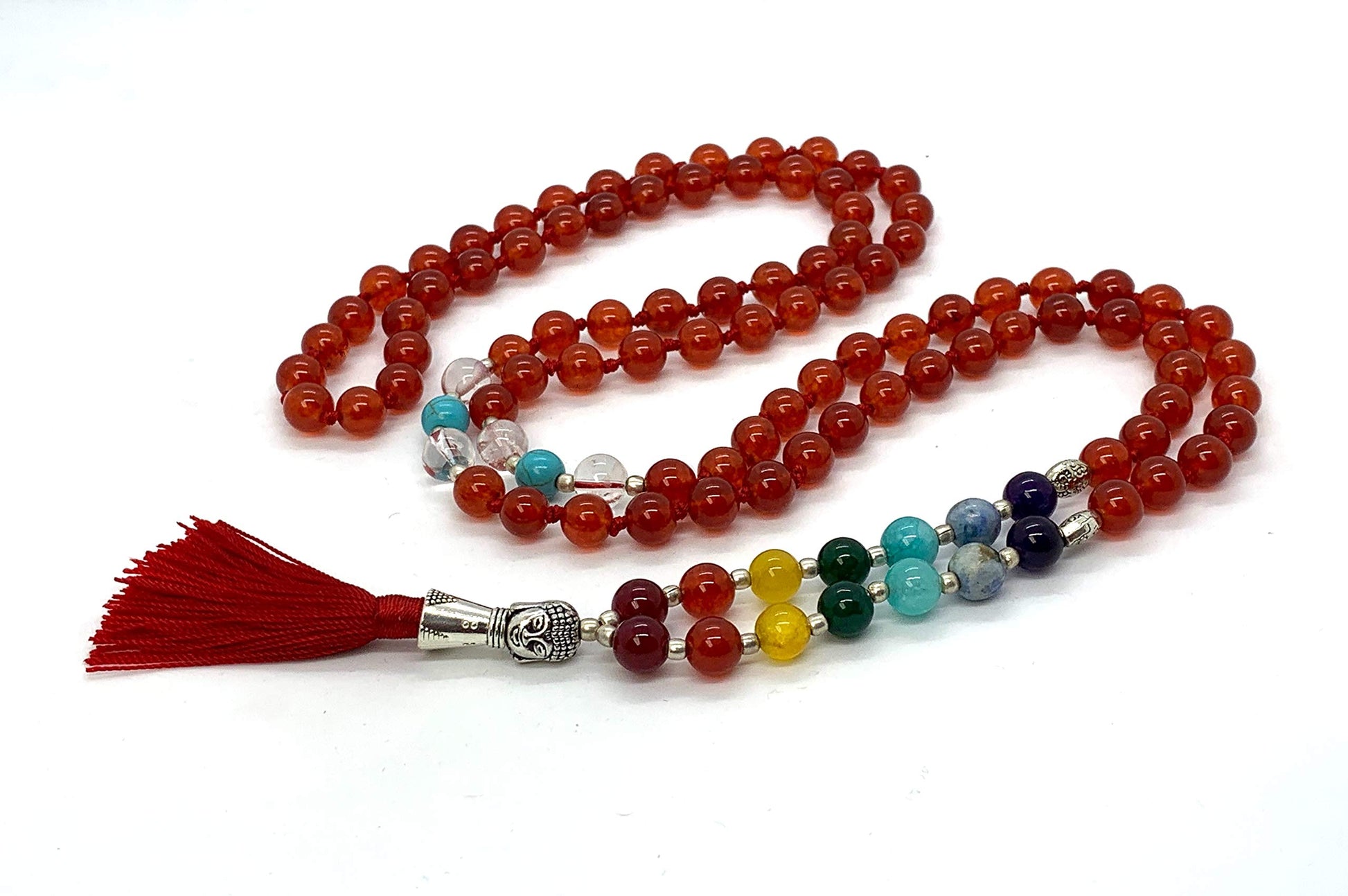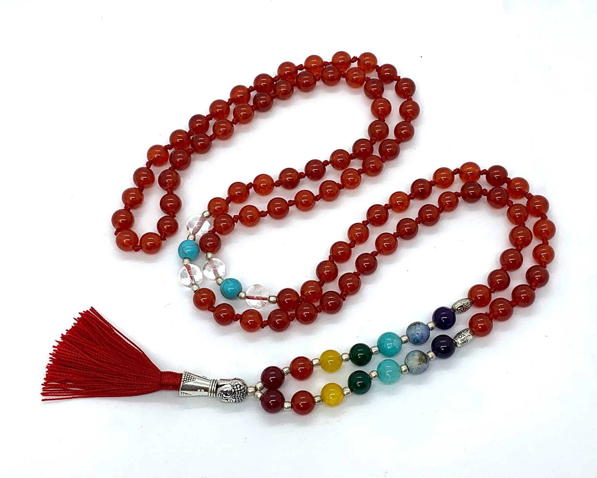 - Elevate your spiritual practice with our Hand Knotted 7 Chakra Red Carnelian Mala Necklace. This exquisite piece is meticulously crafted to combine the vibrant energy of Red Carnelian with the spiritual alignment of the seven chakras.
