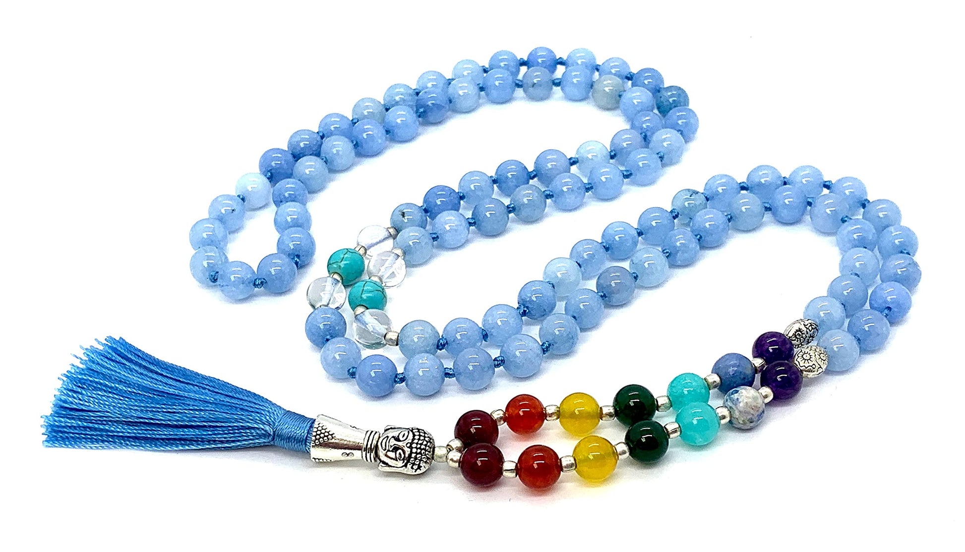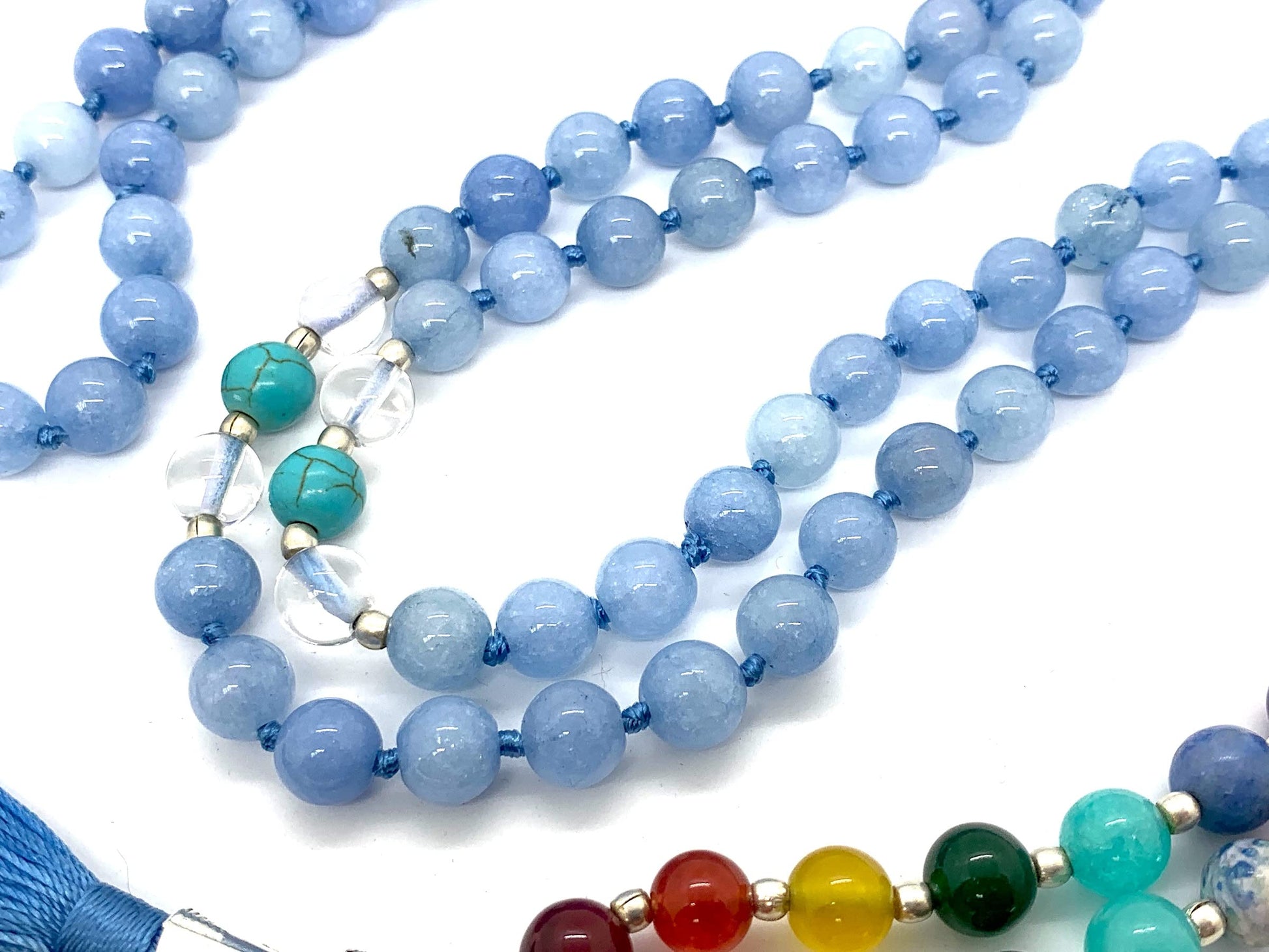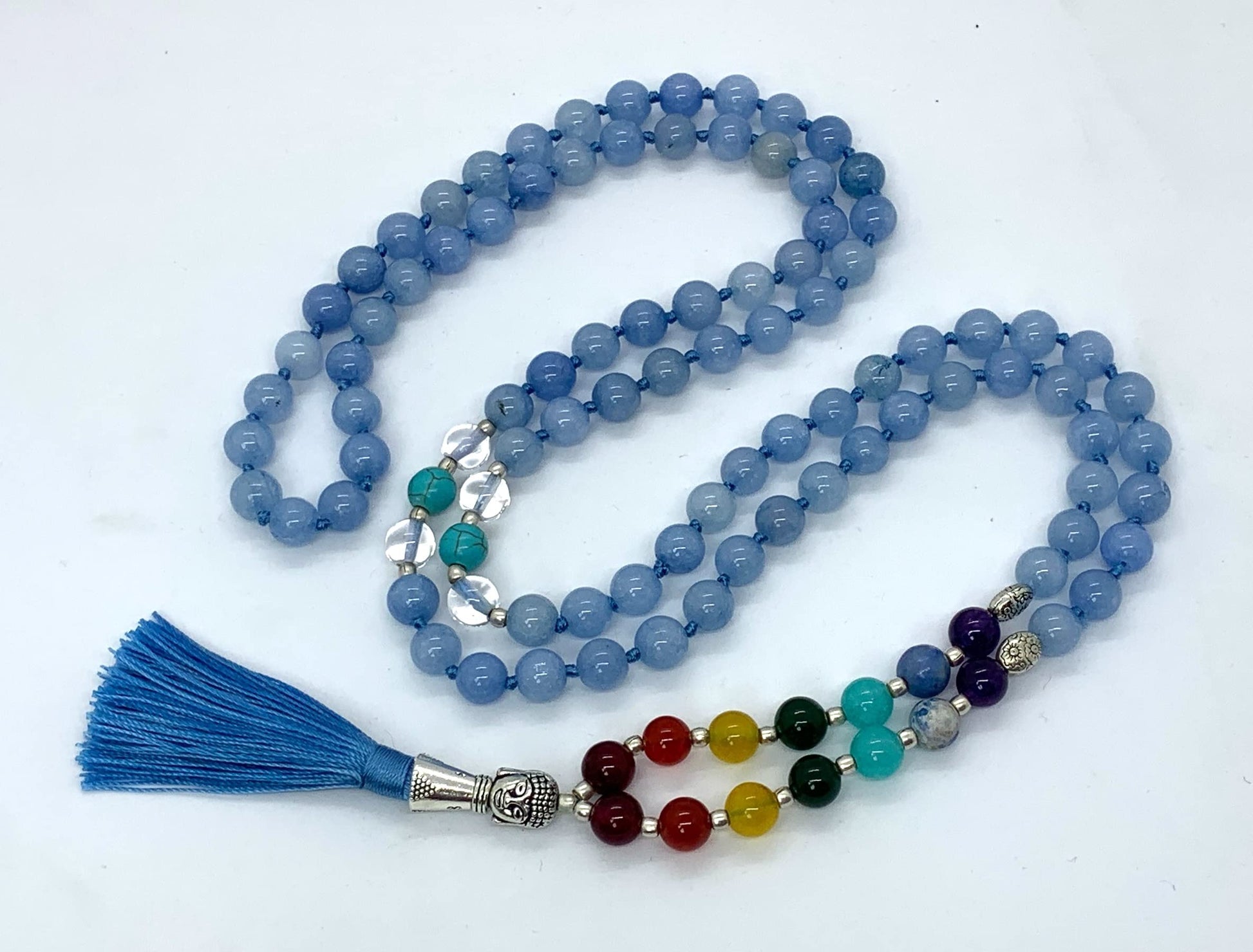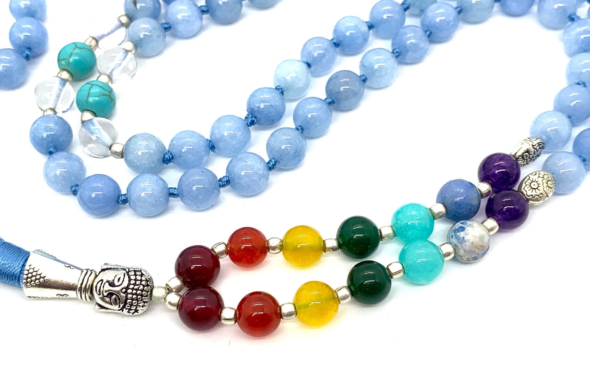 - Elevate your spiritual practice with our exquisite Hand Knotted 7 Chakra Sky Blue Jade Mala Necklace. Crafted with care and attention to detail, this stunning piece features 8mm beads and a Buddha guru bead made of zinc alloy, creating a harmonious blend of beauty and spiritual significance.