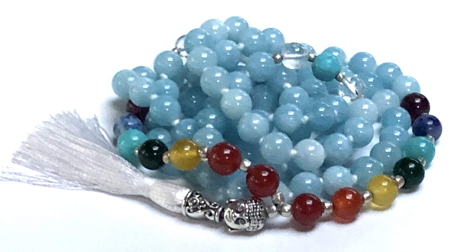 - Key Features: Type: Hand Knotted 7 Chakra Sky Blue Jade Mala Necklace Bead Size: 8mm Guru Bead: Buddha (Zinc Alloy) Birthstone: March (Sky Blue Jade) Astrological Sign: Pisces Chakra: Balancing All Seven Chakras Craftsmanship: Hand Knotted